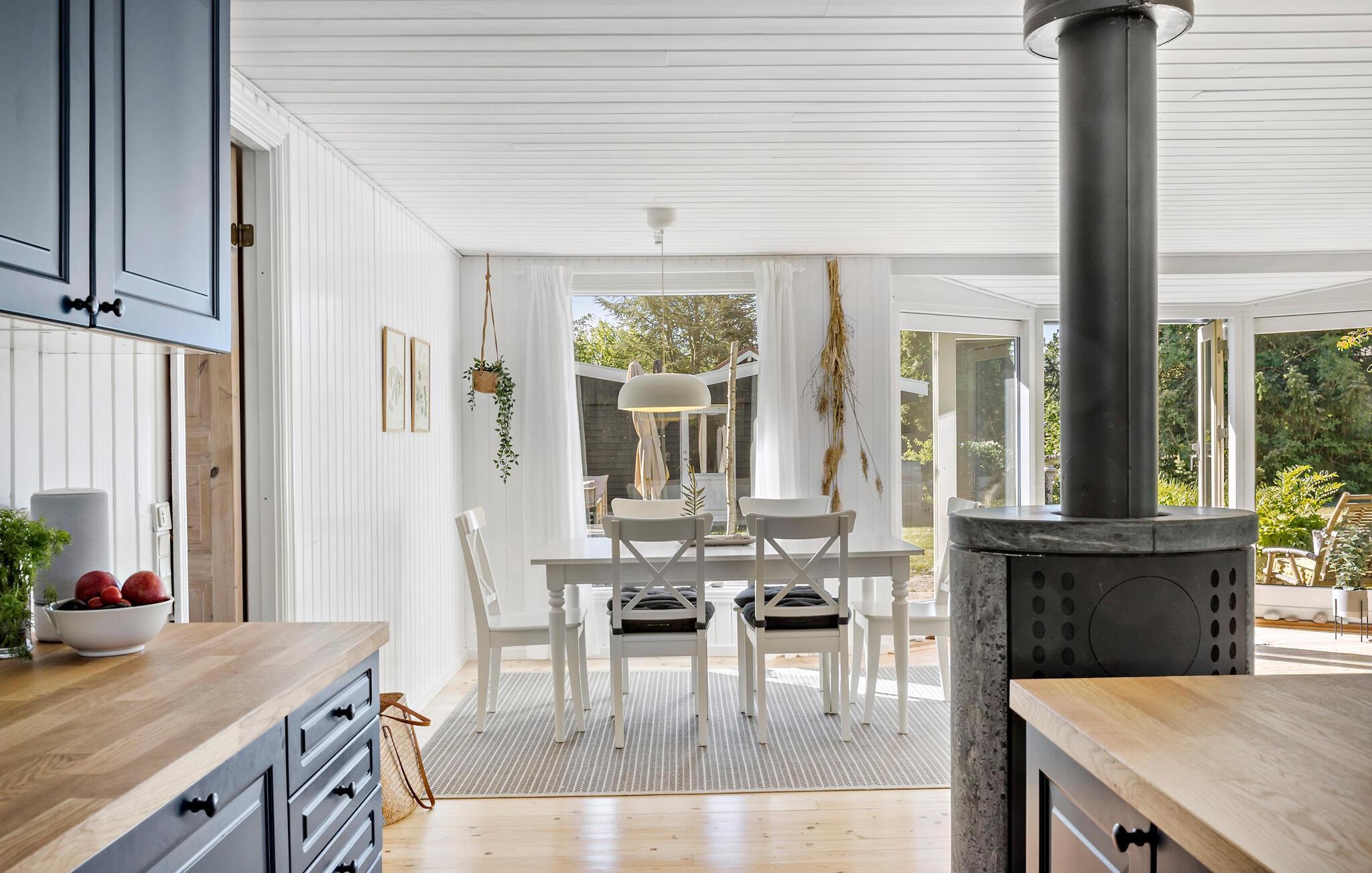 Velkommen til Dronningmølle og dette dejlige træhus, der ligger i gåafstand fra stranden og danner rammen om en dejlig ferie med familien. Udover hovedhuset er der sovepladser i annekset, så I kan rejse som en større flok og stadig nyde en god nattesøvn og lidt privatliv. Huset er flot indrettet med lyse træpaneler, åbent boligkoncept og lækre lysindfald gennem de store vinduespartier, der samtidig giver udsigt til haven. Hvis vejret bider lidt, er det bare at tænde op i brændeovnen, der giver varme og et knitrende lydtapet til madlavningen i det veludstyrede køkken og en god film i sofaen til langt ud på aftenen.
