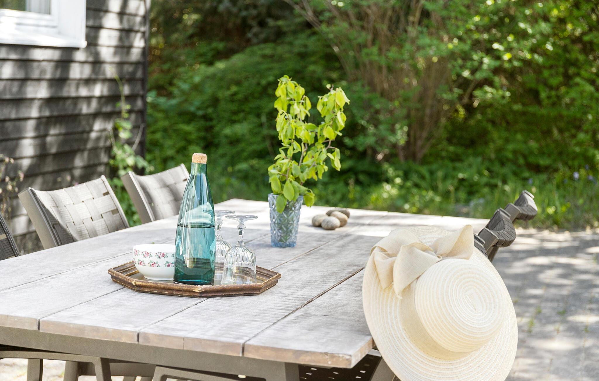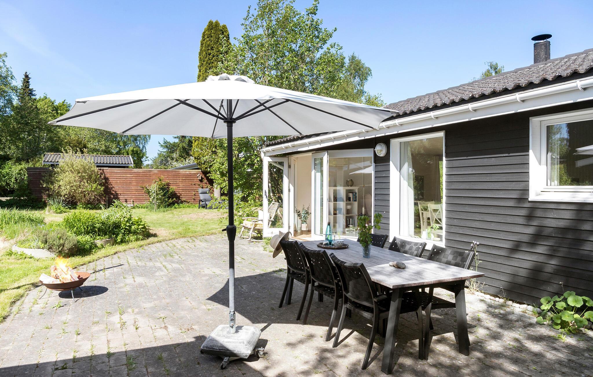 Til huset hører tre dejlige terrasser og en have med god plads til både sjov og afslapning, når vejret er godt. Nyd solen eller find skygge under parasollen og læs en god bog, inden I tager på tur.