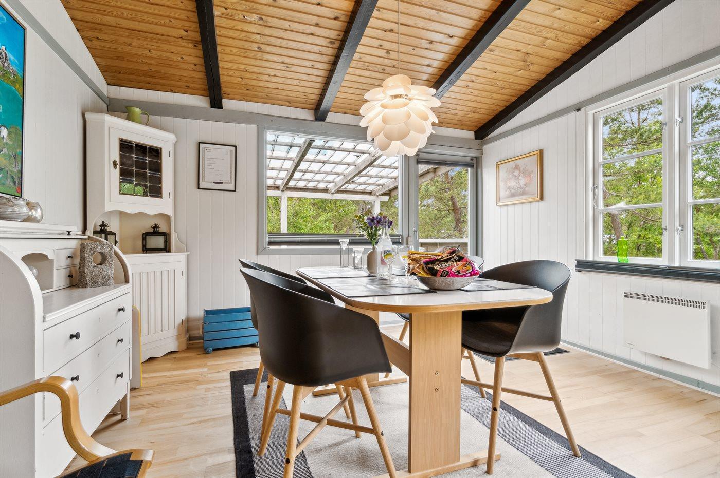 Den overdækkede terrasse giver læ og giver mulighed for at strække aftenerne i hyggeligt samvær. Den åbne terrasse er afskærmet af bevoksningen, så solen kan nydes i fred og ro.