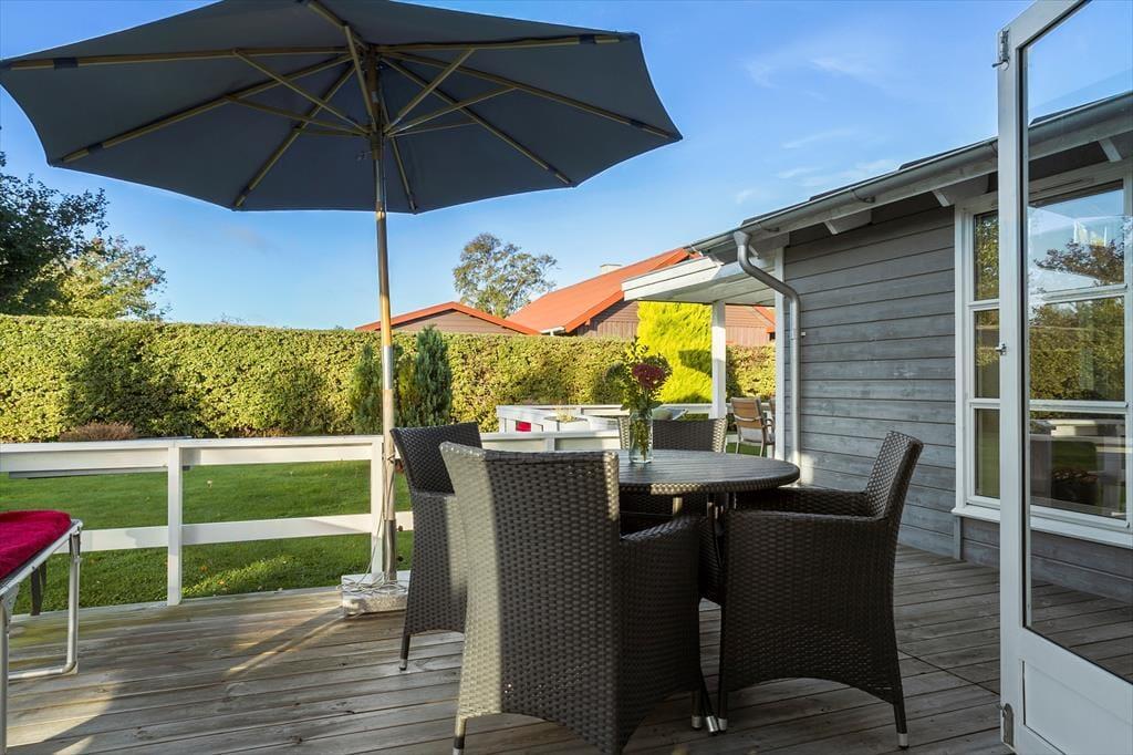 Haven er omgivet af 2 meter høj, tæt hæk og låger, hvilket gør, at ingen udefra kan kigge ind, så her kan du i fred og ro nyde din ferie. I haven er et nyt gyngestativ, legetårn og rutsjebane. Fra stuen er der udgang til en stor overdækket terrasse mod syd/vest – perfekt til en afslappende dag i skyggen eller en hyggelig grillaften. Terrassen er udstyret med havemøbler og kulgrill. Derudover er der en åben terrasse mod øst samt en udendørs bruser.