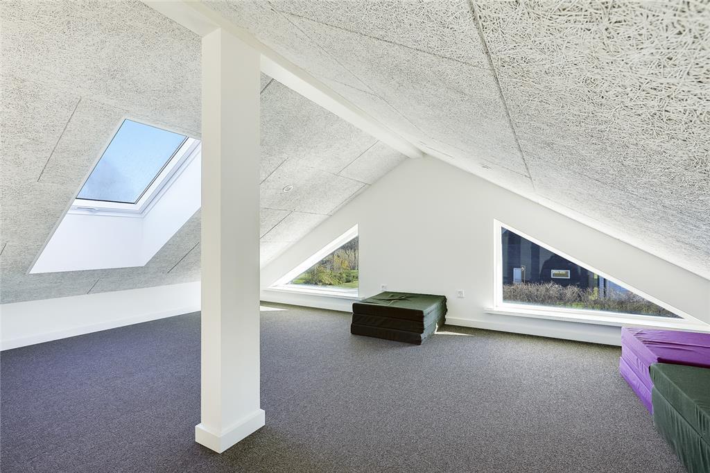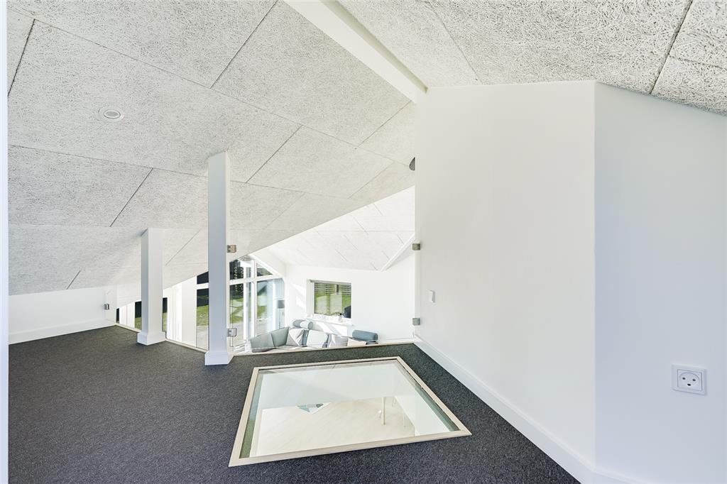 Stuen er stor, lys og venlig med loft til kip og vinduesparti fra gulv til loft. Fra stuen er der udgang til stor terrasse. I stuen er der også brændeovn til at hygge sig omkring på en kold sommeraften. Desuden har huset varmepumpe samt el-radiatorer til opvarmning.