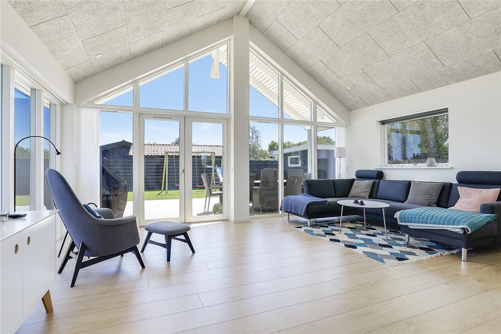Beliggende kun 100 meter fra vandet finder man dette flotte sommerhus fra 2017 med havudsigt.