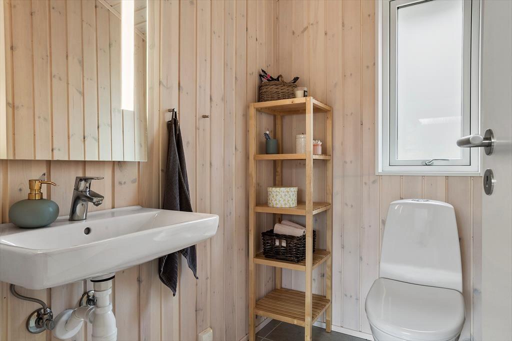 Huset har et flot badeværelse med toilet, brus og fin lille sauna. Der er i øvrigt et gæstetoilet i sommerhuset.