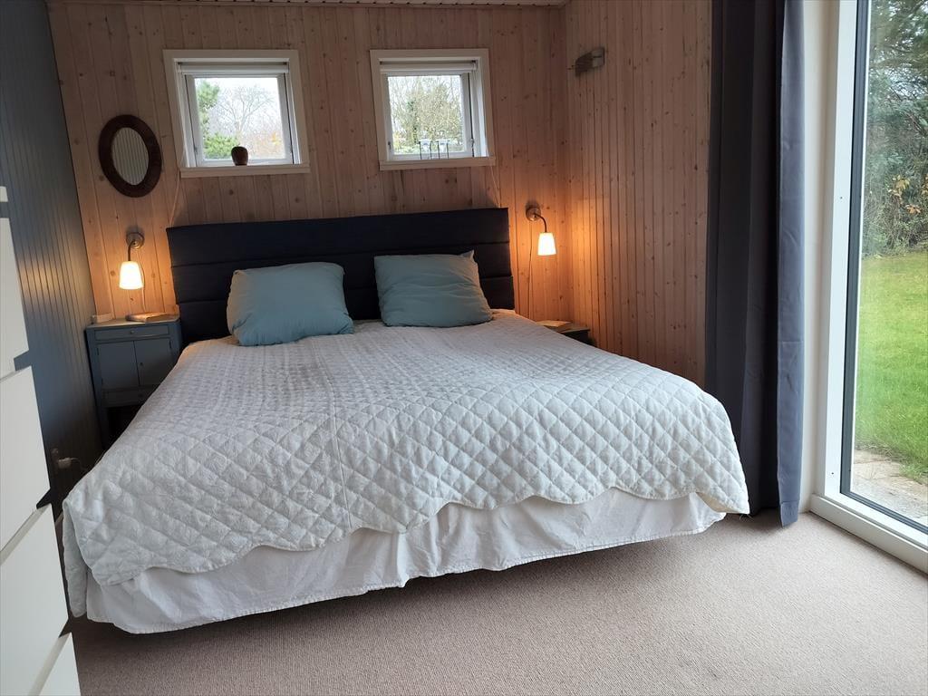 I modsatte hjørne af stuen/køkken alrummet er det andet soveværelse, hvor en dobbeltseng er placeret med kig til store, sydvendte gulv til loft vinduer. Dette soveværelse emmer af sommerhushygge og forbindelse med naturen, da en glasdør giver udgang til haven. Udover en komfortabel dobbeltseng er der også god opbevaringsplads. Det sidste soveværelse er i et anneks, der er forbundet med entréen og resten af huset. Dette værelse har en dobbeltseng på 140 x 200 cm, samt opbevaringsplads og et skrivebord. Som i husets andre soverum er her også dejlige vinduer og gulvtæppe.