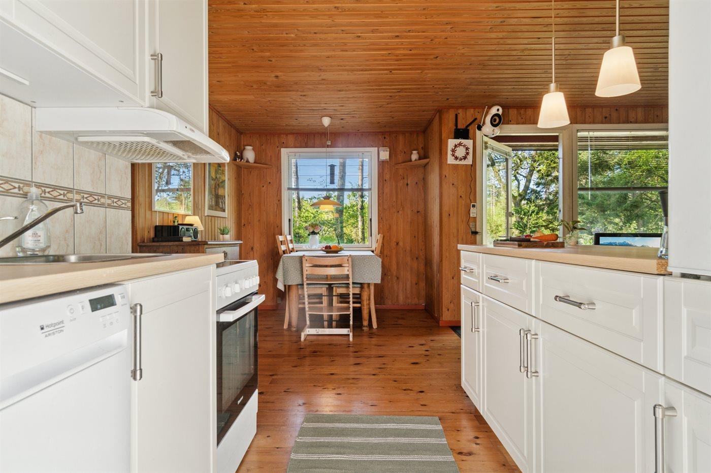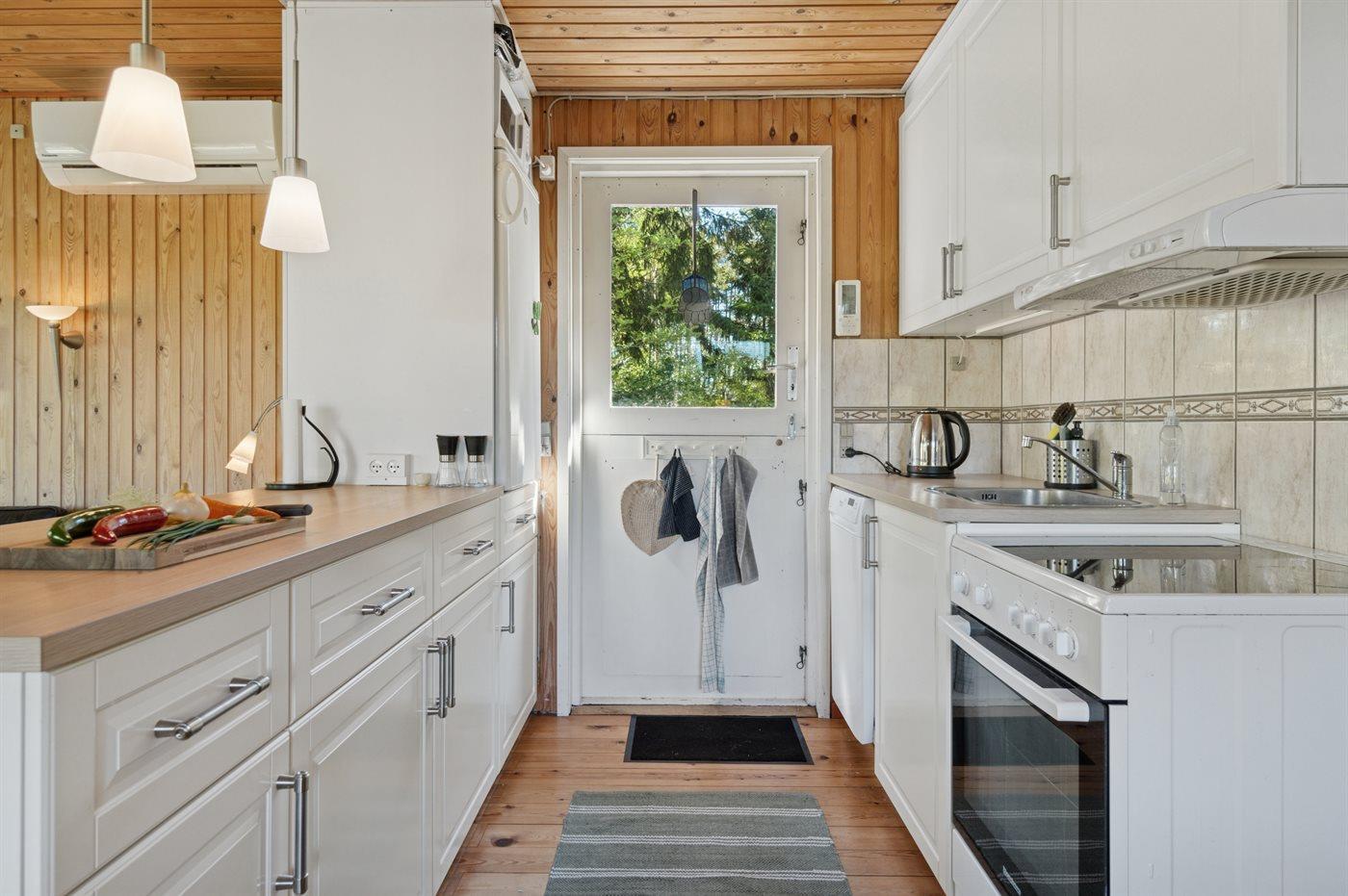 Køkkenet er udstyret med 1 køleskab. Der er 4 keramiske kogeplader, varmluftovn, mikrobølgeovn samt opvaskemaskine.