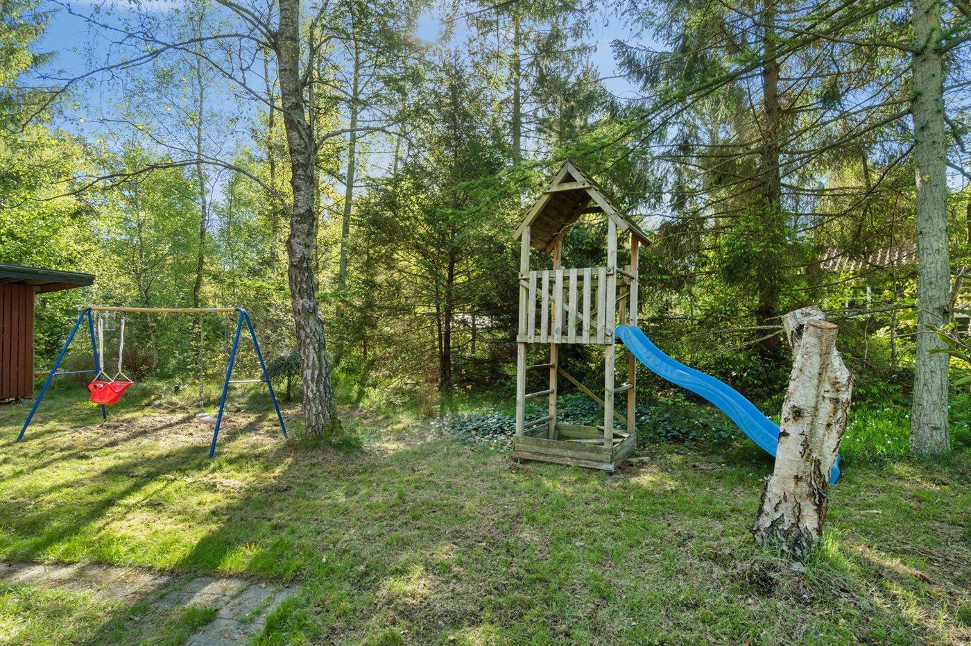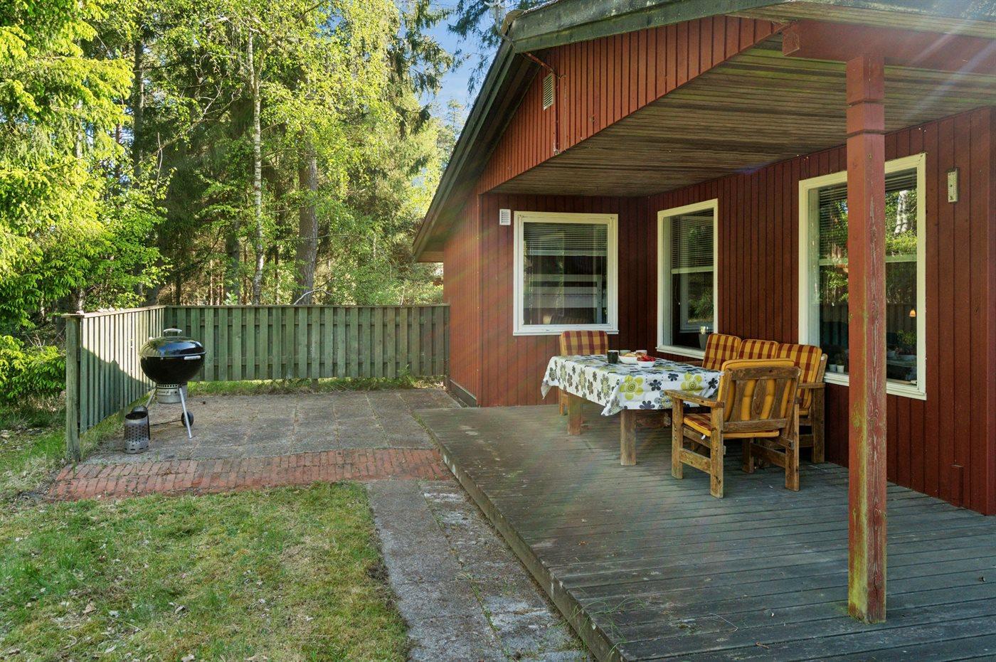 Ferieboligen er beliggende på en 1200 m² stor naturgrund. Der er 5000 m til havet. Nærmeste forretning er beliggende i en afstand af 3000 m. Der er en golfbane i en afstand af 10000 m. Til ferieboligen hører åbent terrasseareal. Desuden er der overdækket terrasse. Gynge. Sandkasse. Legetårn. Bålsted. Grill til rådighed. Der er installeret stik til opladning af elbil. Type 2 stik. Med 11 kW ladeeffekt. Parkering ved ferieboligen.