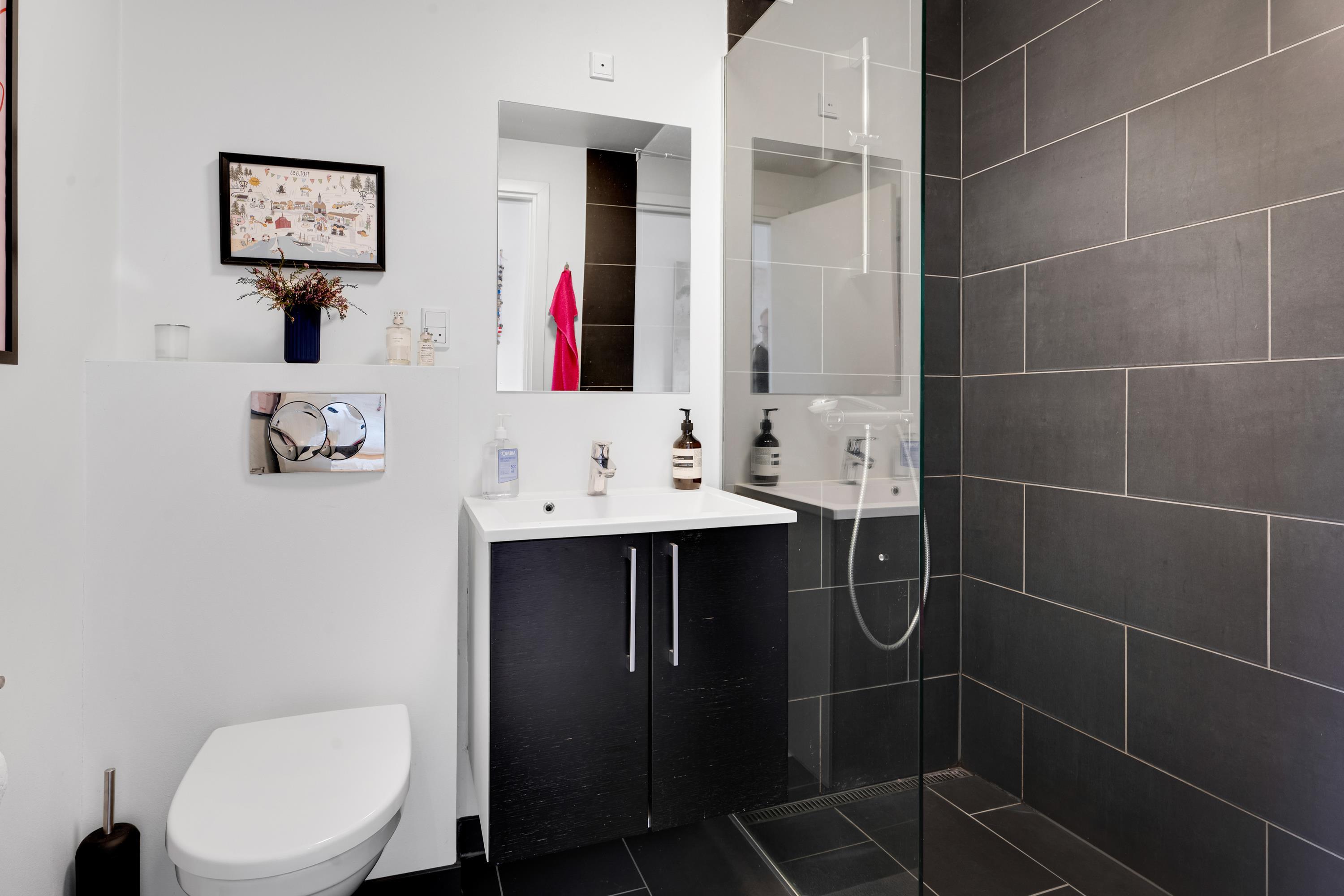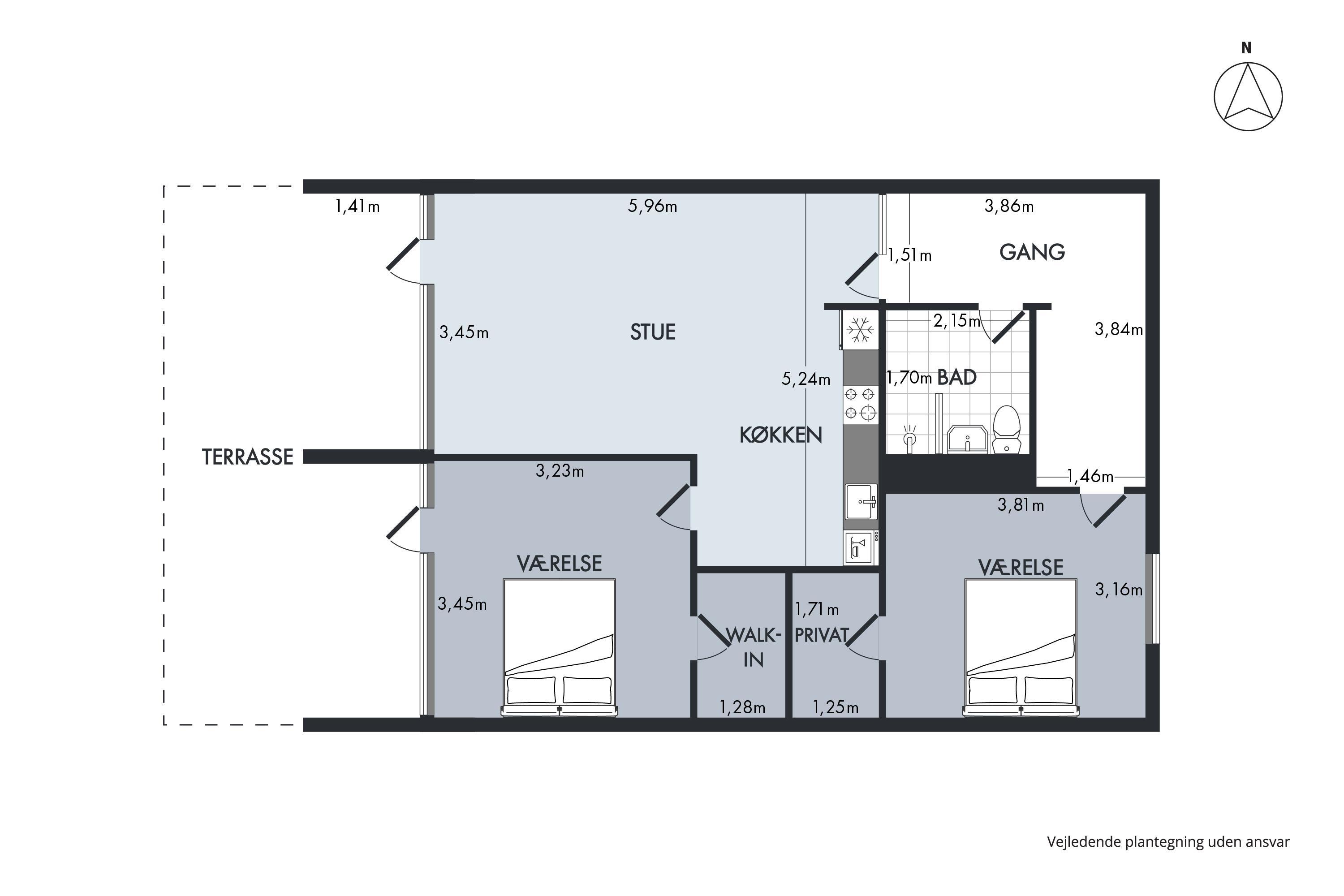 Rummelig entré med indgang til lys, velmøbleret stue med udgang til terrasse, god spiseplads til 4 personer, sofamøblement og TV med danske (inkl. TV2) og tyske kanaler. I åben forbindelse med stuen finder man nyere, stilrent køkken med komfur med keramiske kogeplader og ovn, stort køle-/fryseskab og opvaskemaskine. Med indgang fra stuen ligger et dejligt soveværelse med dobbeltseng og udgang til terrasse, og fra entreen er der indgang til stort, lyst soveværelse med dobbeltseng, i alt 4 sovepladser. Enkelt, gennemført badeværelse med bruseniche og gulvvarme. Der er internetadgang.