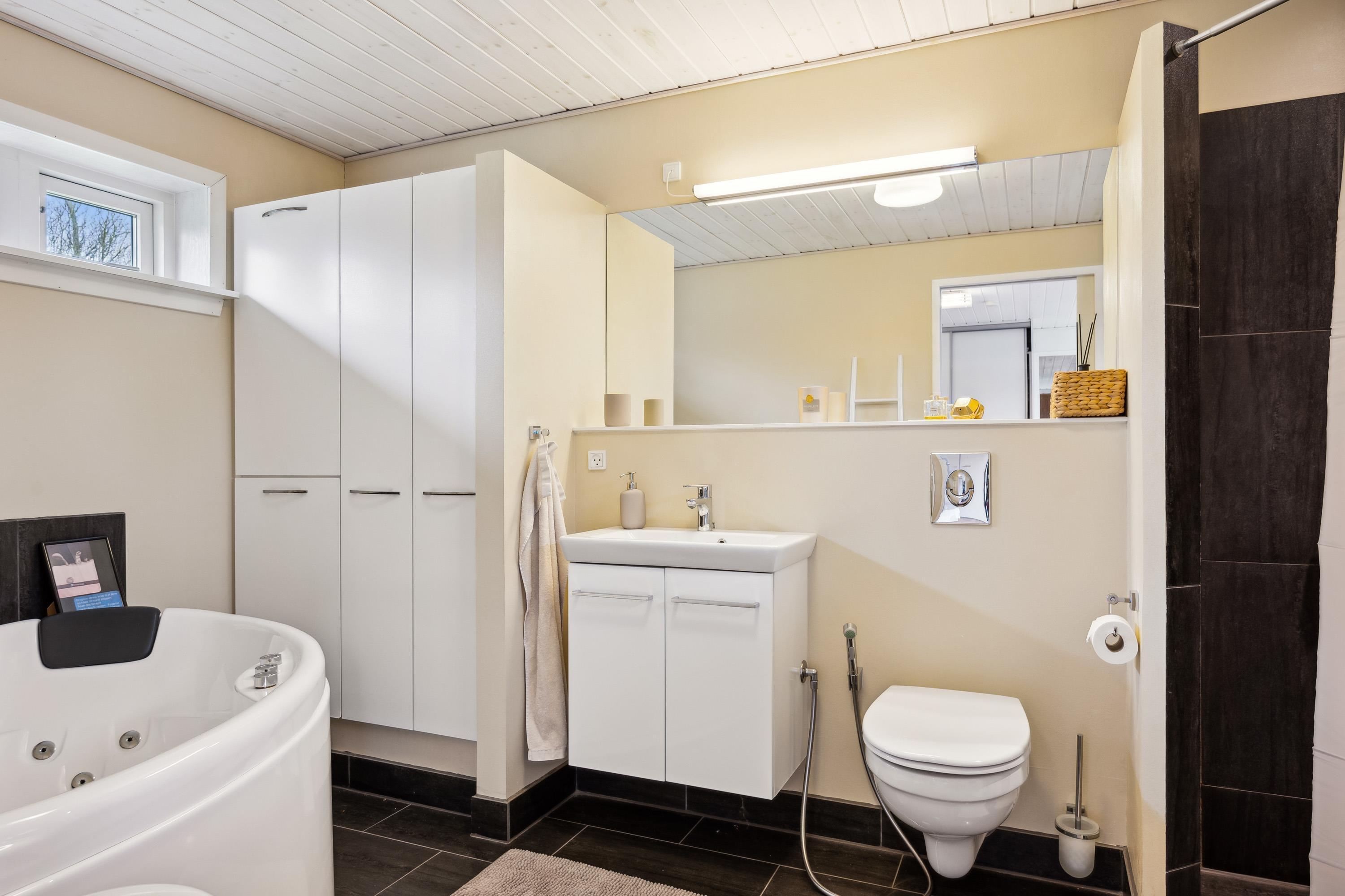 Fra den store, lyse opholdsstue er der udgang til terrasse via skøn udestue med fuldt glasparti til terrassen. Stuen rummer spiseafdeling til 6 personer, godt sofamøblement og lænestole, radio samt fladskærms-TV med chromecaster – bemærk, at der ingen kanaler er tilkoblet, alt indhold skal streames fra PC eller andet medie. Det nyere, velindrettede køkken med god arbejdsplads ligger i åben forbindelse med stuen og har keramiske kogeplader, ovn, køle-/fryseskab og opvaskemaskine. Husets 6 sovepladser fordeler sig på 1 stort, lyst soveværelse med dobbeltseng og udgang til terrasse, samt 2 soveværelser med henholdsvis en dobbelt sovesofa og en 3/4 seng (140x200) af god kvalitet. Stort, lækkert badeværelse med bruseniche, spabad, vaskemaskine og tørretumbler samt mindre badeværelse med bruseniche. Der er gulvvarme i begge vådrum. Internetadgang.