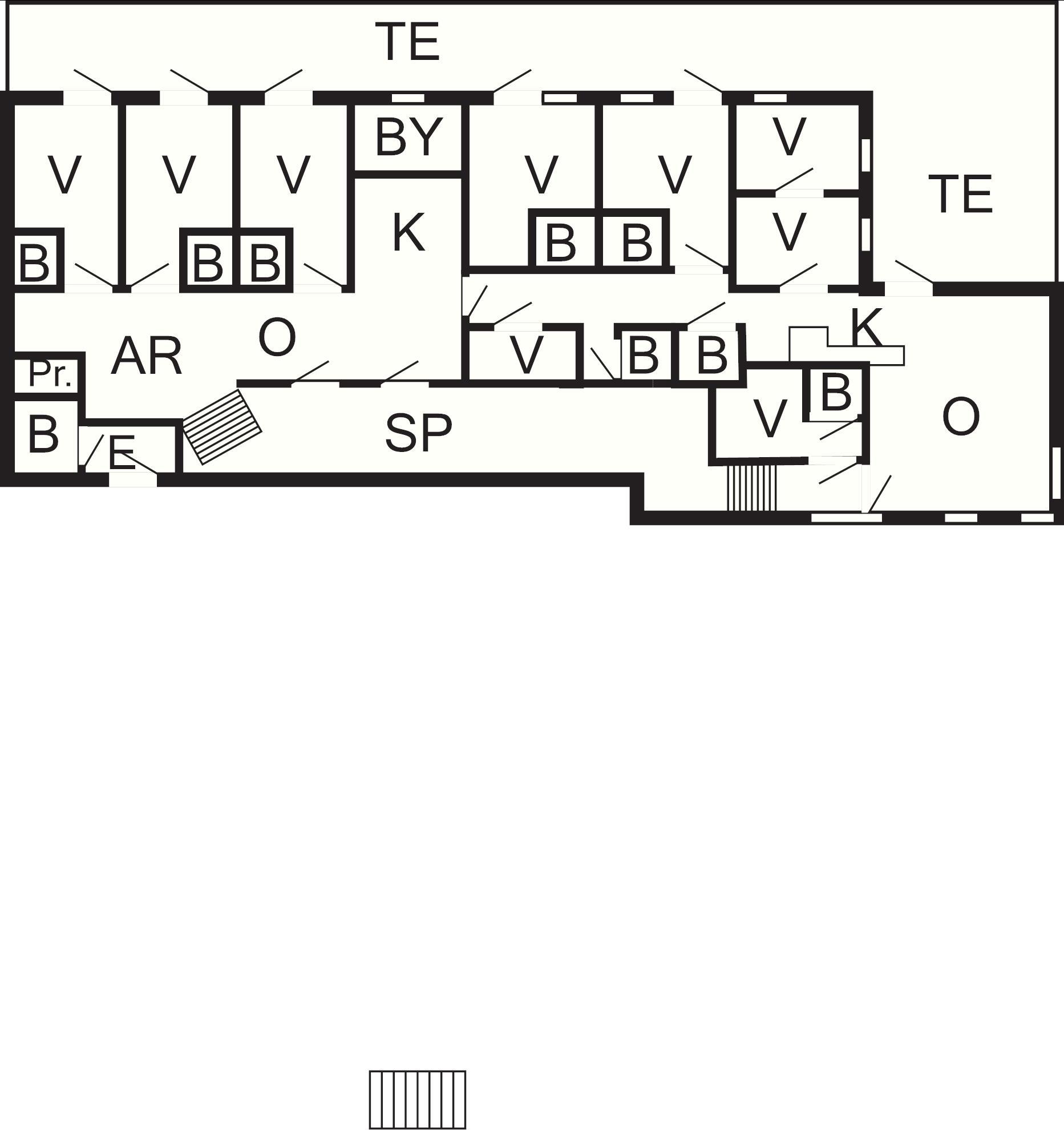 9 Soveværelser: (1DS)+(1DS)+(1DS)+(1DS)+(1DS)+(1DS)+(2K+1O)+(2K)+(2S+1K), barneseng