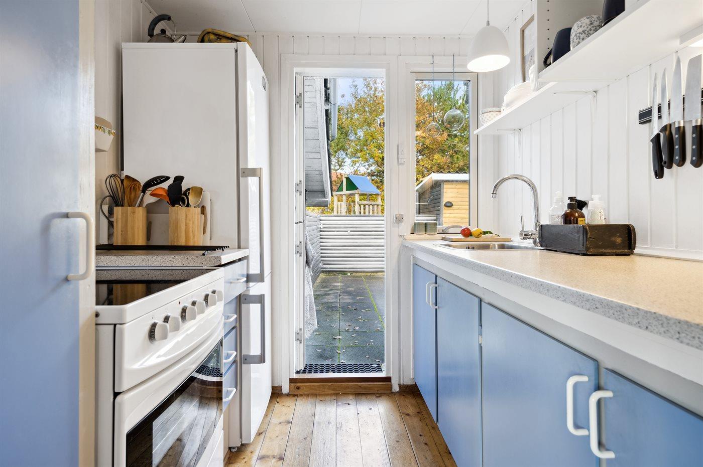 Køkkenet er udstyret med 1 køleskab. Der er 4 keramiske kogeplader, varmluftovn, mikrobølgeovn.