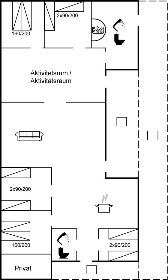 Huset er skønt indrettet og har en planløsning, der er ideel således flere familier kan holde ferie sammen uden at skulle dele soveværelsesvæg og badeværelse. Der findes 5 gode soveværelser med gode senge og 2 flotte badeværelser med god plads.