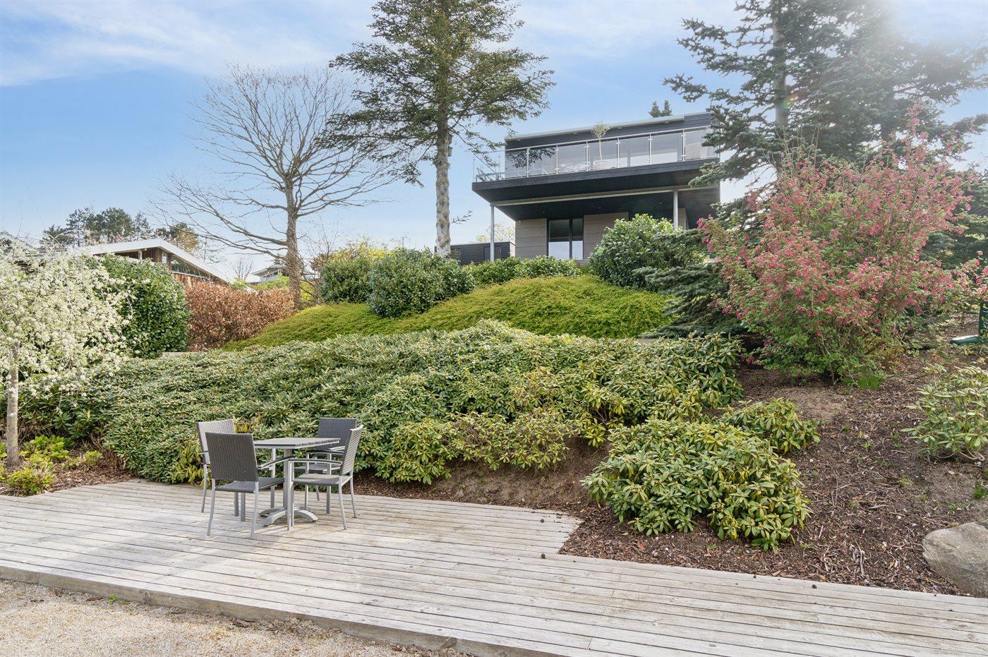 Ferieboligen er beliggende på en 1200 m² stor naturgrund. Der er 600 m til havet. Nærmeste forretning er beliggende i en afstand af 2000 m. Til ferieboligen hører åbent terrasseareal. Desuden er der overdækket terrasse. Der er redskabsrum. Gynge. Rutchebane. Grill til rådighed. Der er installeret stik til opladning af elbil. Type 2 stik. Med 11 kW ladeeffekt. Parkering ved ferieboligen.