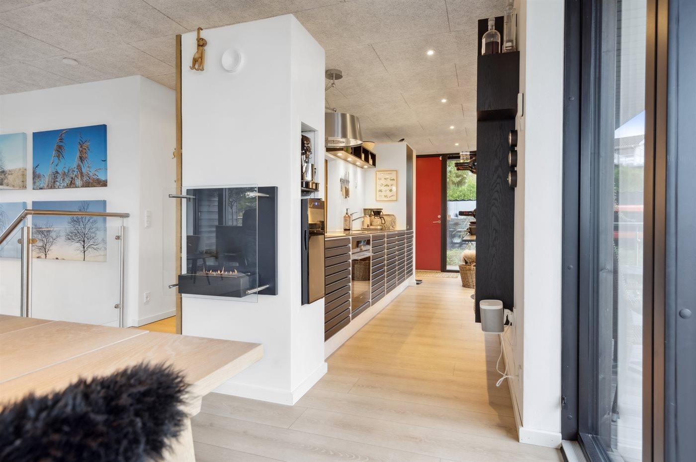 Køkkenet er udstyret med 2 køleskabe. Der er 4 induktionskogeplader, varmluftovn samt opvaskemaskine.