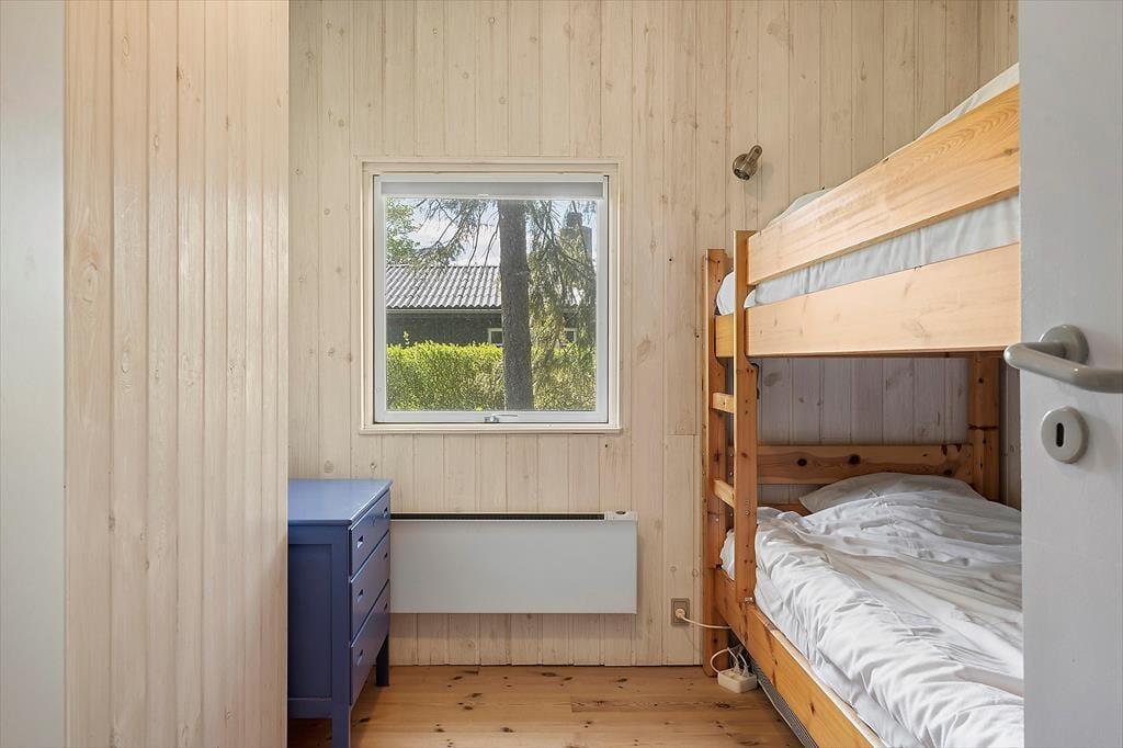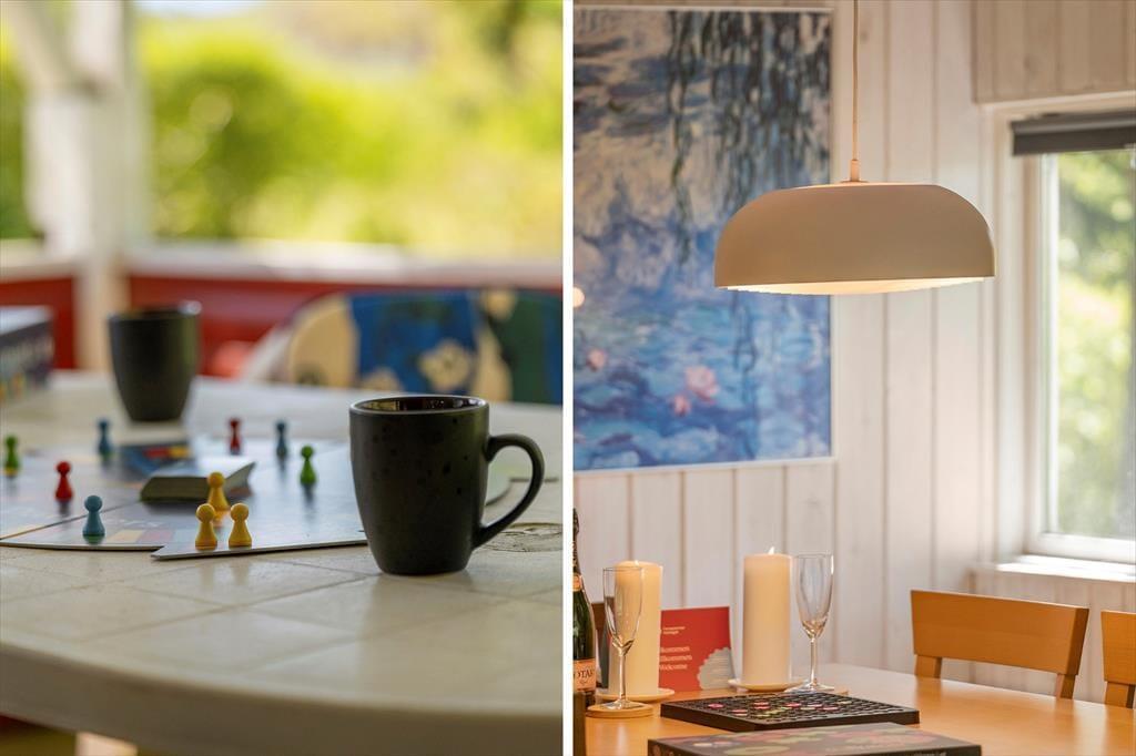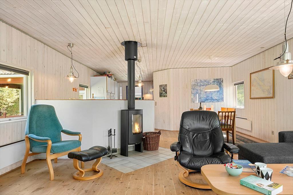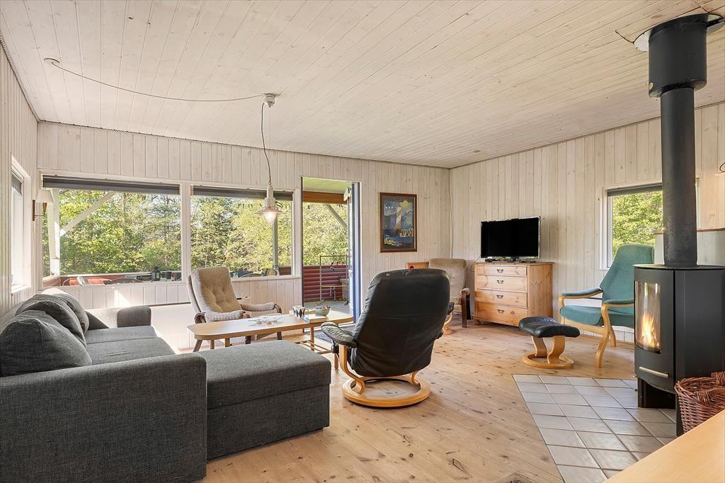 Allerede når du træder ind i huset på Glentevej 5, bliver du mødt af en varm og hjemlig atmosfære. Indretningen er præget af klassisk sommerhusstil med træbeklædte vægge og lofter, bløde møbler og et naturligt lysindfald, der inviterer til ro og nærvær. Her er plads til at være sammen – om det så er over et kortspil ved spisebordet, en god film i sofahjørnet eller madlavning i det åbne køkken, hvor samtalen nemt fortsætter, mens gryderne simrer. Det er let at forestille sig en gråvejrsdag, hvor brætspillene bliver fundet frem, og duften af nybagt kage breder sig i huset. Når dagen går på hæld, kan du trække dig tilbage i rolige soveværelser og glæde dig til endnu en dag i afslappet ferietempo.