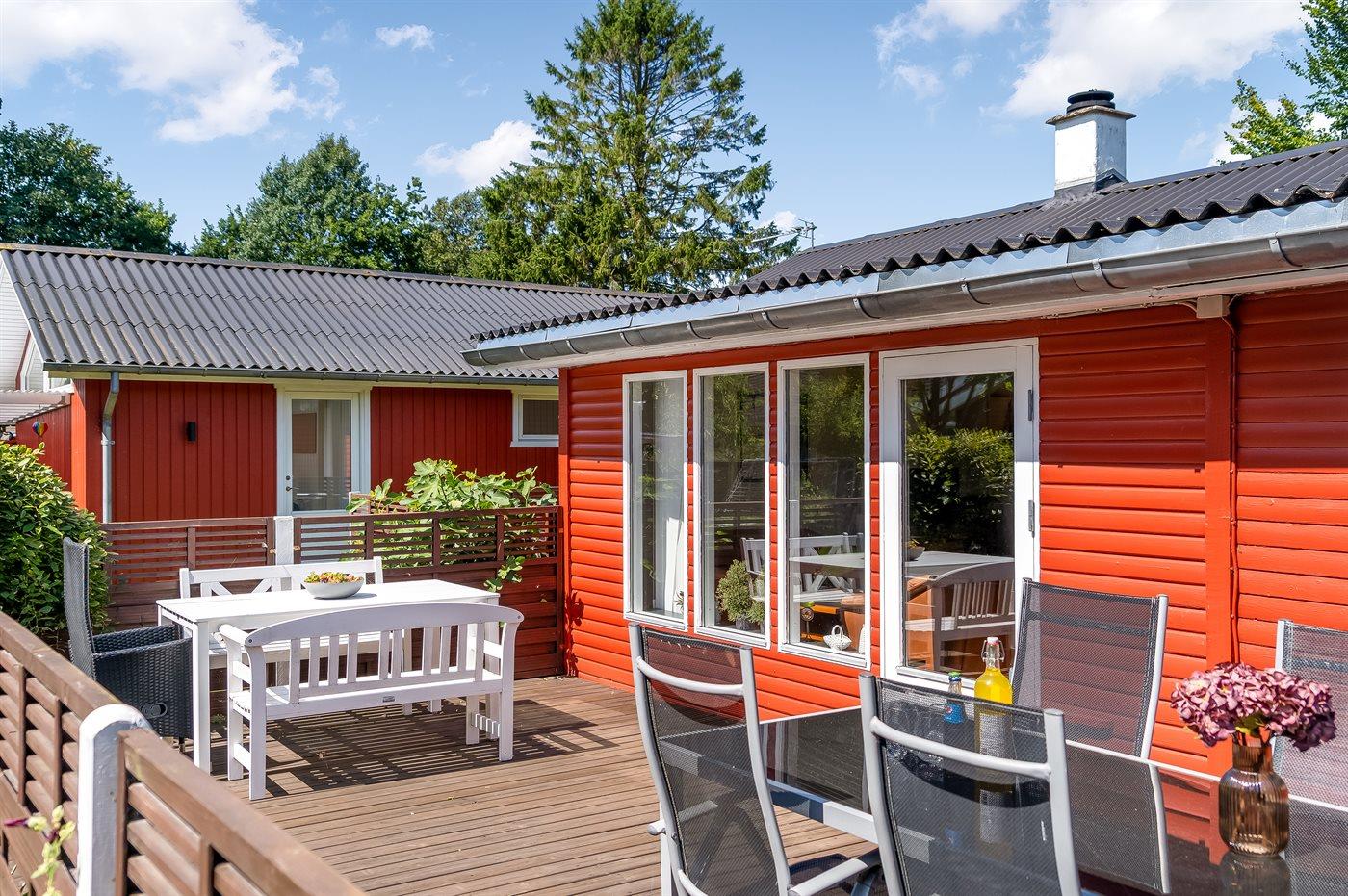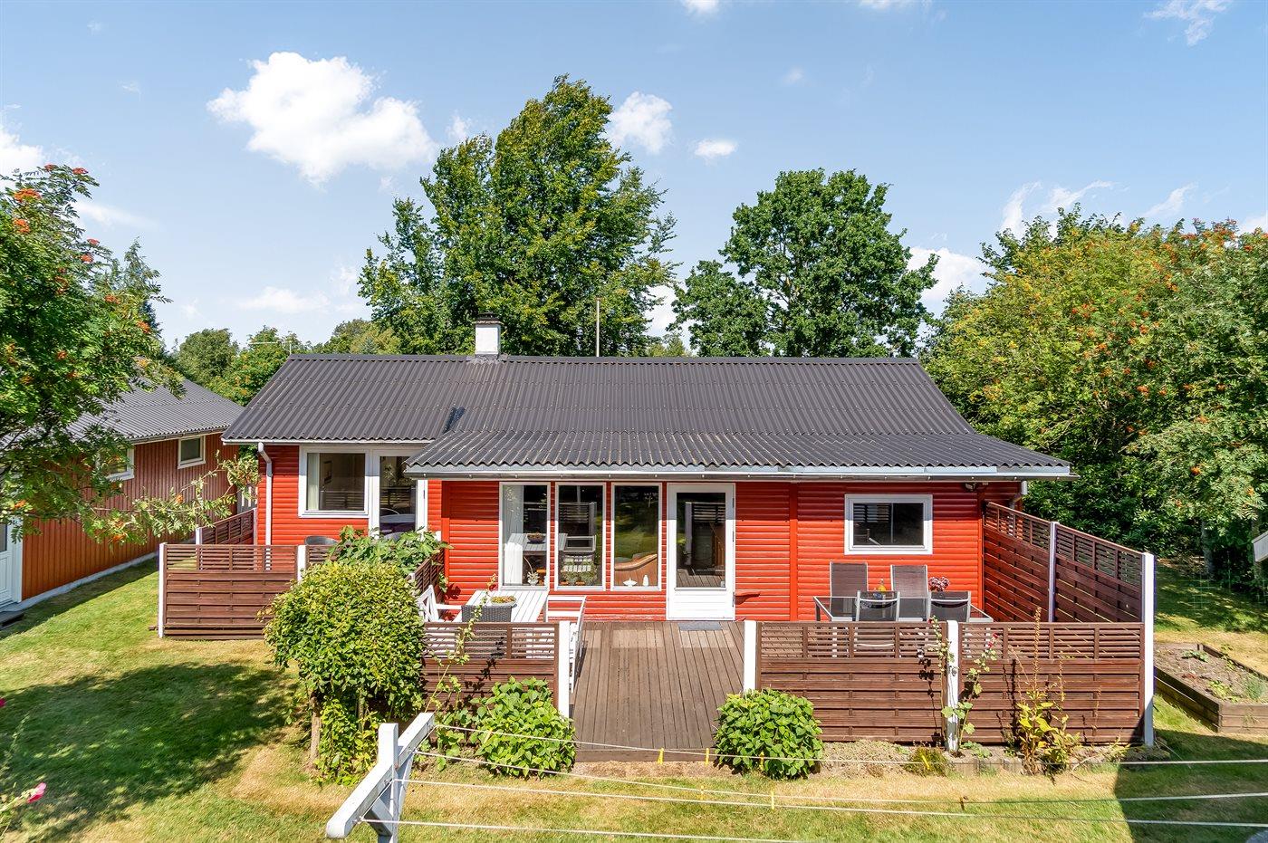 Ferieboligen er beliggende på en 1230 m² stor havegrund. Grunden er indhegnet. Der er 1300 m til havet. Der er 500 m til fjorden. Nærmeste forretning er beliggende i en afstand af 300 m. Der er en golfbane i en afstand af 3100 m. Til ferieboligen hører åbent terrasseareal. Desuden er der overdækket terrasse. Trampolin. Grill til rådighed. Parkering ved ferieboligen.