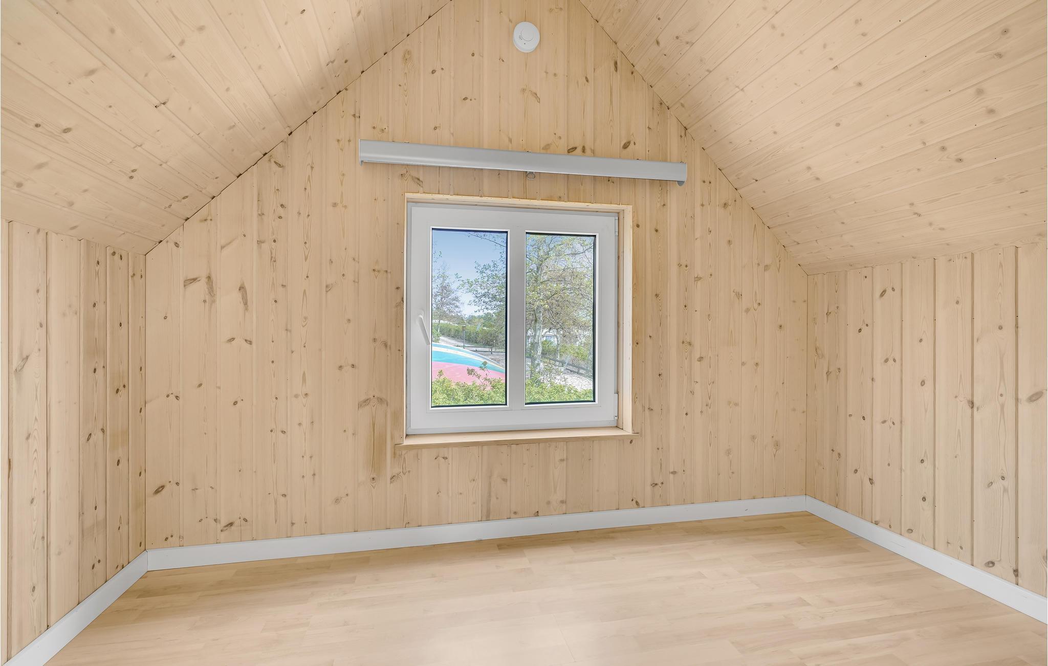 Hyggeligt træhus tæt på stranden med havudsigt, fælles pool og legeplads for en afslappende familieferie.