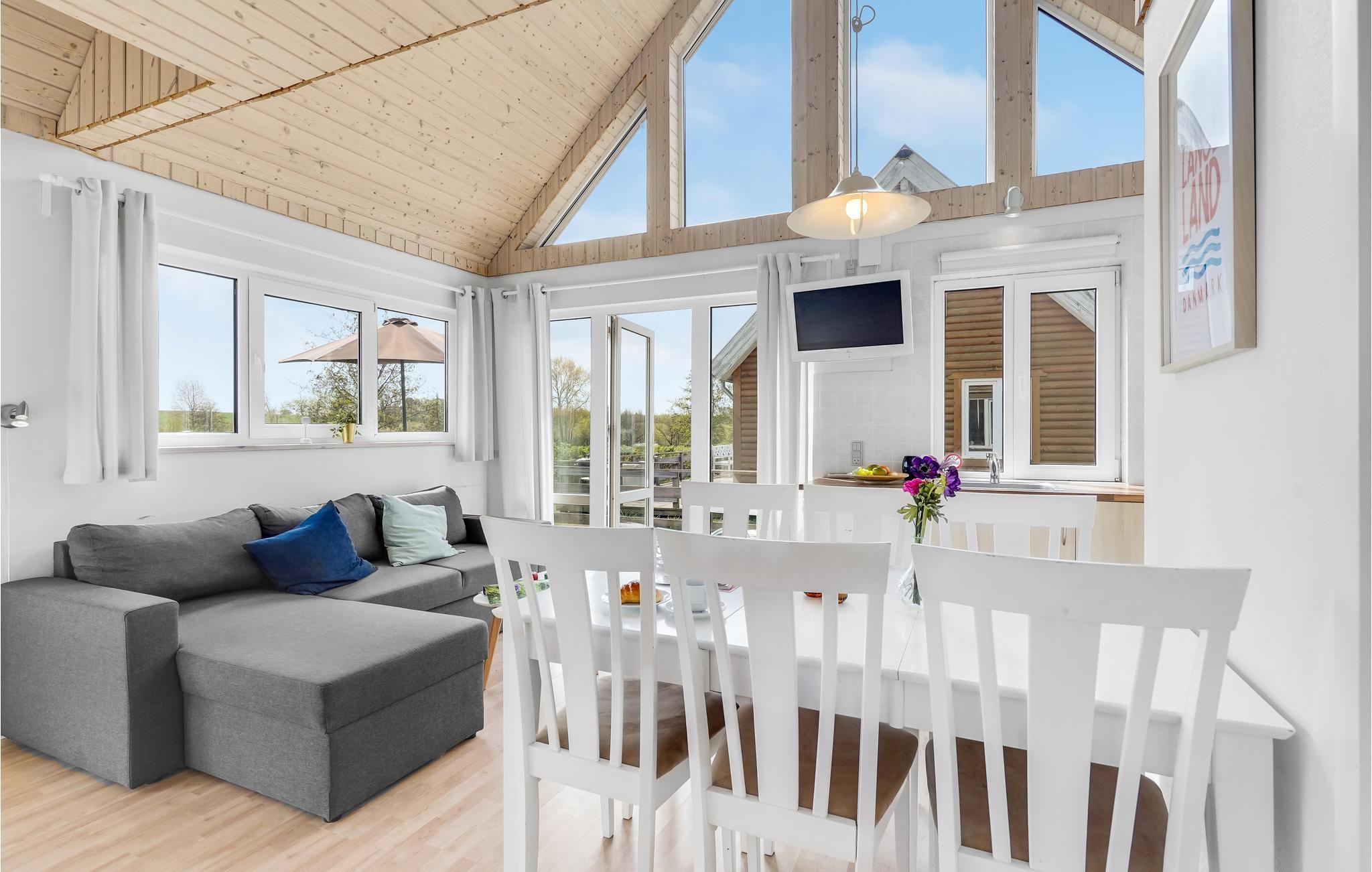 Hyggeligt træhus tæt på stranden med havudsigt, fælles pool og legeplads for en afslappende familieferie.
