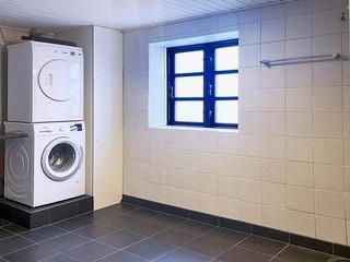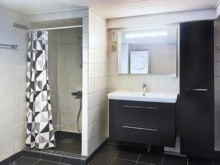 Badeværelse med bruseniche, håndvask, toilet, vaskemaskine og tørretumbler.
