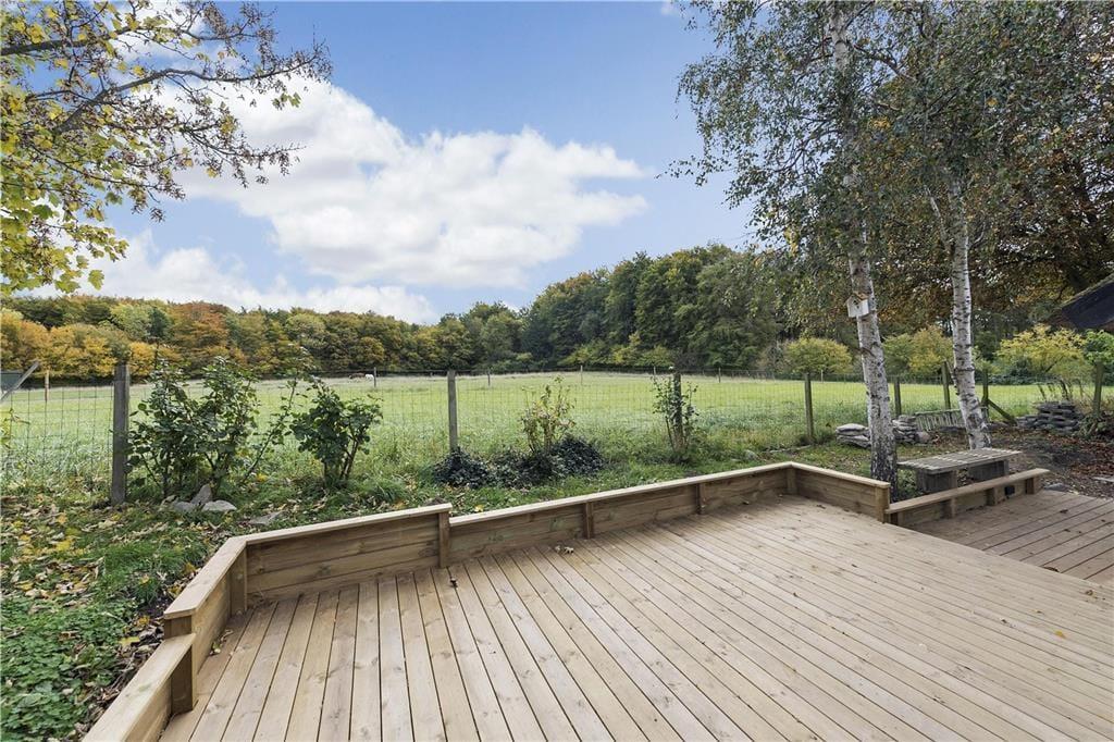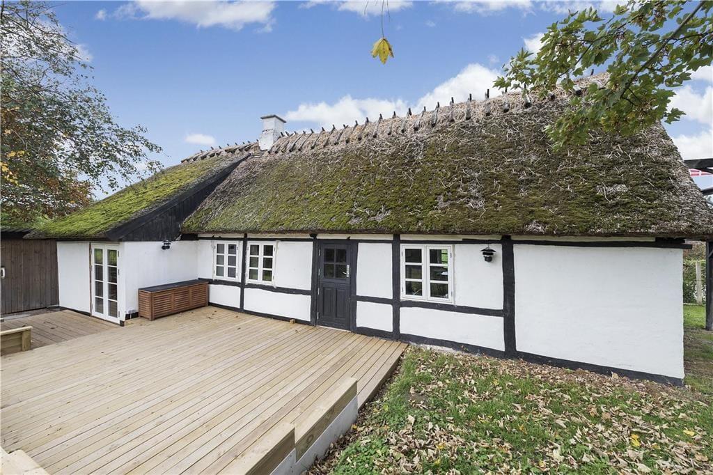 I huset er der: Entré med klinker, dejlig lys stue med sofahjørne og TV (kun Chromecast) og internet. Hyggelig Morsø brændeovn. Dobbelt glasdør ud til en skøn østvendt træterrasse på 20m2 med gode havemøbler.