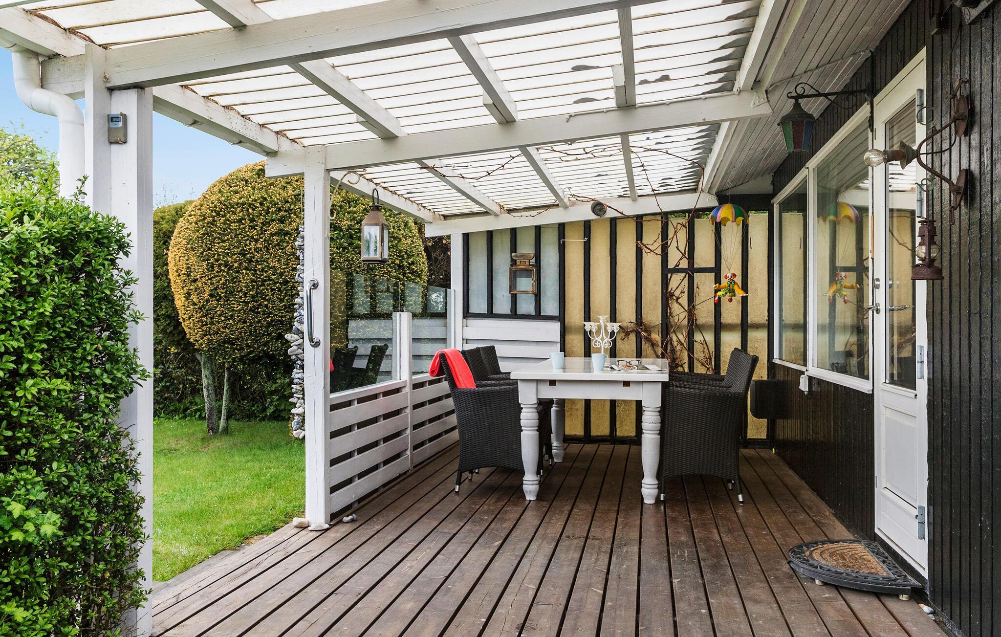 Når solen skinner, kan I nyde den lige fra morgenstunden på terrassen med en god kop kaffe. Dele af terrassen er overdækket, så I også kan finde skygge til at læse en god bog, mens børnene løber rundt og leger i haven. Holder vejret hele dagen, kan I lade en smuk aften gå på hæld med saftige bøffer fra grillen og et godt glas vin, mens I lægger planer for de kommende dage.