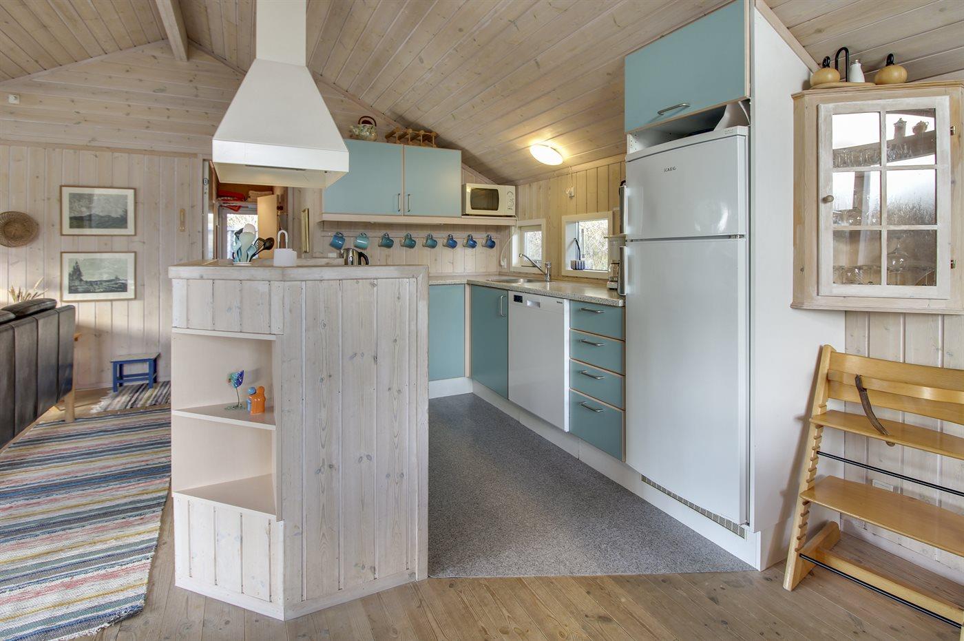 Køkkenet er udstyret med 1 køleskab. Der er 4 elkogeplader, varmluftovn, mikrobølgeovn samt opvaskemaskine.