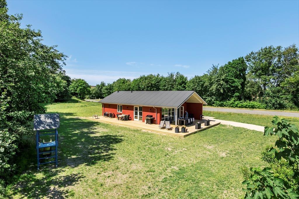 Også fra husets store og delvist overdækkede træterrasse får I rig mulighed for at nyde naturomgivelserne og den friske luft. Mod nordøst er udsigten særligt betagende, men det er nu også skønt at sidde på sydsiden af huset, hvor I kan slikke sol det meste af dagen. Til børnene er der legehus og sandkasse, og hele familien har god plads til at boltre sig på den 2722 m2 store grund.