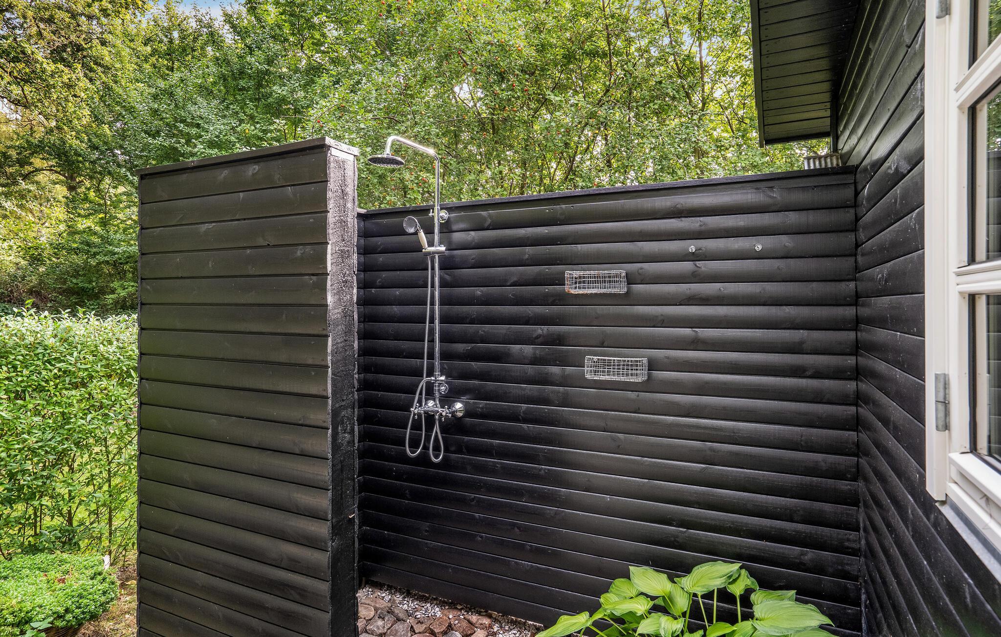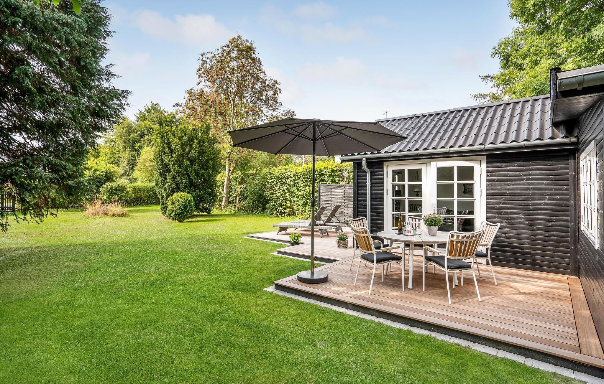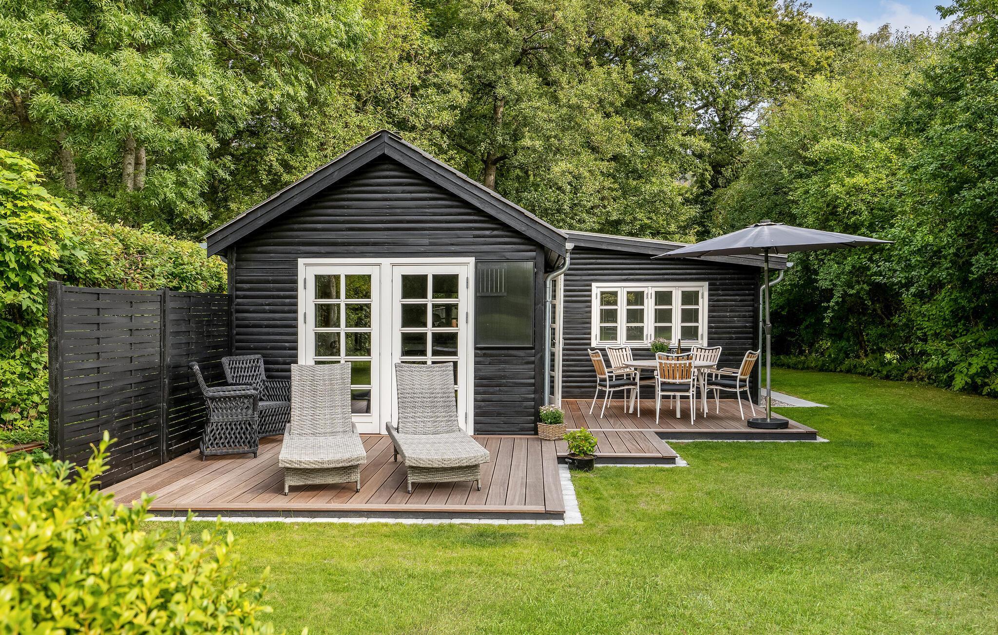 Hyggeligt træhus nær Femmøller Strand med terrasse og udendørs bruser, perfekt til afslapning og naturoplevelser.