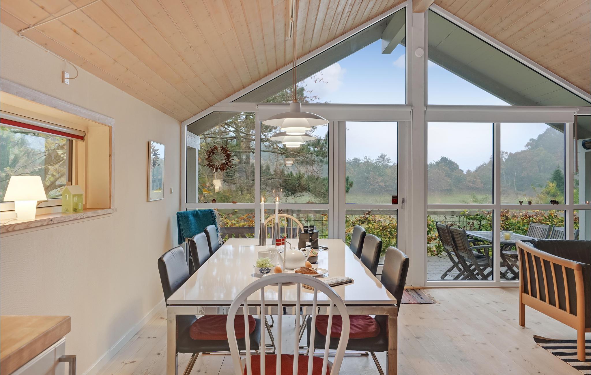 I den flotte, kuperede natur, som kendetegner Djursland finder I dette hyggelige feriehus. Opholdsstuen har åbent til kip, så der er masser af lys og luft i boligen, som er varmt og personligt indrettet og har dejlige, moderne faciliteter. Fra opholdsstuen har I udsigt til eng og skov, så det kan I nyde året rundt, uanset om terrassedøren står åben, eller I nyder aftenstemningen med ild i brændovnen.