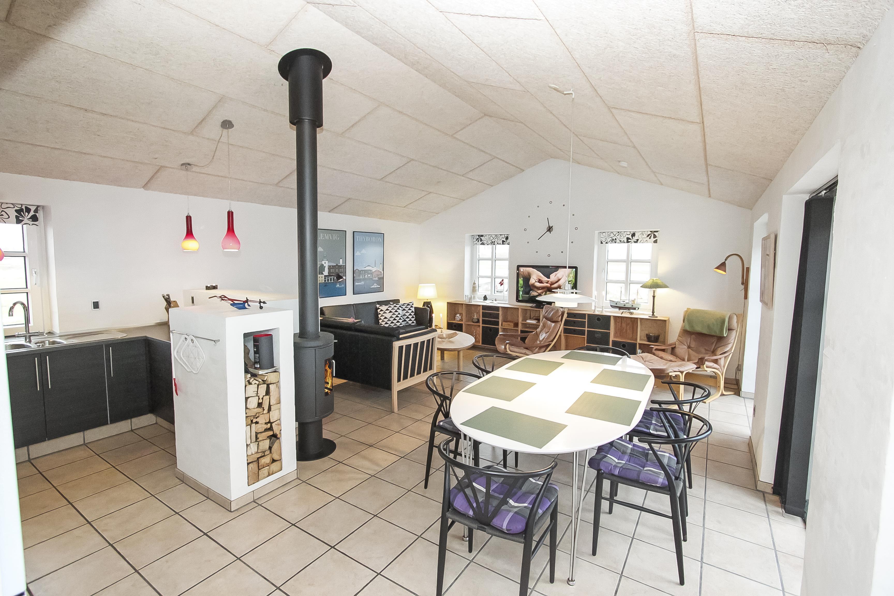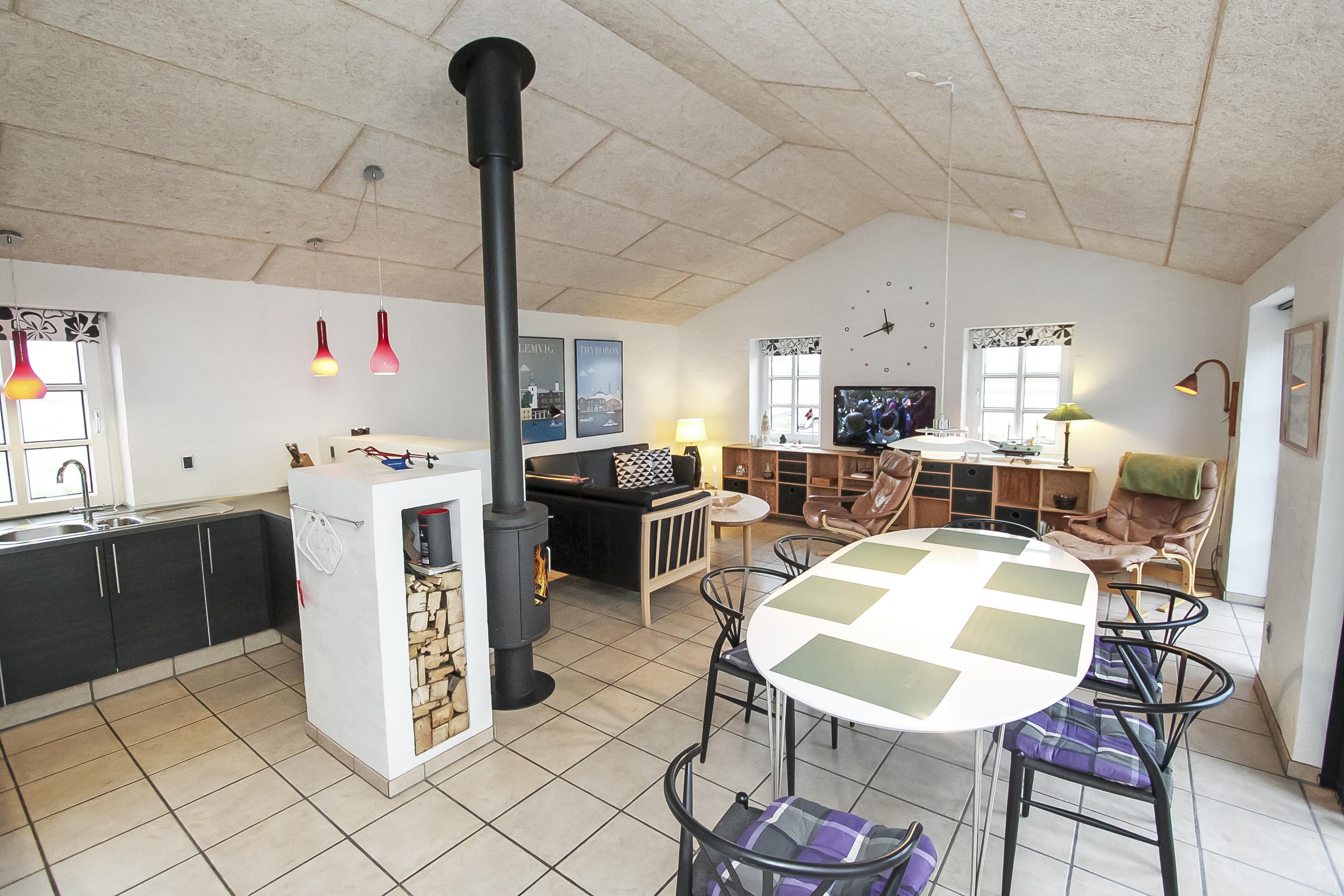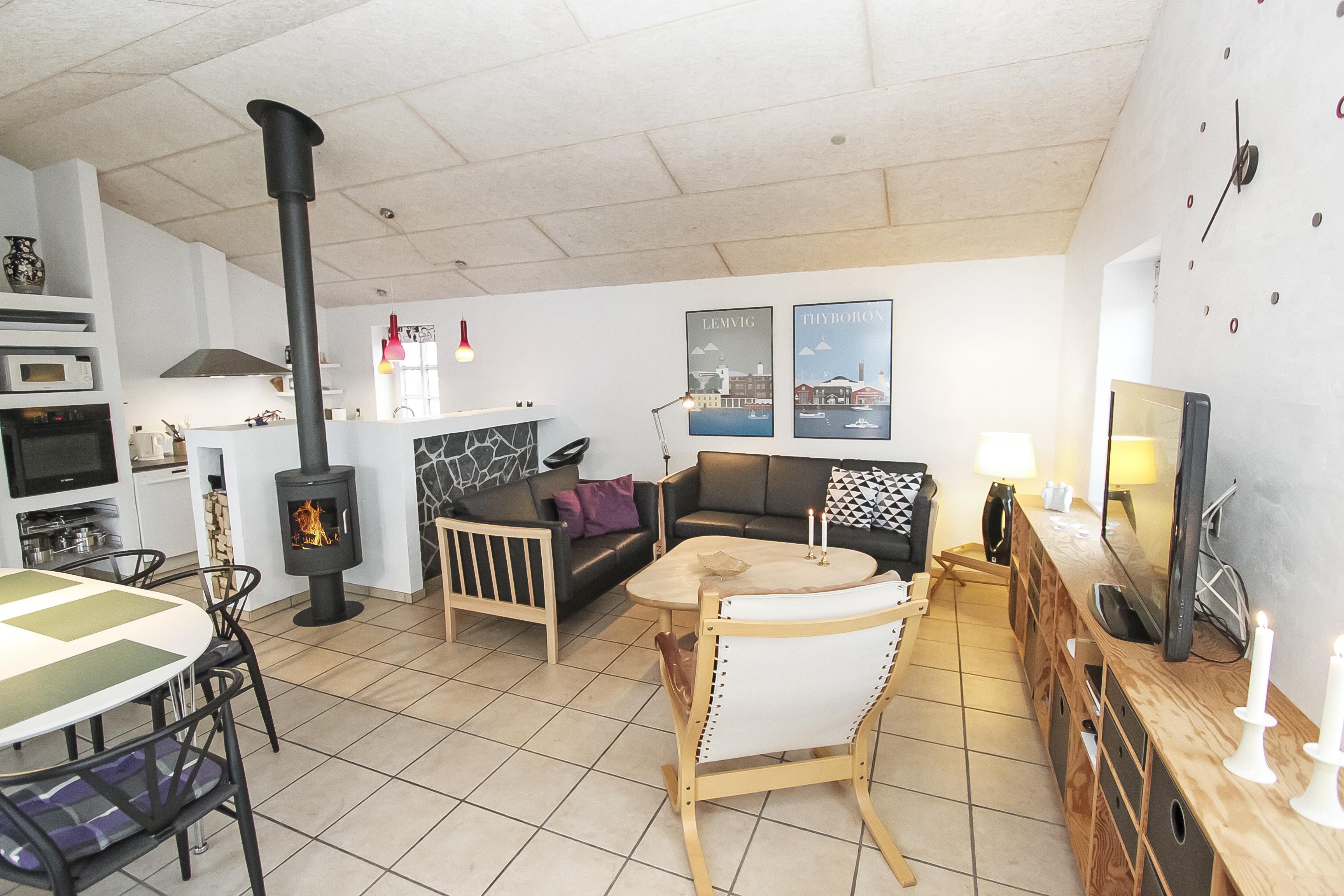 Stue og køkken er moderne indrettet så man uden problemer kan samtale fra stue til køkken og vice versa. I stuen findes brændeovn, sofragruppe med sofabord, et dejligt langt spisebord samt en stor fladskærm. Begge fjernsyn har Chromecast. Her kan man se DR-kanalerne samt TV2 og ligeledes tyske satellitkanaler. Radio forefindes ligeledes.
