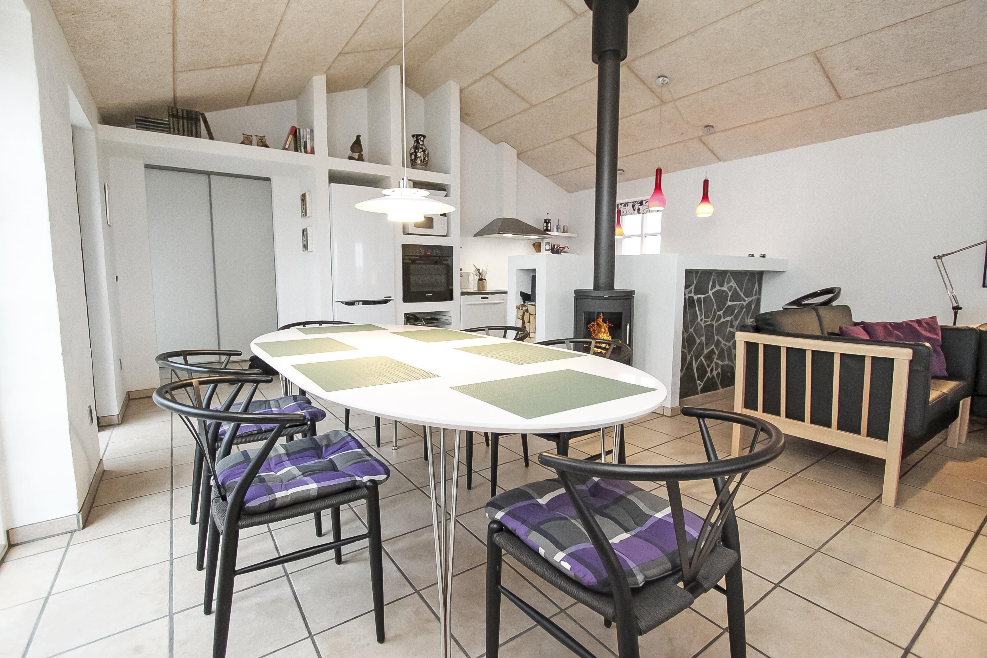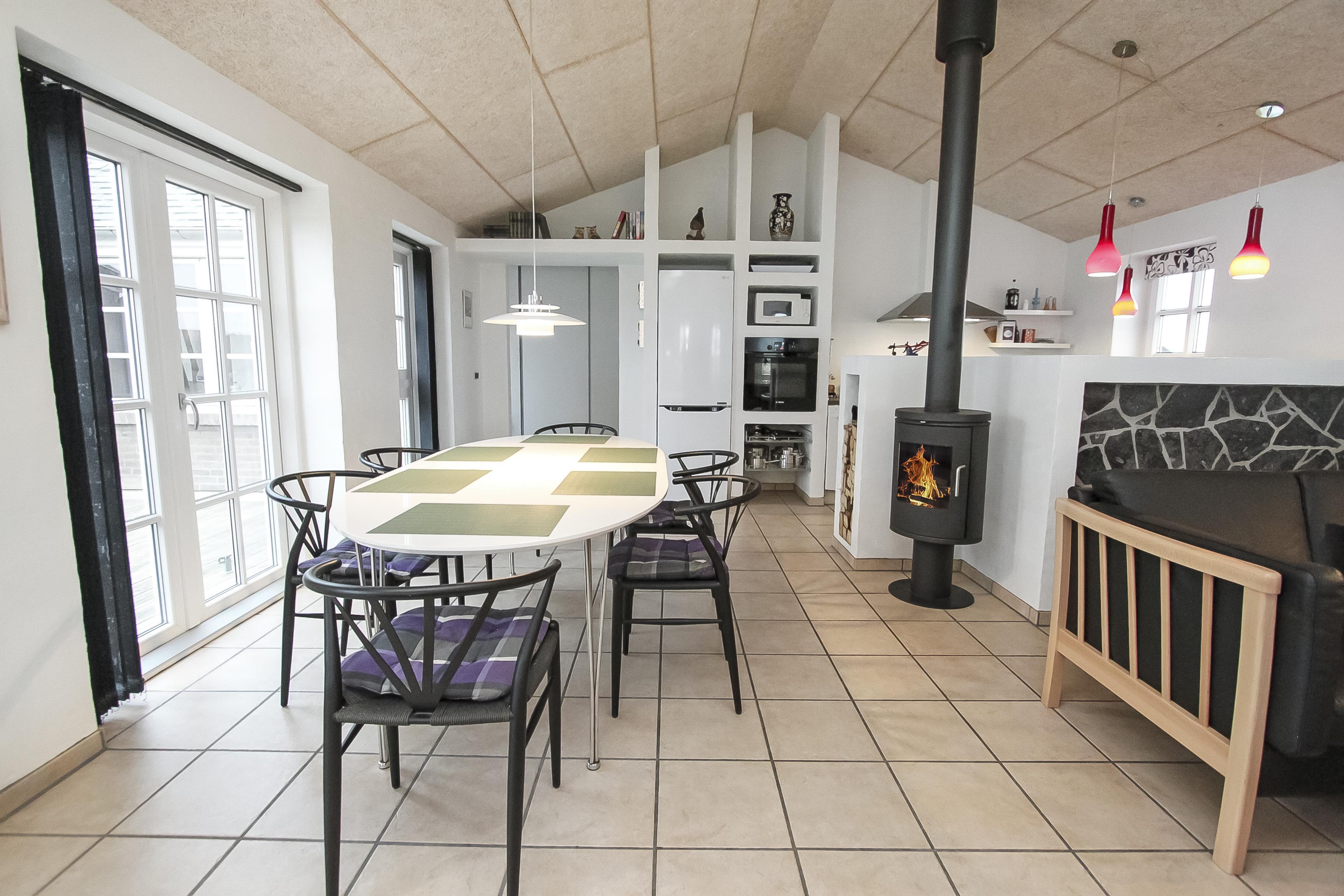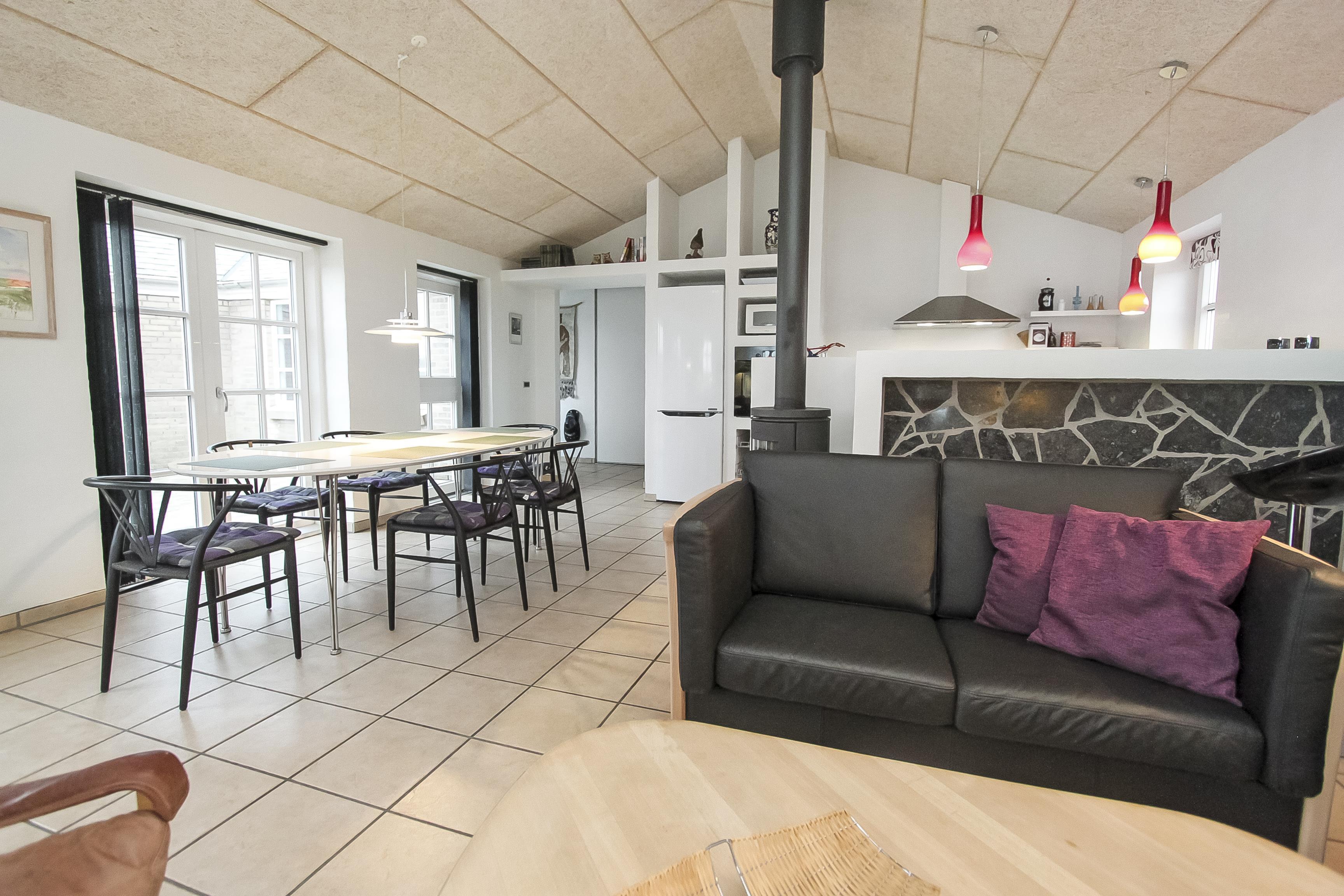 Stue og køkken er moderne indrettet så man uden problemer kan samtale fra stue til køkken og vice versa. I stuen findes brændeovn, sofragruppe med sofabord, et dejligt langt spisebord samt en stor fladskærm. Begge fjernsyn har Chromecast. Her kan man se DR-kanalerne samt TV2 og ligeledes tyske satellitkanaler. Radio forefindes ligeledes.