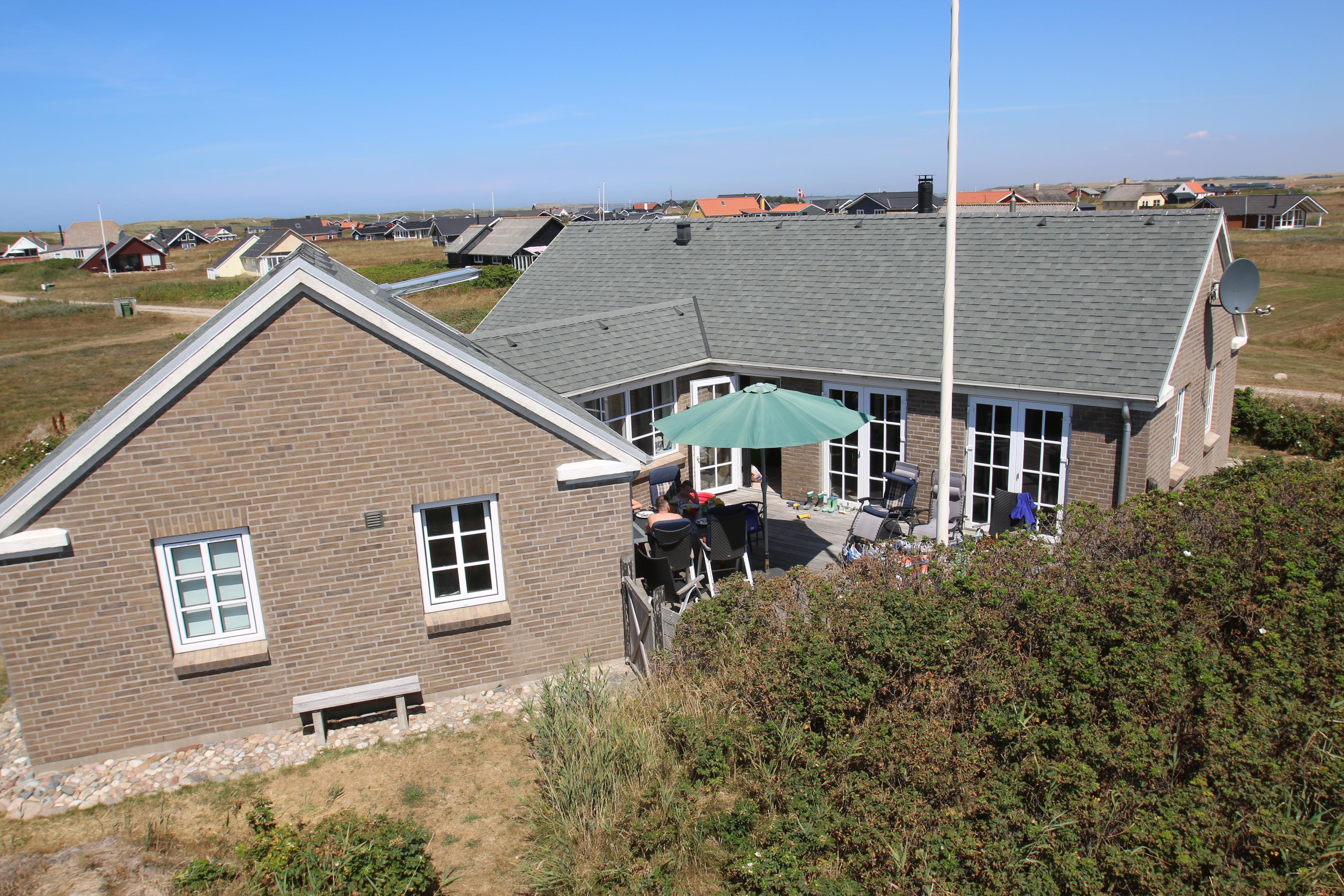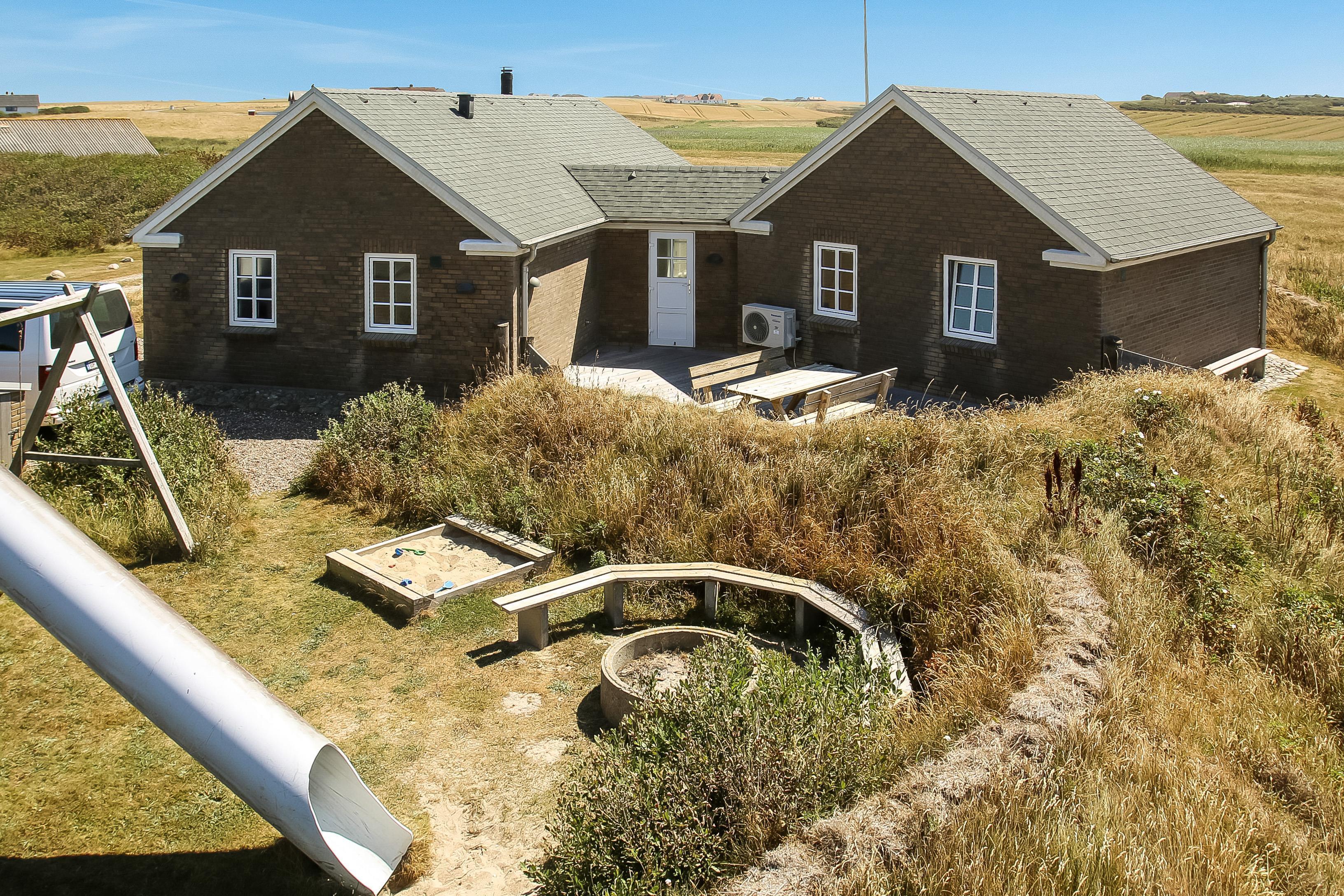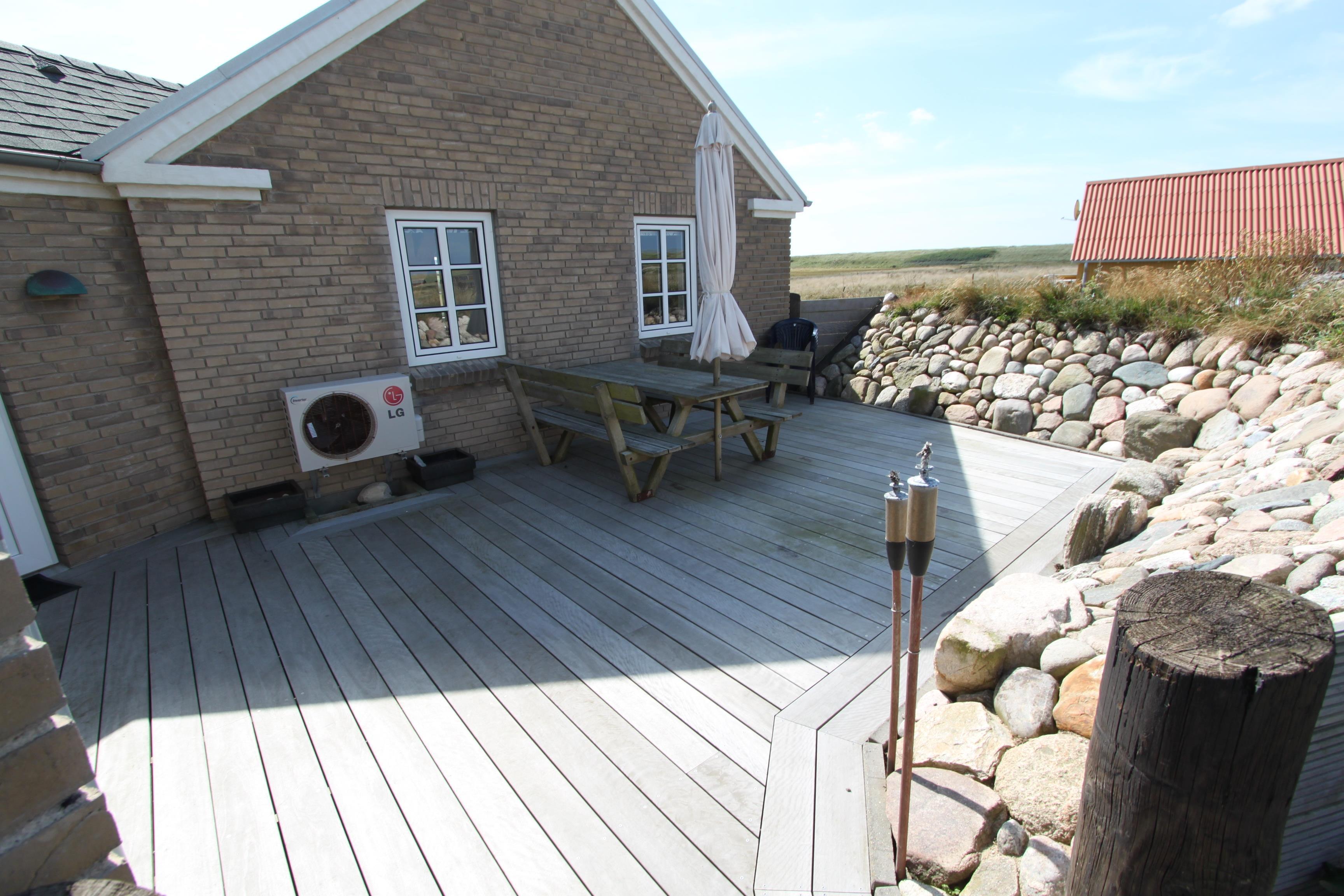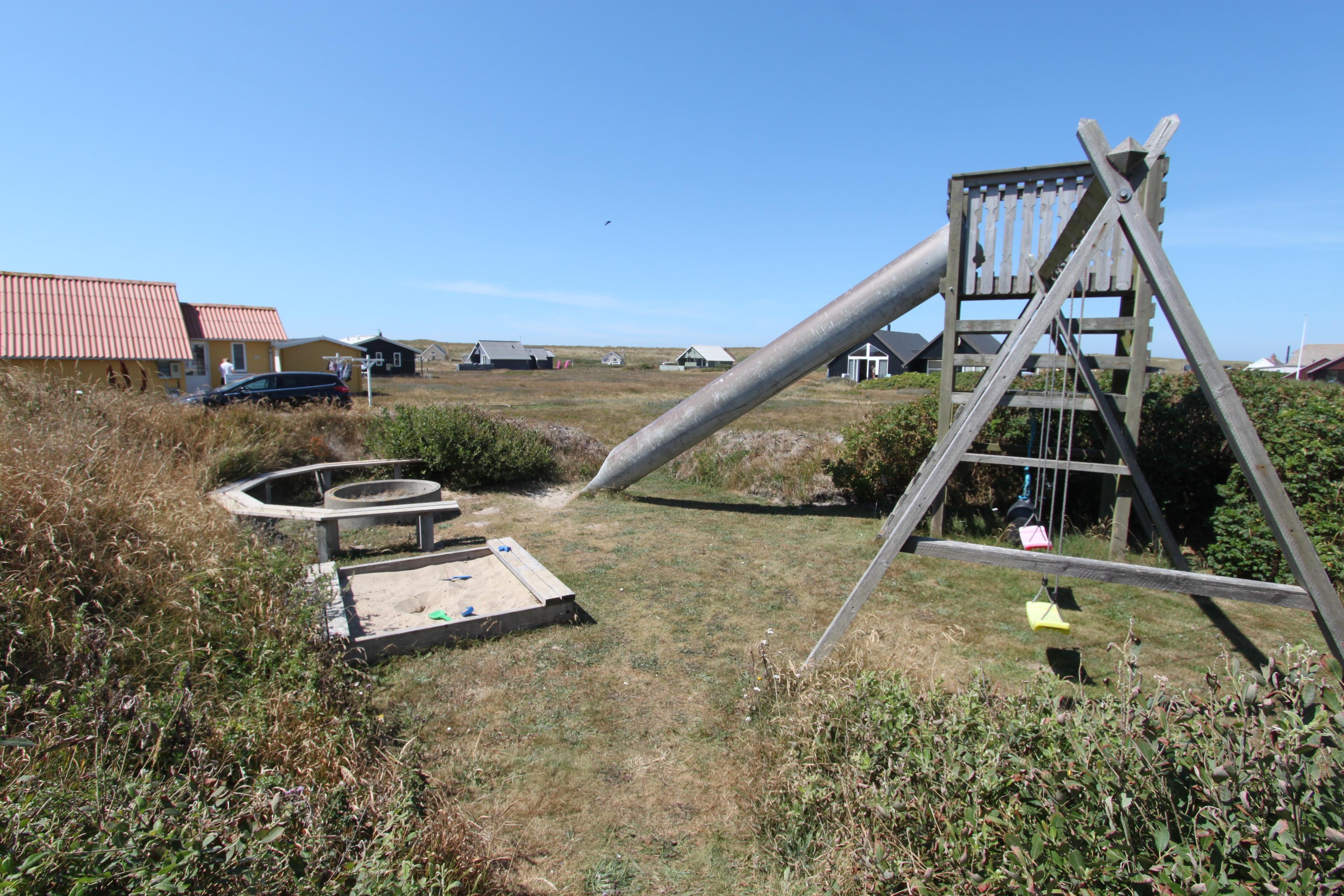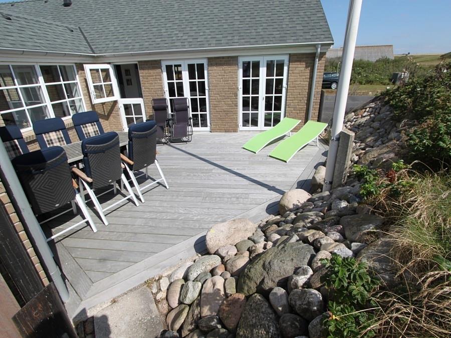 Huset har flere gode terrasser med havemøbler og grill samt 2 solvogne. Een af terrasserne er endda aflukket via et mindre stendige. Haven byder også på en legeplads til børnene med sandkasse, gynger og rutsjebane. Her er endda også en bænk til de voksne, så de kan sidde og betragte børnene ellers kan man også holde øje med dem fra terrassen. I det hele taget er der rigtig mange gode muligheder for at sidde rundt om huset og nyde udsigten. Vesterhavet er ikke langt borte og her kan man ligeledes solbade, vandre, flyve med drage eller lystfiske.