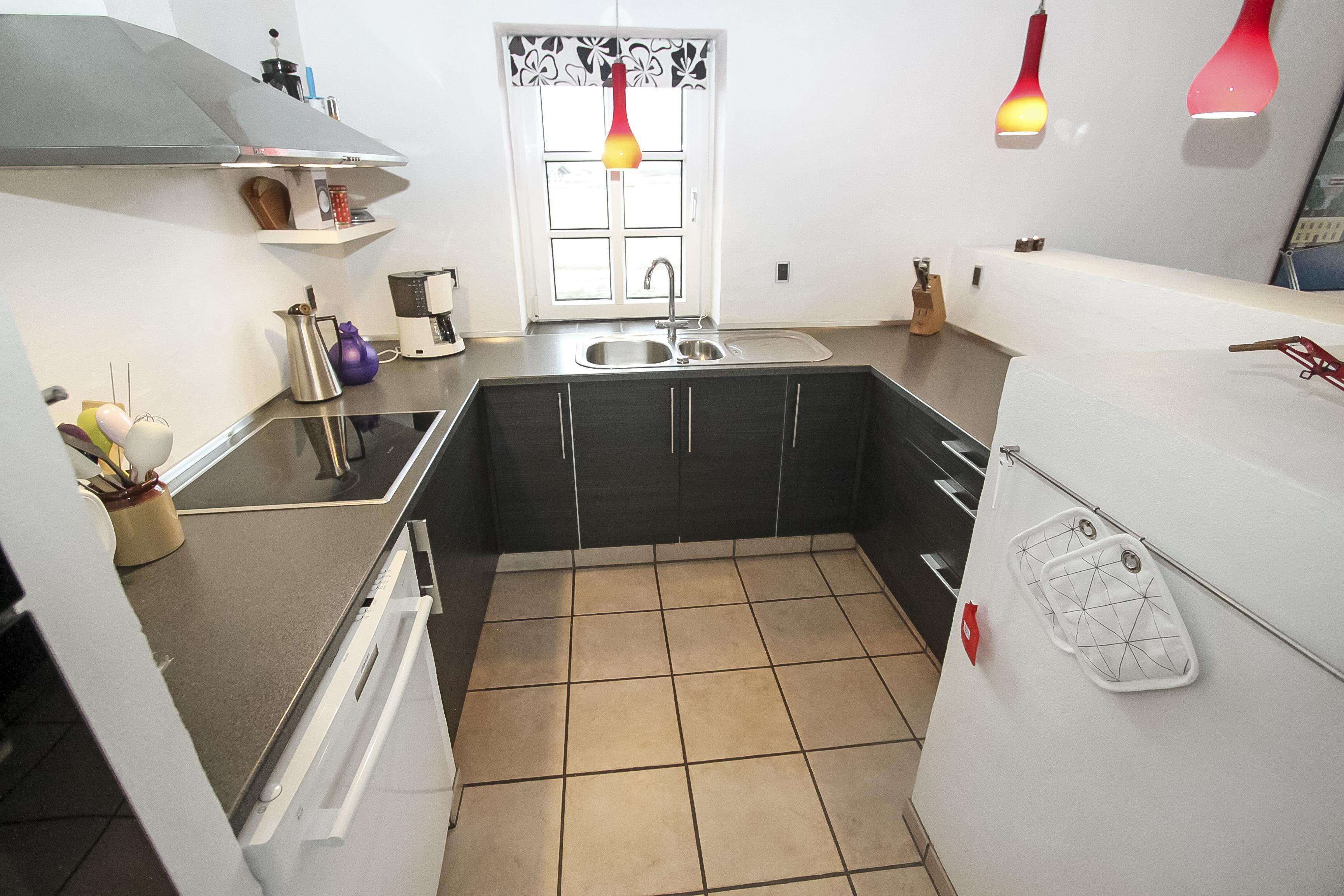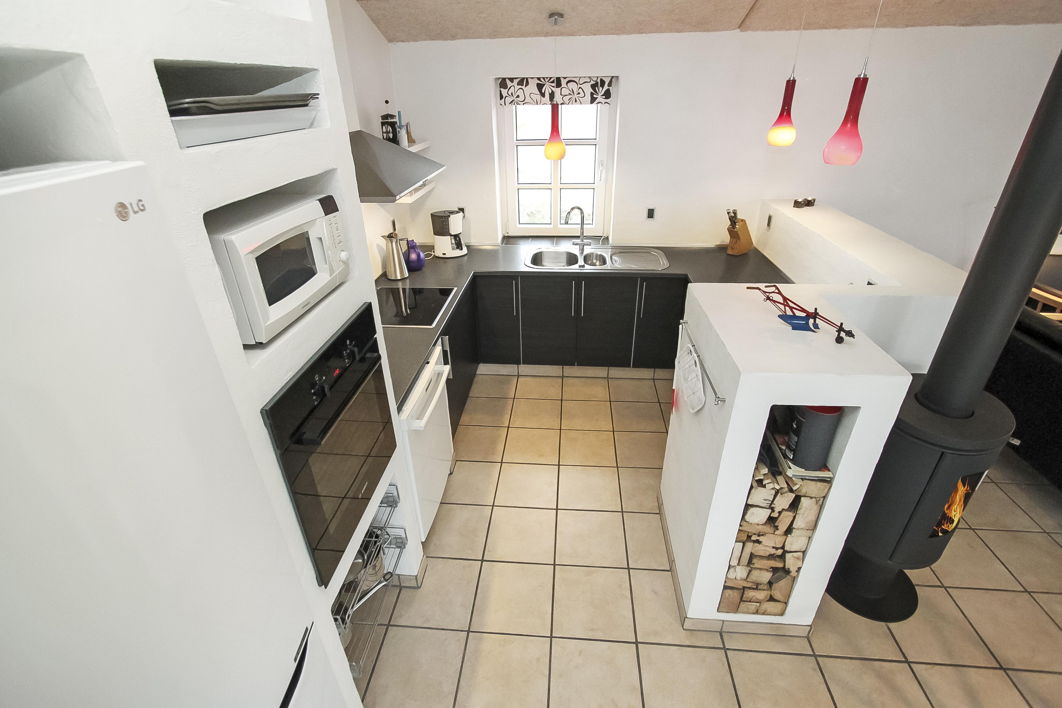 Køkkenet byder på glaskeramisk komfur, mikrobølgeovn, opvaskemaskine, samt køleskab og en separat fryser på 70 liter. Herudover er der også en vaskemaskine i huset.