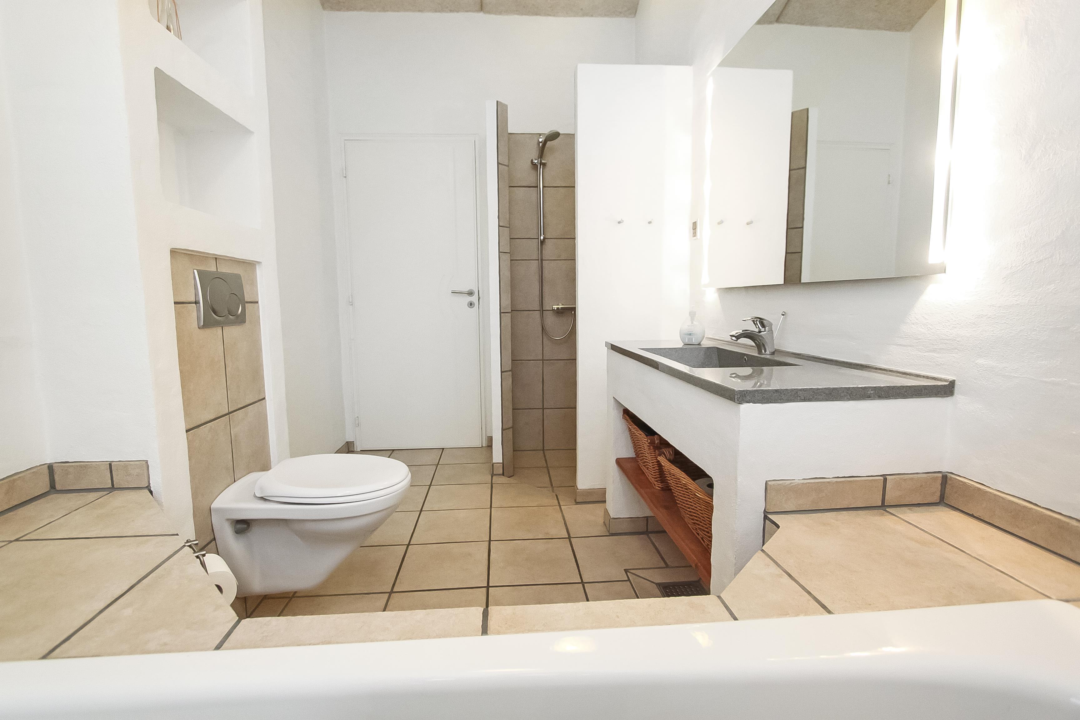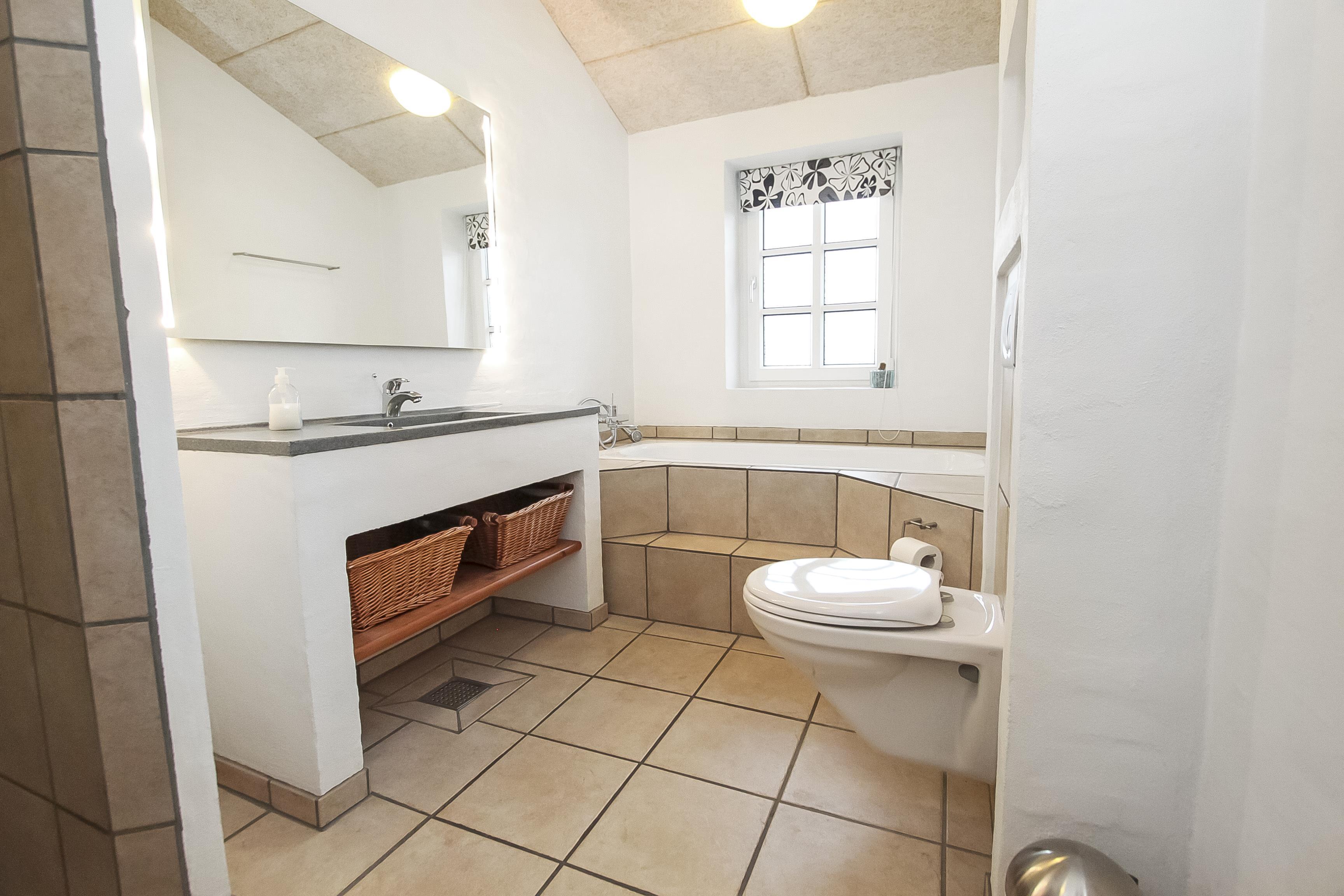 Badeværelset er ligeledes ret moderne indrettet med gulvvarme, badekar, bruser, toilet og håndvask - så her mangler ikke noget.