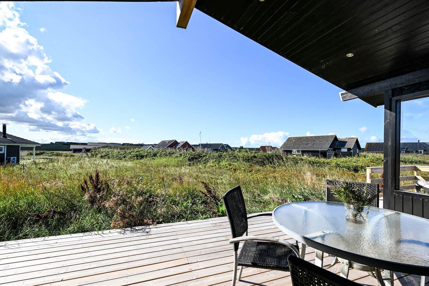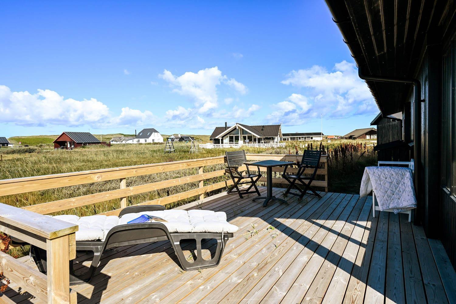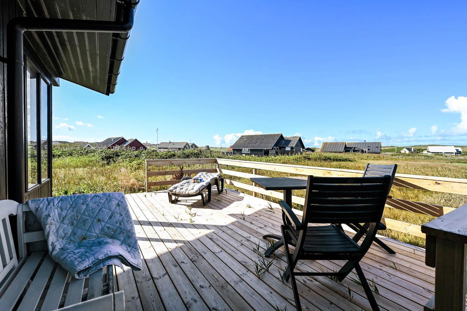 Huset ligger på en 1269 m2 stor grund kun ca. 200 m fra det brusende Vesterhav. Havets brusen kan høres, når man fx nyder morgenkaffen på den store træterrasse. Terrassen er delvis overdækket og der er havemøbler og gasgrill til rådighed, og lægger op til at tilbringe de sene sommeraftener med sine nærmeste. Ferring Sø ligger heller ikke langt fra huset, kun ca. 600 m, og er oplagt til en lang gåtur. En af favorit-ferieattraktionerne i området, Bovbjerg Fyr, ligger også kun få minutter væk bil. Her kan man nyde en kop kaffe og et stykke kage i caféen og blive blæst bagover den flotte udsigt fra toppen af fyret. Fra huset tager det ikke mange minutter i bil til Harboøre, hvor der er forskellige indkøbsmuligheder.