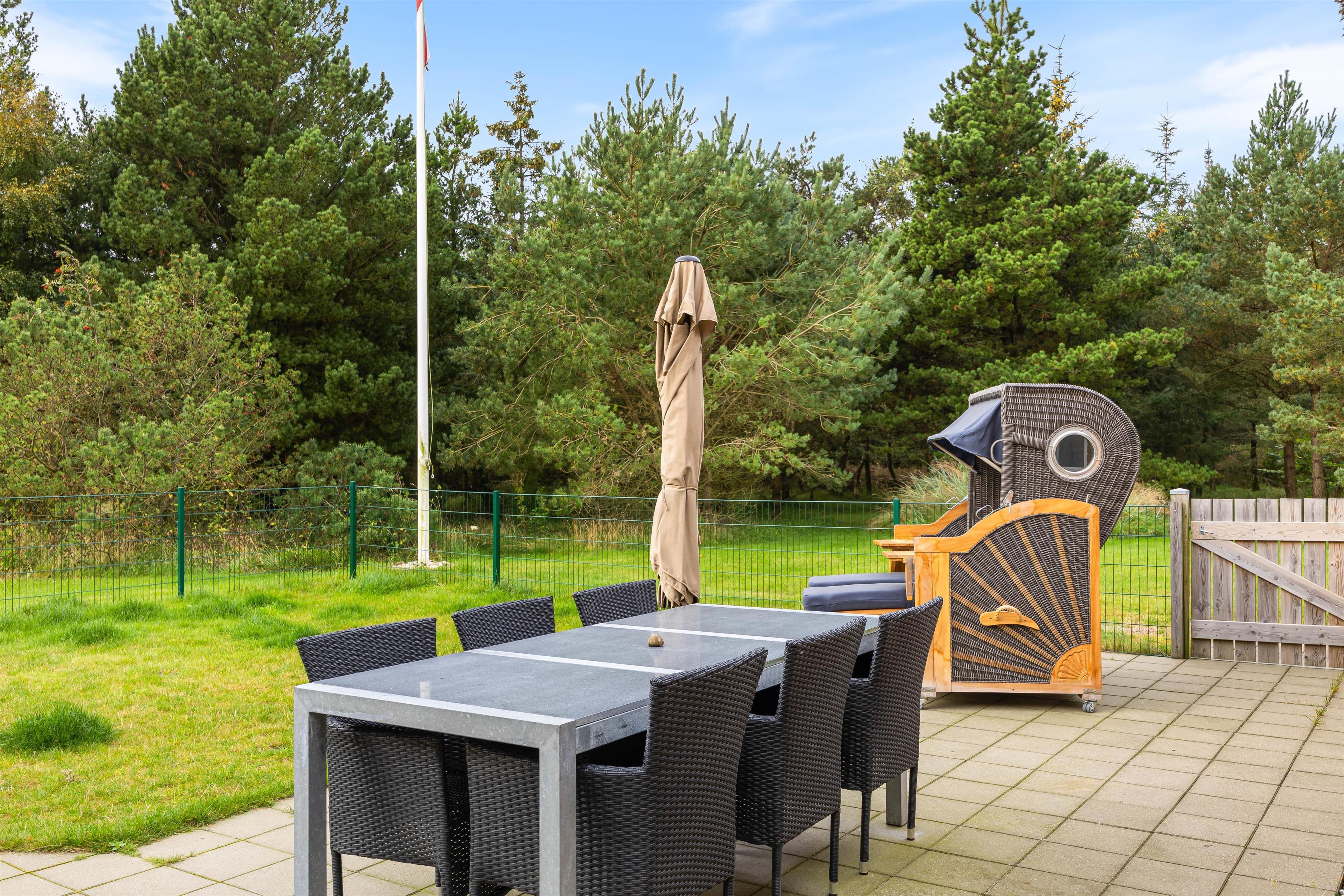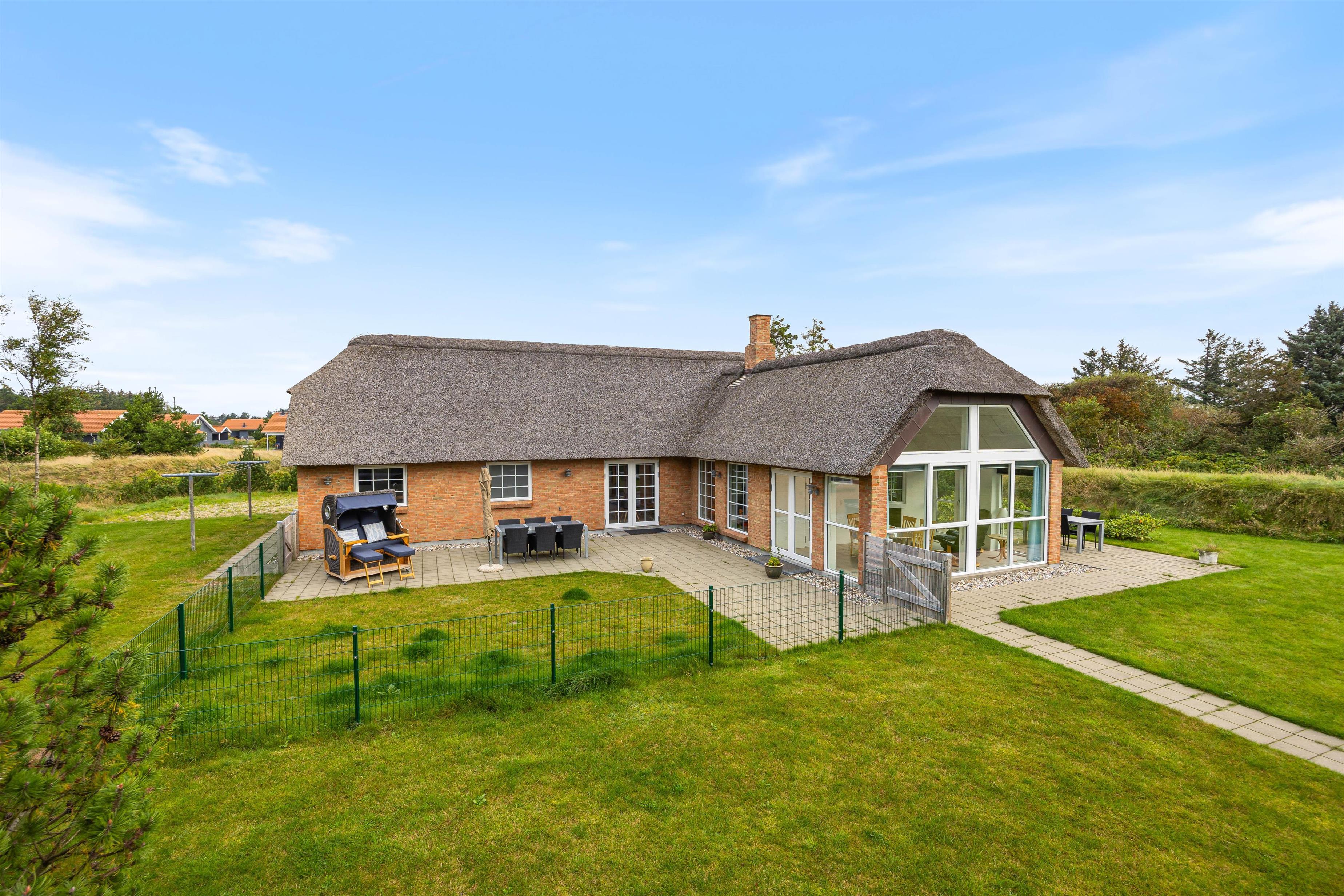 Den østvendte terrasse er åben og oplagt til at nyde dagens første kop kaffe i solopgangen. Den sydvendte terrasse er indhegnet, hvilket gør huset ideelt som et hundevenligt feriehus – eller til børnefamilier, der ønsker trygge omgivelser, mens de voksne slapper af i solen med en kold drink.