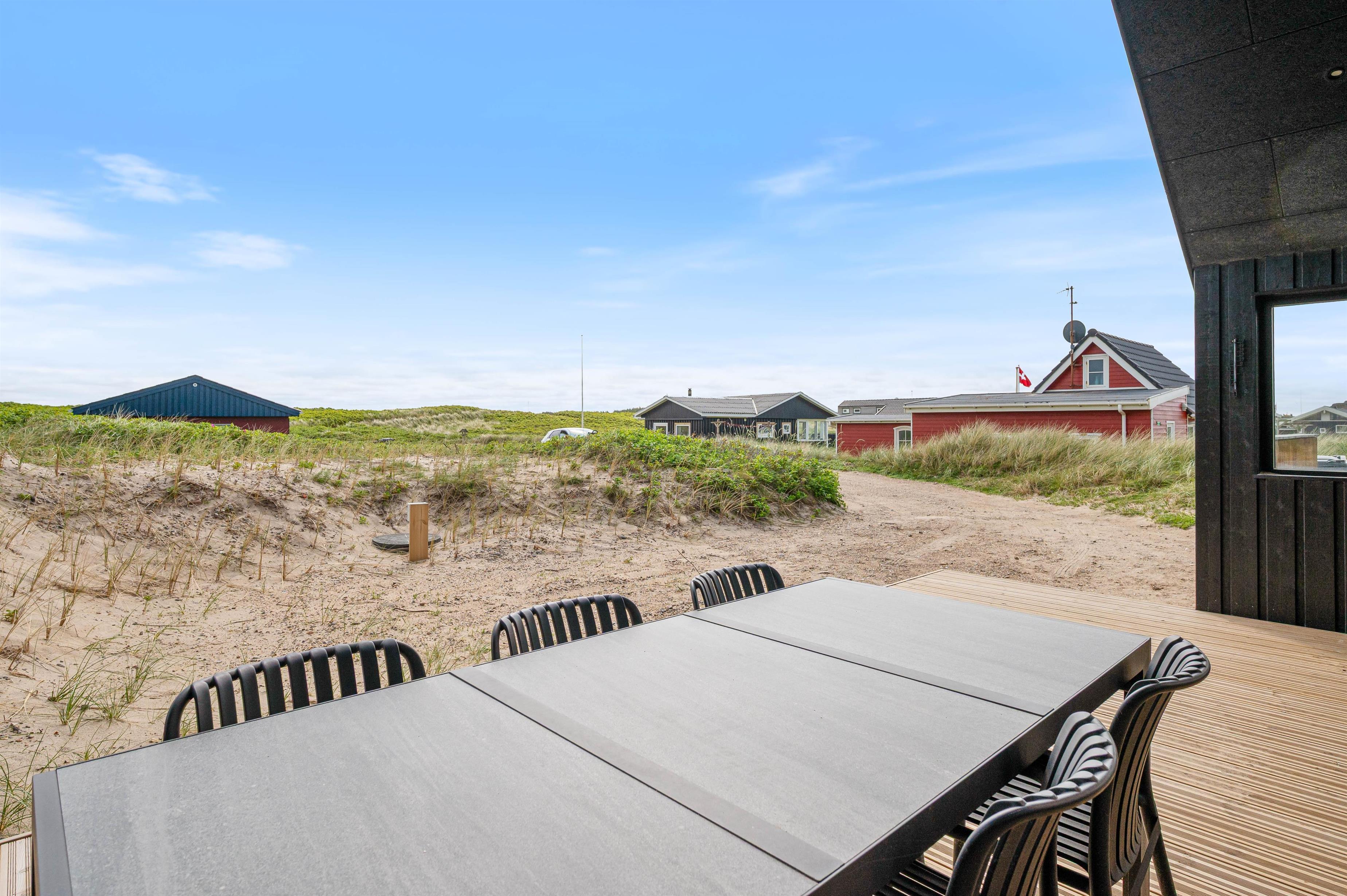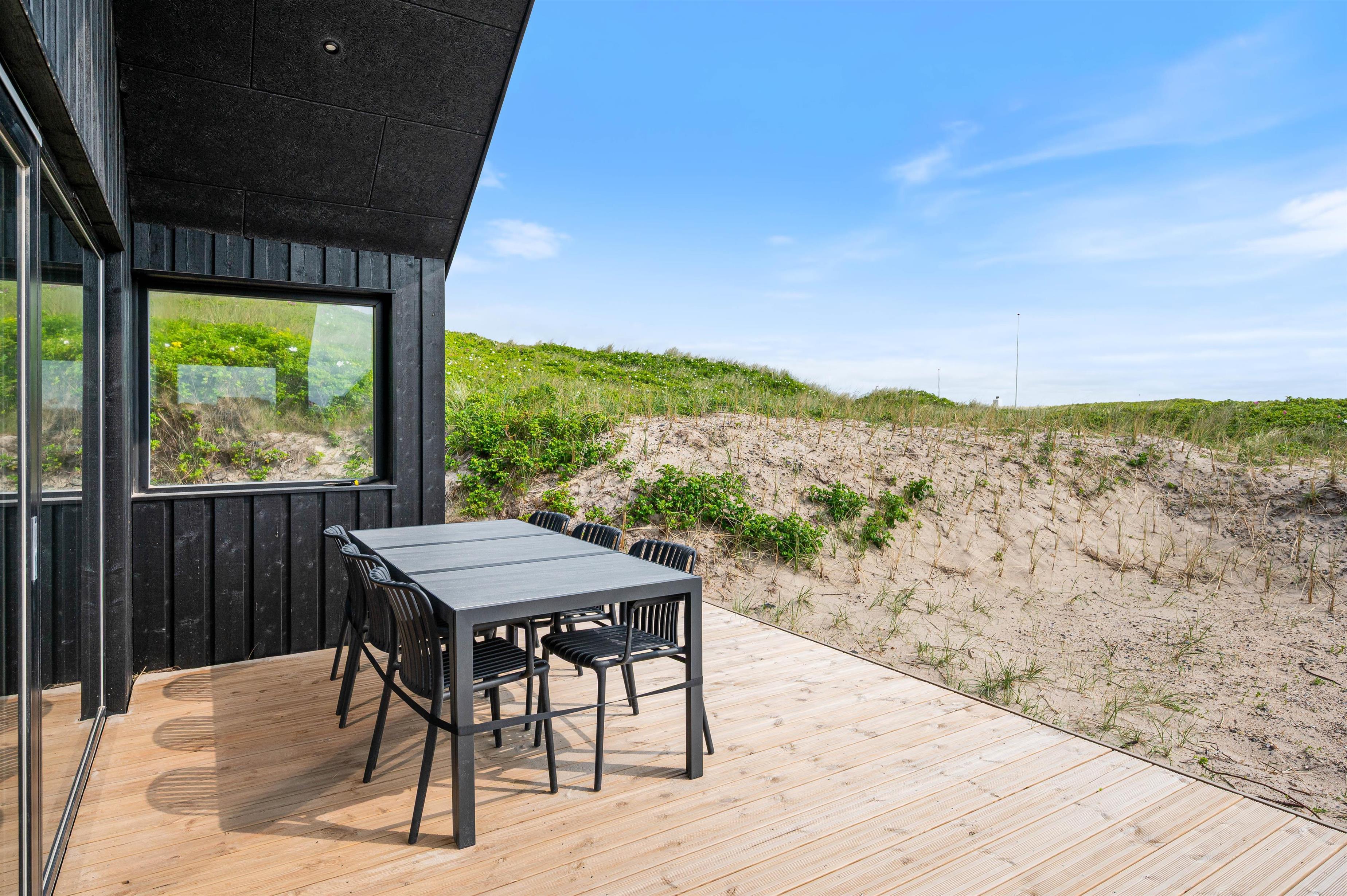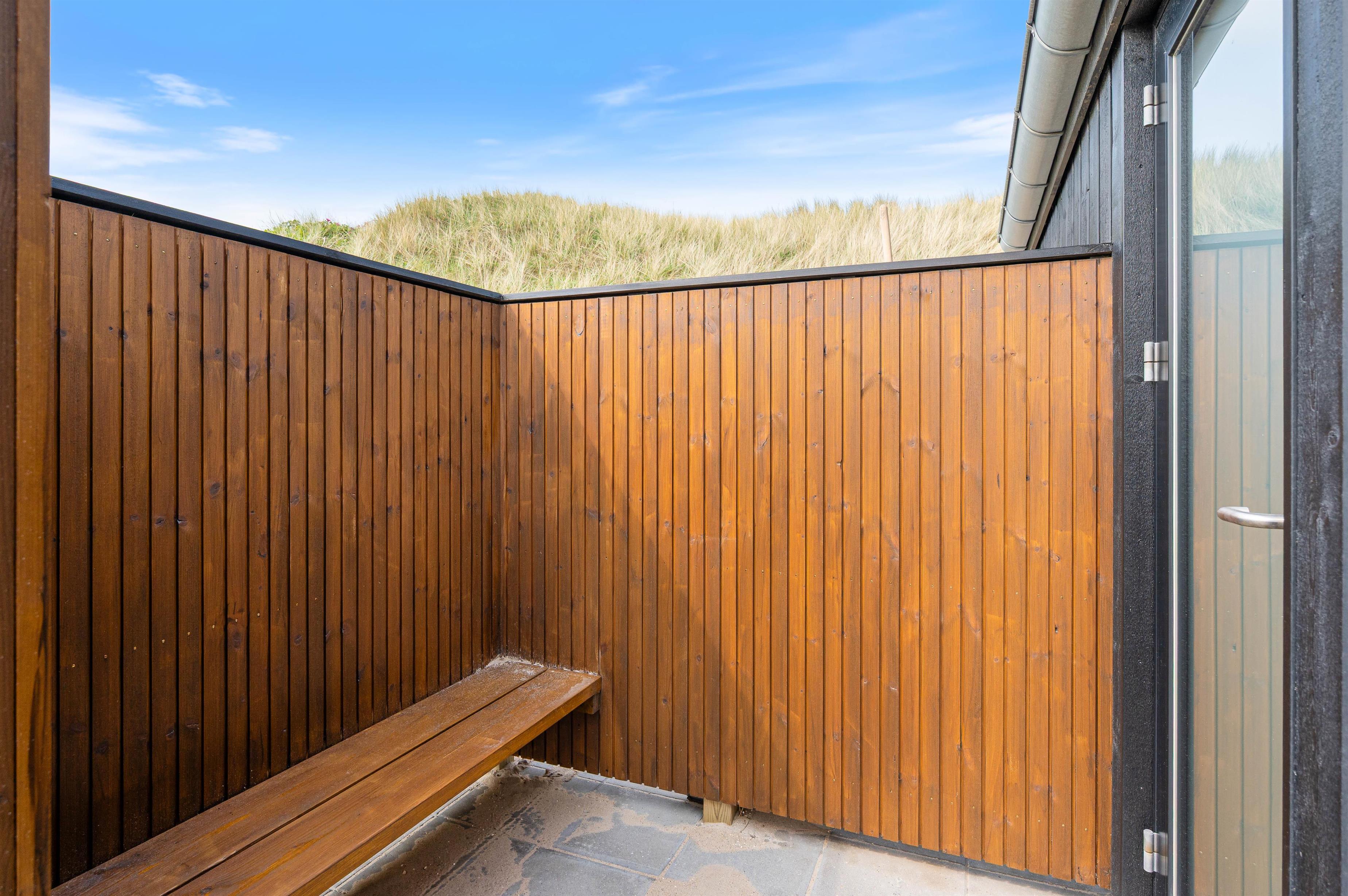 Træterrassen som vender mod øst, er delvist overdækket, og her er godt med læ. Her kan I nyde morgensolen og nyde den ro og stilhed, som I vil opleve i området. Den eneste larm, I vil kunne høre under ferien, er den afslappende lyd af havets brusen.