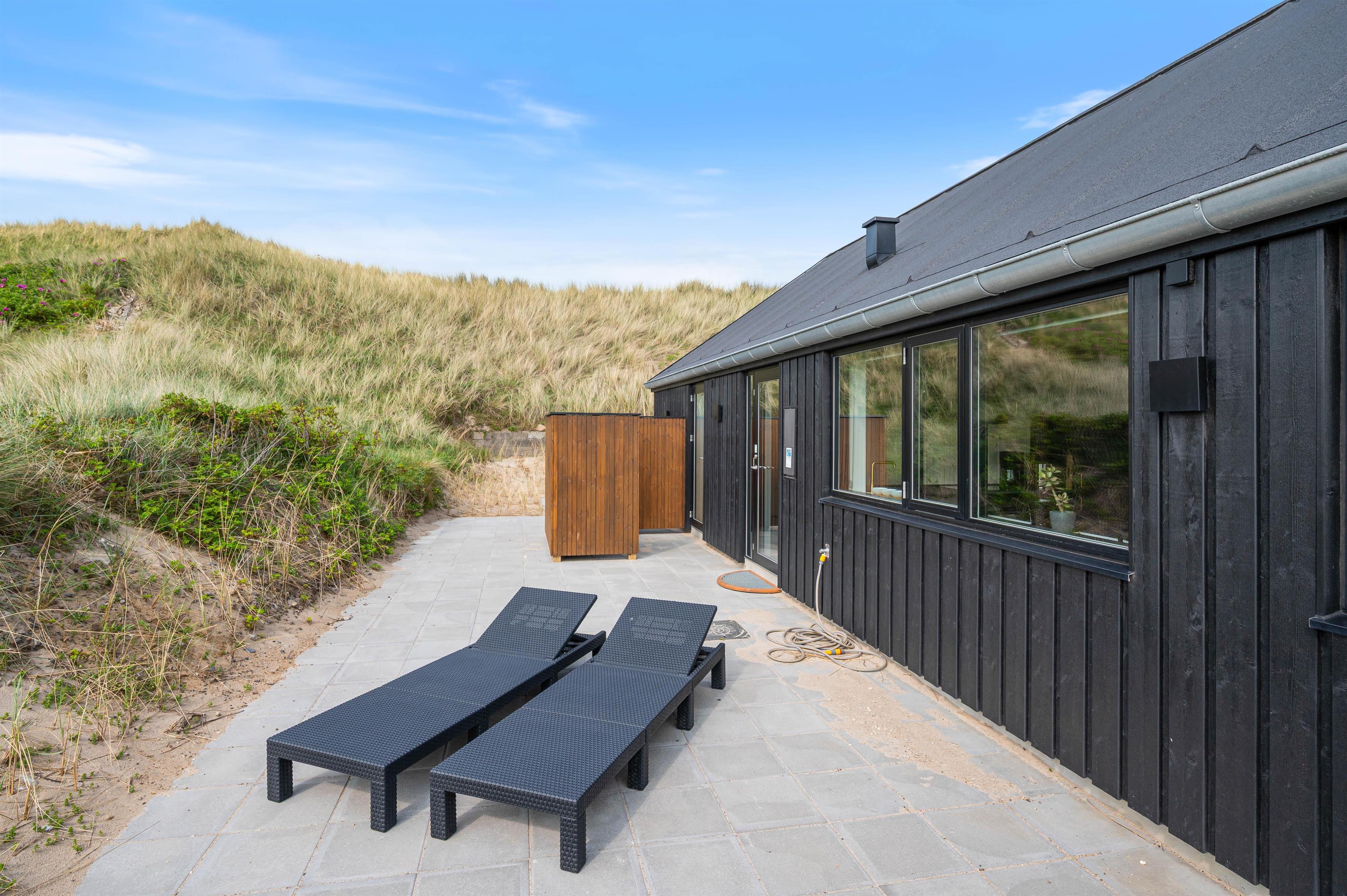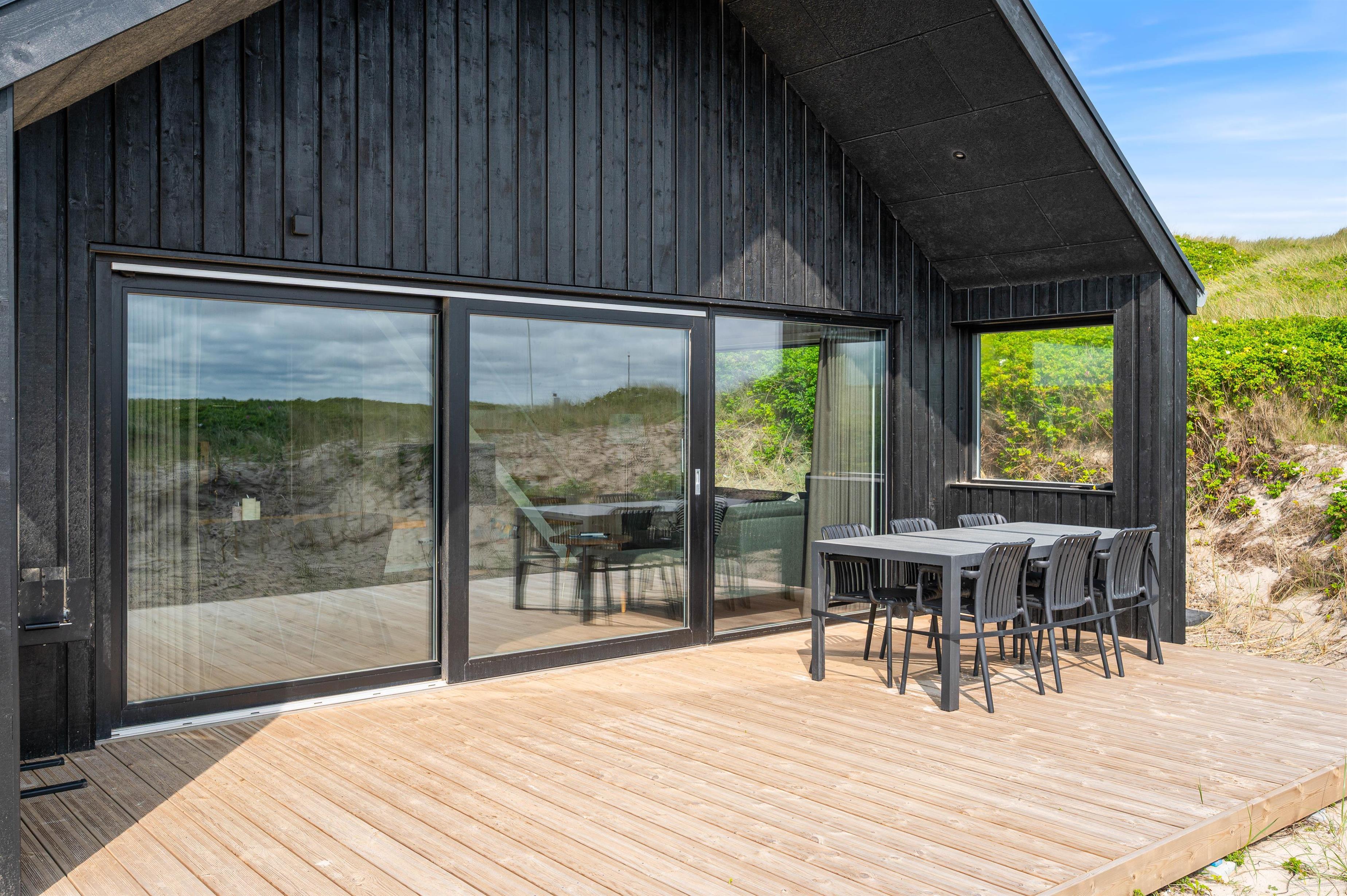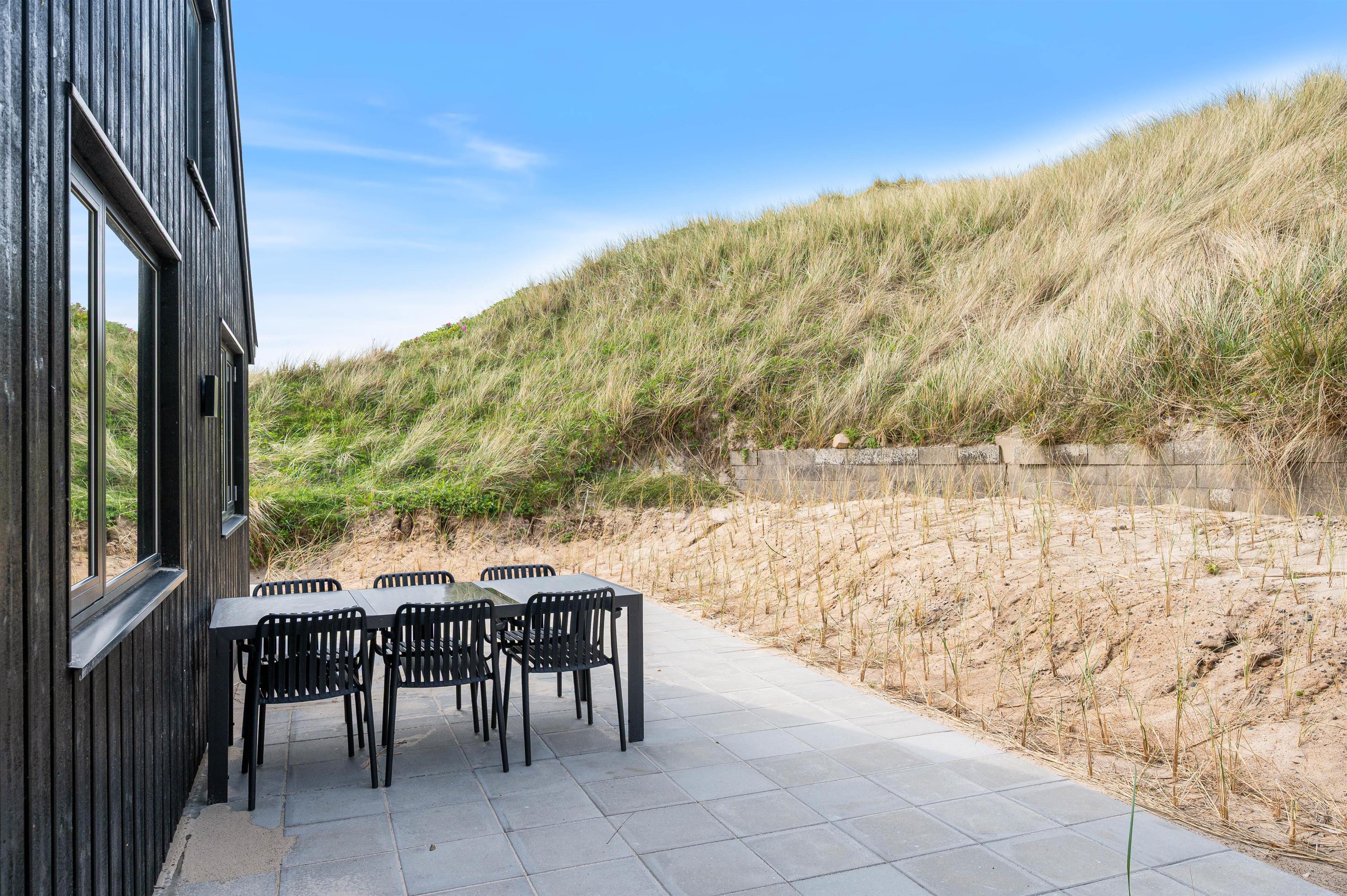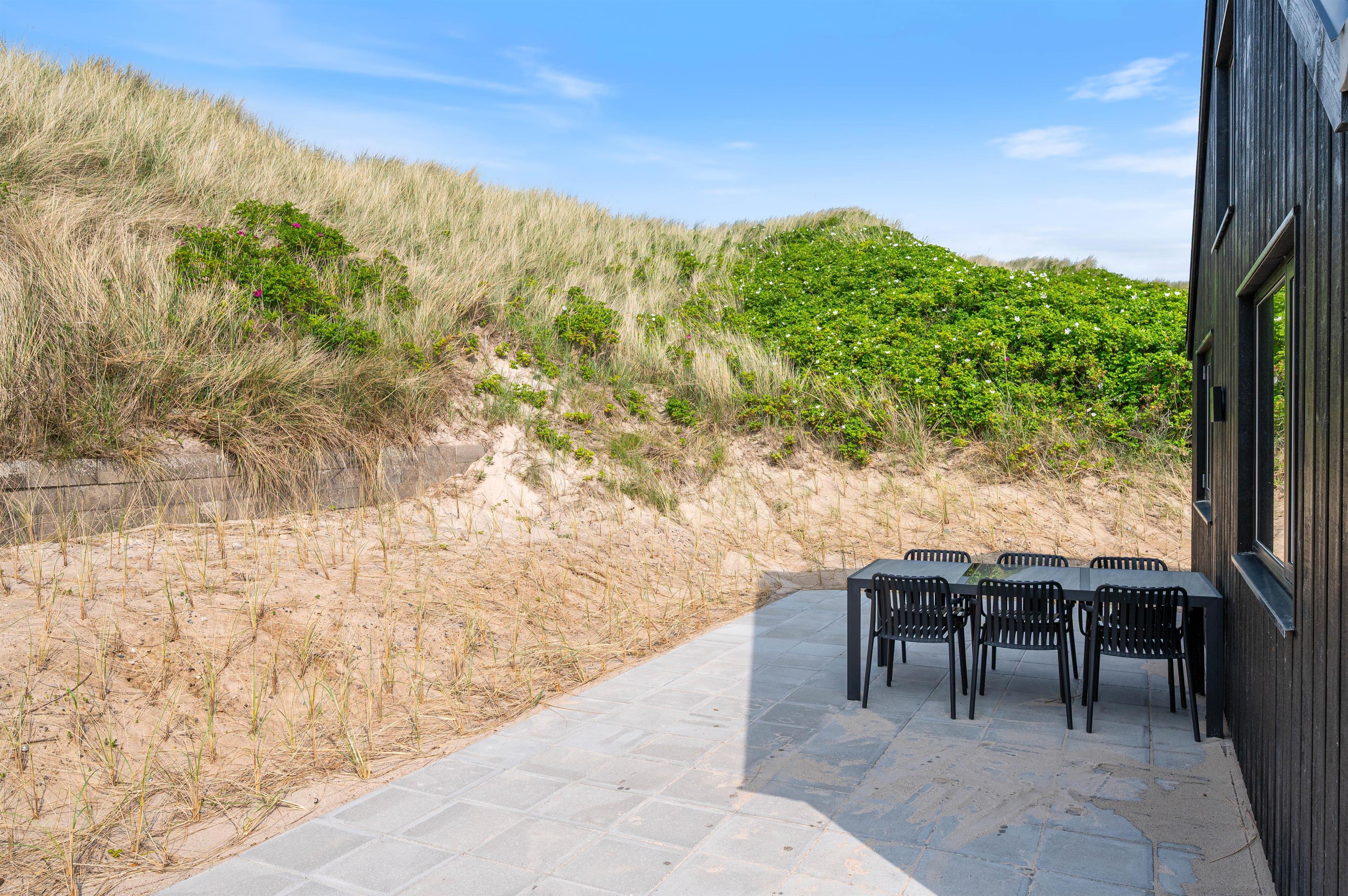 Træterrassen som vender mod øst, er delvist overdækket, og her er godt med læ. Her kan I nyde morgensolen og nyde den ro og stilhed, som I vil opleve i området. Den eneste larm, I vil kunne høre under ferien, er den afslappende lyd af havets brusen.