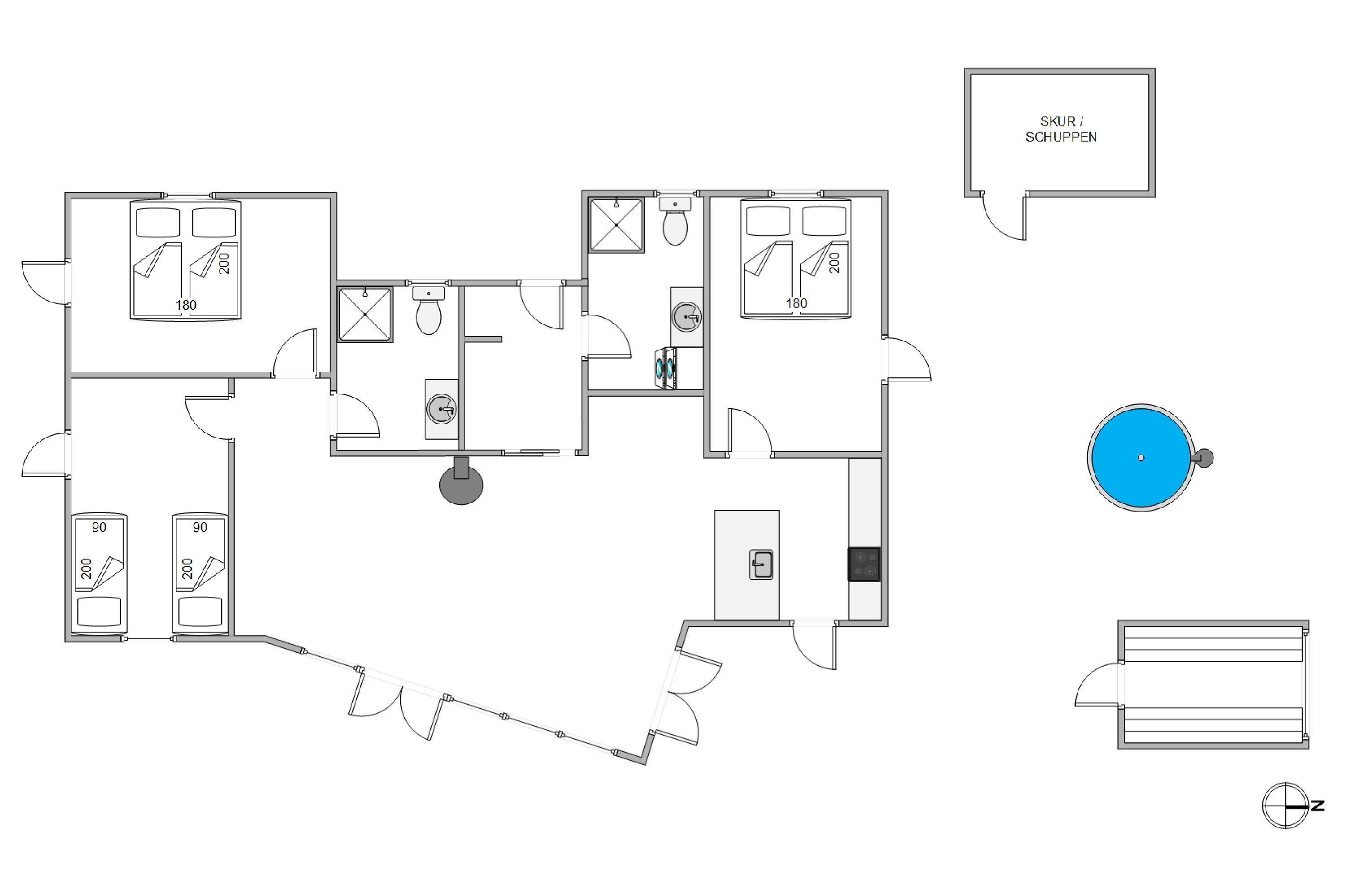 Dette sommerhus har hele 2 topmoderne badeværelser, hvor begge er udstyret med gulvvarme. Det er oplagt, hvis I er 2 familier, der holder ferie sammen, da hver familie kan få sit eget badeværelse. De 6 sovepladser er fordelt på 3 soveværelser, hvor 2 har dobbeltseng, og ét værelse har enkeltmandssenge – et oplagt værelse til teenagerne.