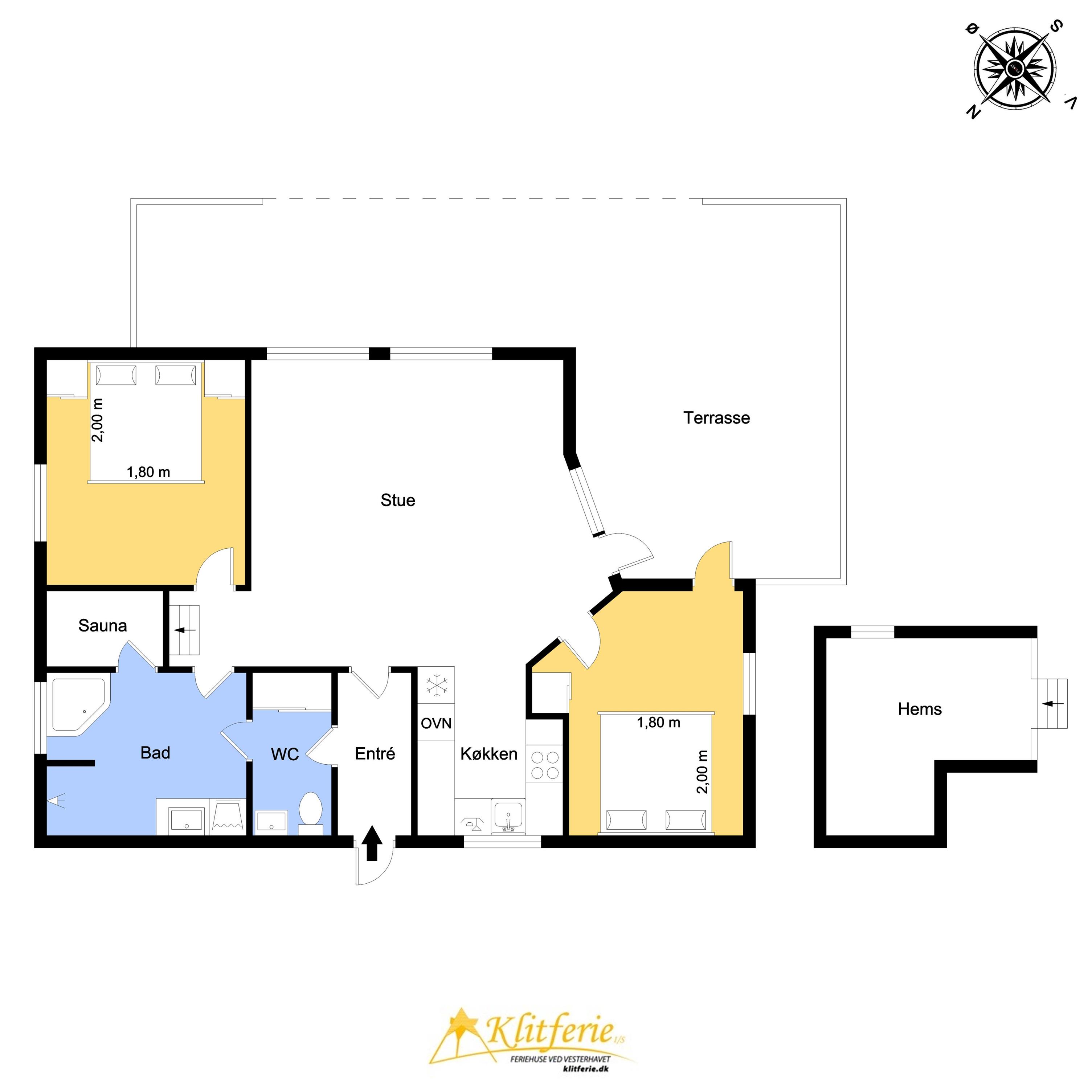 Indenfor byder huset på en funktionel og hyggelig indretning med entre og et veludstyret køkken, der blandt andet har opvaskemaskine. Stuen er lys og rummelig med spiseplads, sofagruppe og tv – her er der plads til både hygge og fælles måltider. De to soveværelser rummer henholdsvis en dobbeltseng og to enkeltsenge, som nemt kan sættes sammen til endnu en dobbeltseng. Begge værelser er rummelige og giver fint plads til en barneseng, hvis det ønskes. På hemsen findes to ekstra madrasser – oplagt til lidt større børn eller dem, der søger en ekstra hyggelig soveplads.