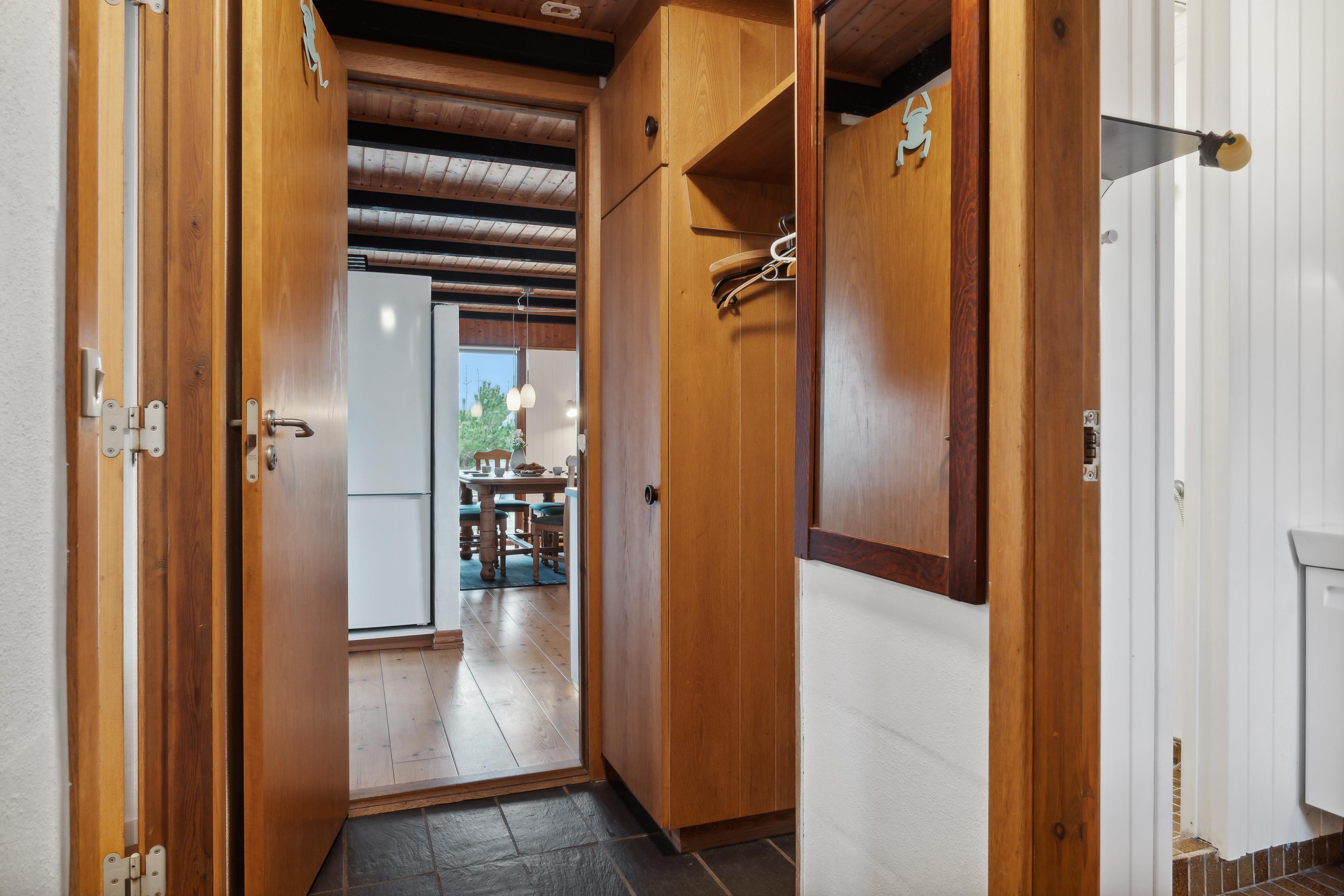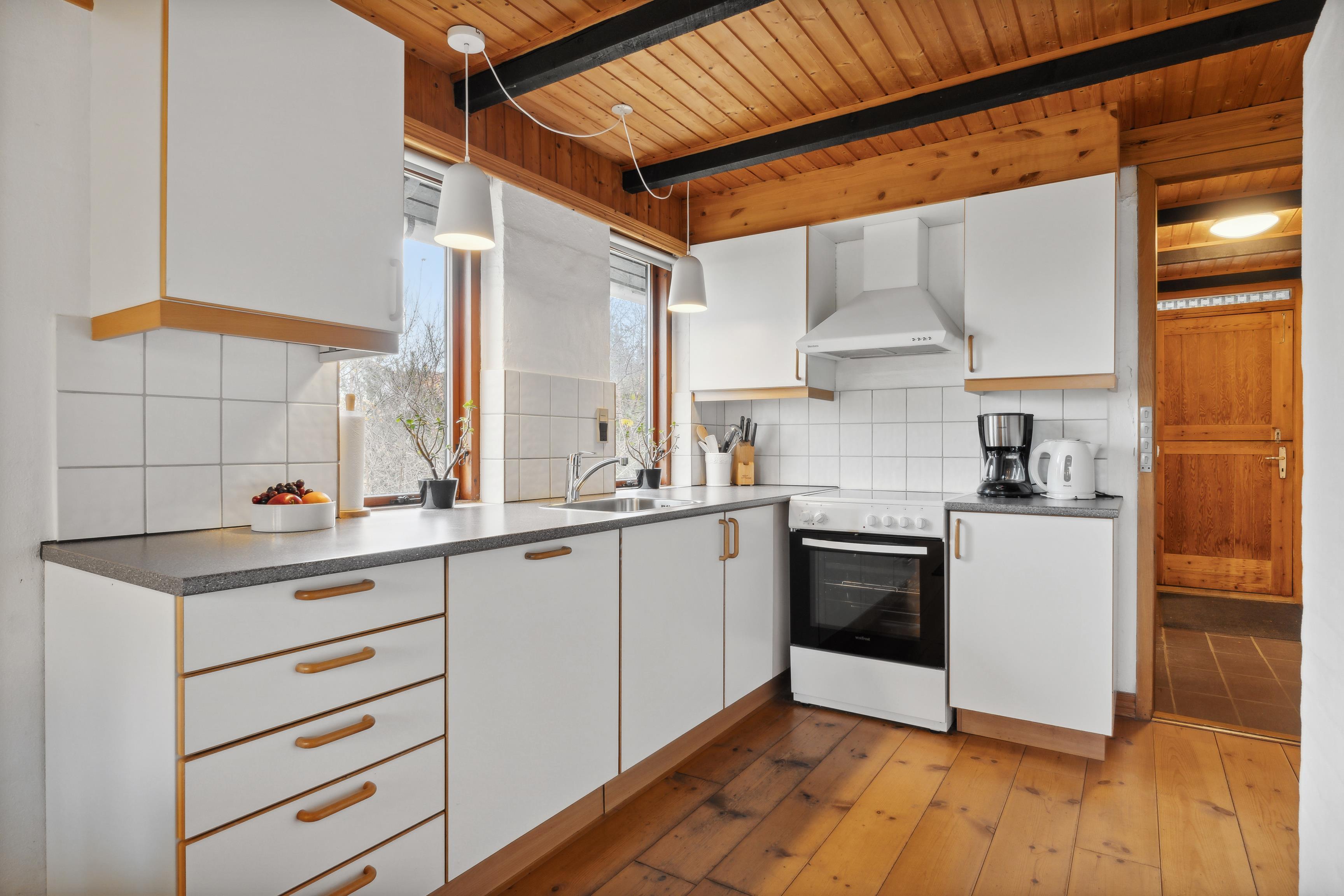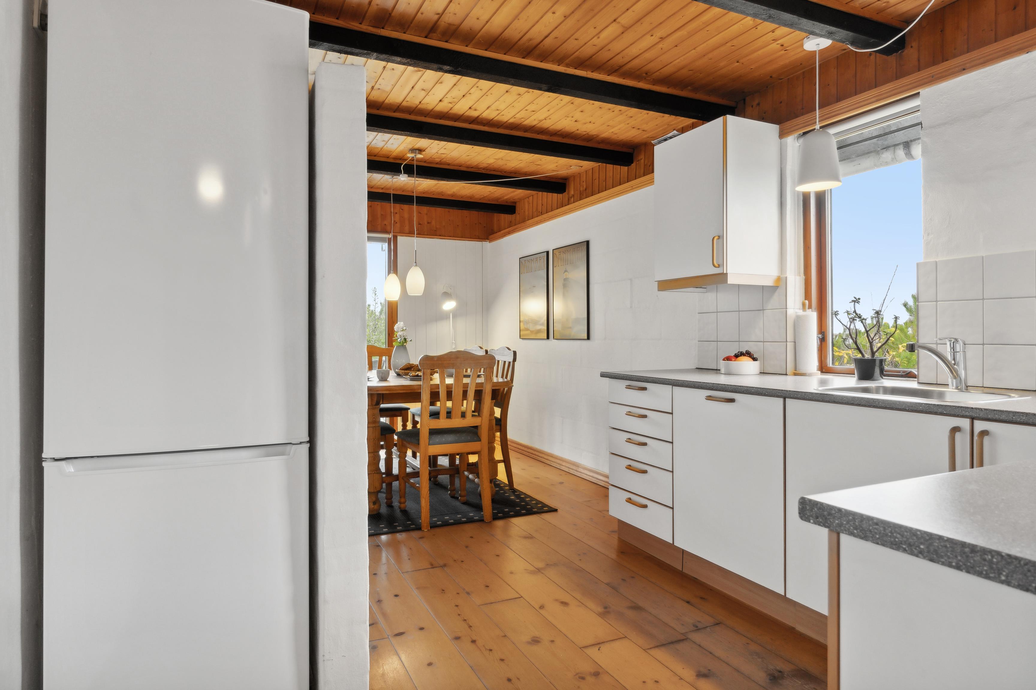Indretning i stueplan: Huset har en rummelig entré med god plads til sko og overtøj. Badeværelset er ældre, men funktionelt, med en bruseniche. Der er et soveværelse med trægulve og nyere senge. Køkkenet er pænt og praktisk med masser af bordplads og en opvaskemaskine. Det ligger i åben forbindelse med stuen, som byder på spiseplads, brændeovn, fjernsyn og en hyggelig sofagruppe. Fra både køkkenet og stuen kan I nyde den enestående udsigt over Nissum Fjord.