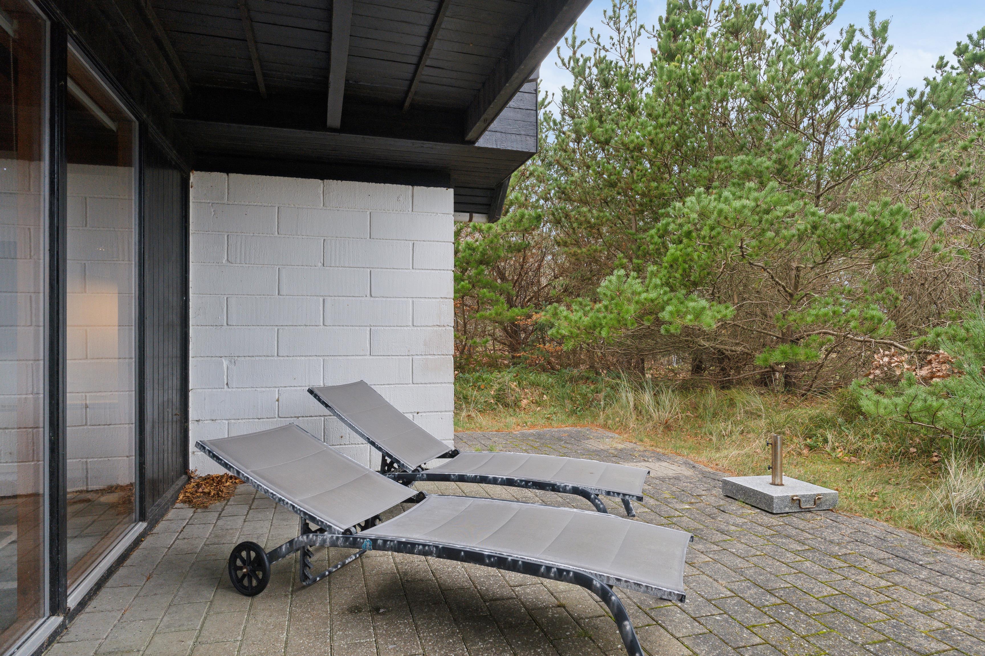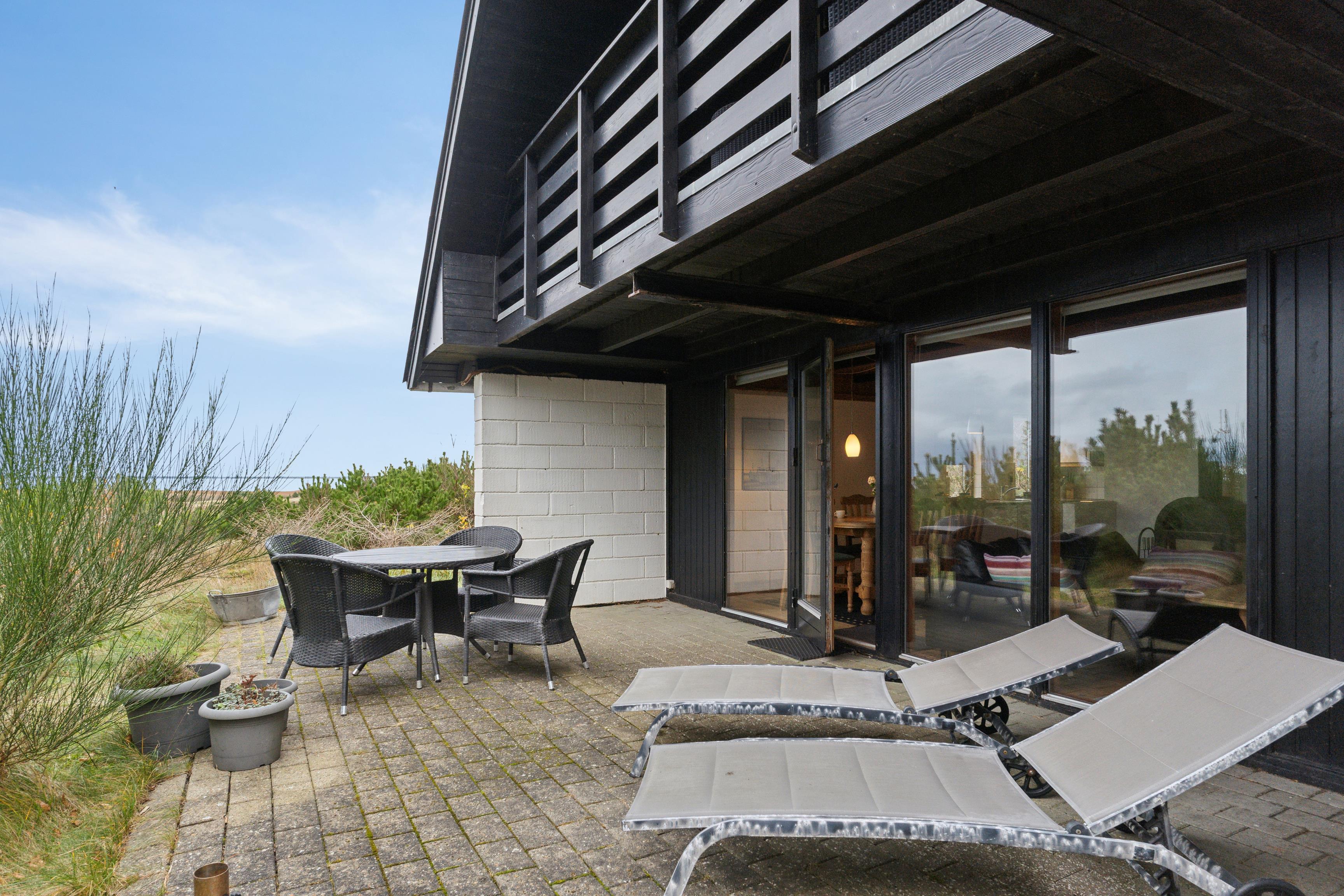 Huset er omgivet af flere terrasser og hyggelige lækroge, hvor I kan finde ro og nyde omgivelserne. Mod øst ligger en stor solgård, indrettet med komfortable havemøbler, blomsterkrukker og liggestole – ideel til at nyde solen og et sikkert sted for børn og hunde at lege frit.