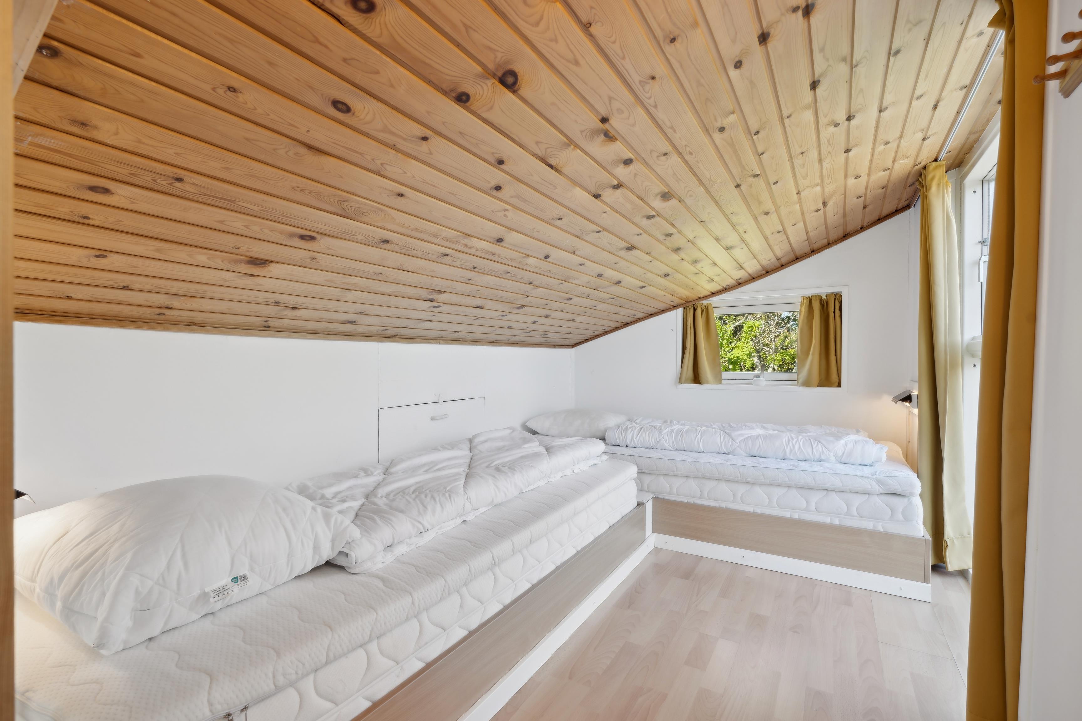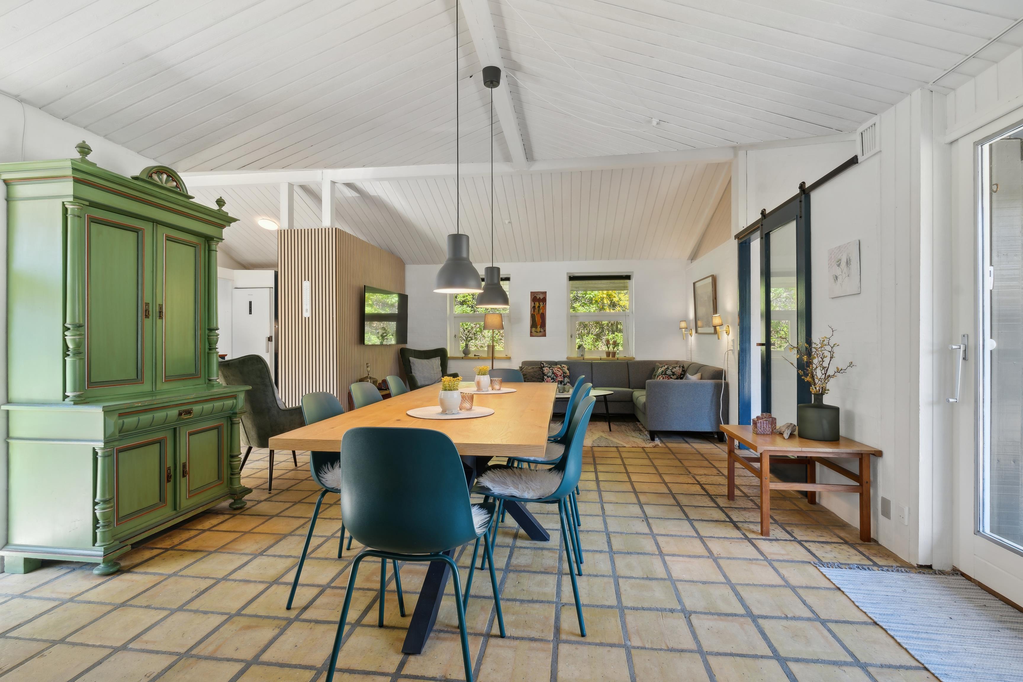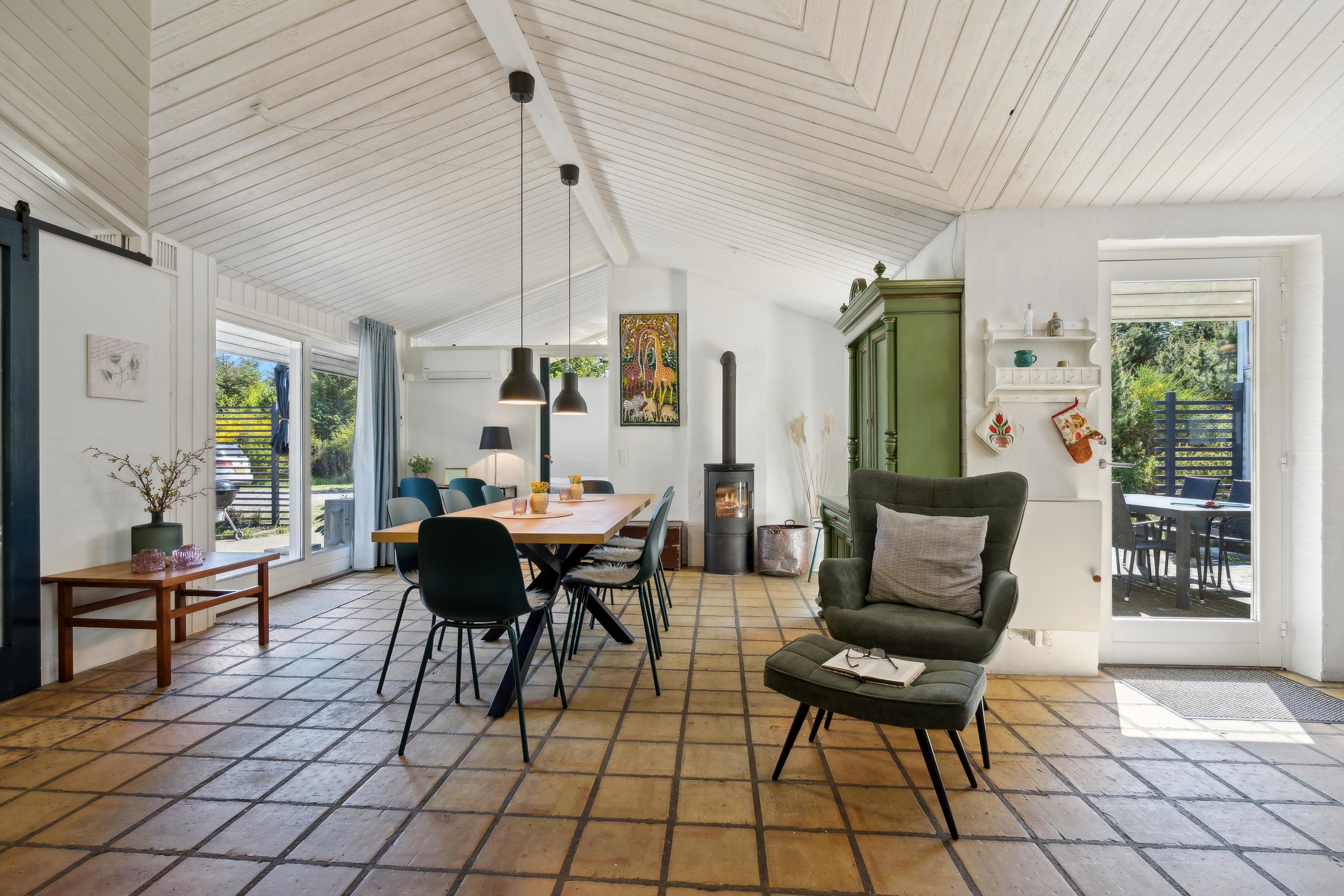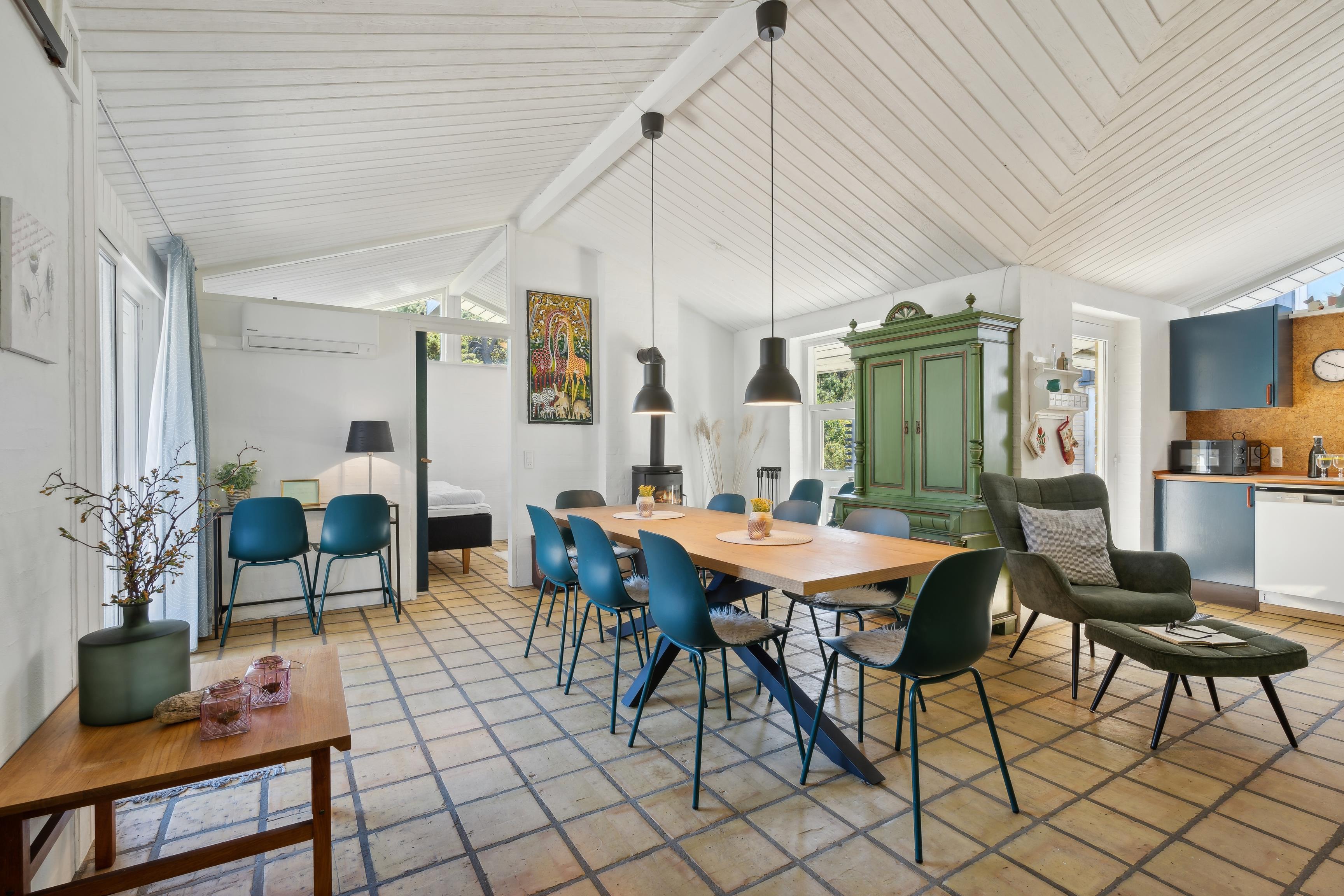 Dette charmerende sommerhus med ægte sommerhusstemning indbyder til god underholdning og leg i aktivitetsrummet samt afslapning foran brændeovnen i den hyggelige stue. Sommerhuset er delt op i 2 afdelinger. En afdeling med 3 værelser, stue, køkken og et badeværelse med bruser. Den anden afdeling har aktivitetsrum, et værelse med dobbeltseng, et badeværelse med badekar samt en hems med to enkelt senge. Der er en god trappe op til hemsen. Fra hemsen er der udgang til en lille altan, hvor kaffen kan nydes mellem trætoppene. I sommerhusets aktivitetsrum er der god mulighed for at konkurrere i bordtennis, bordfodbold eller bob. Der er 2 varmepumper i sommerhuset, et i hver afdeling. I alt 10 personer med maksimalt 3 kæledyr kan nyde og slappe af på ferien her.