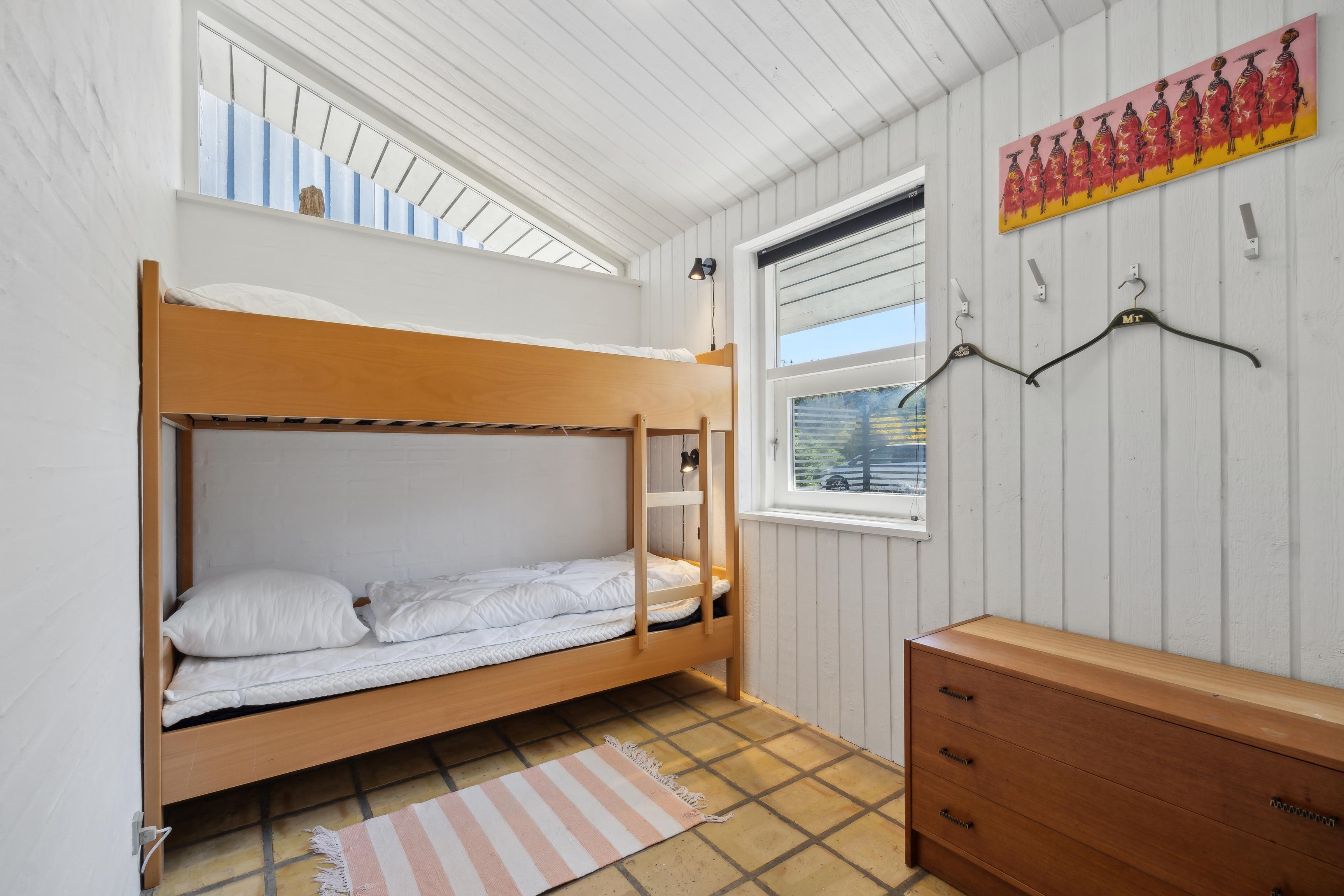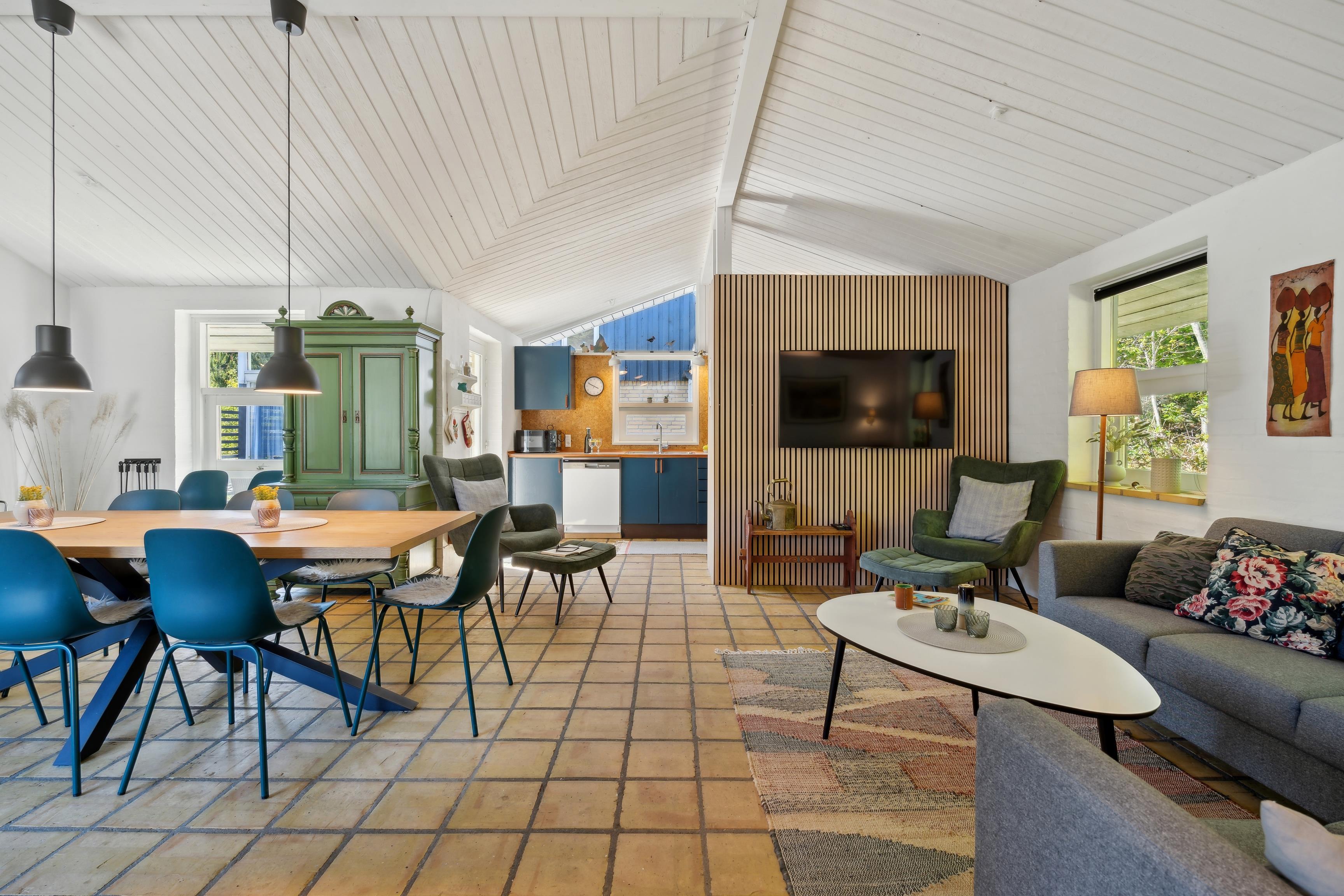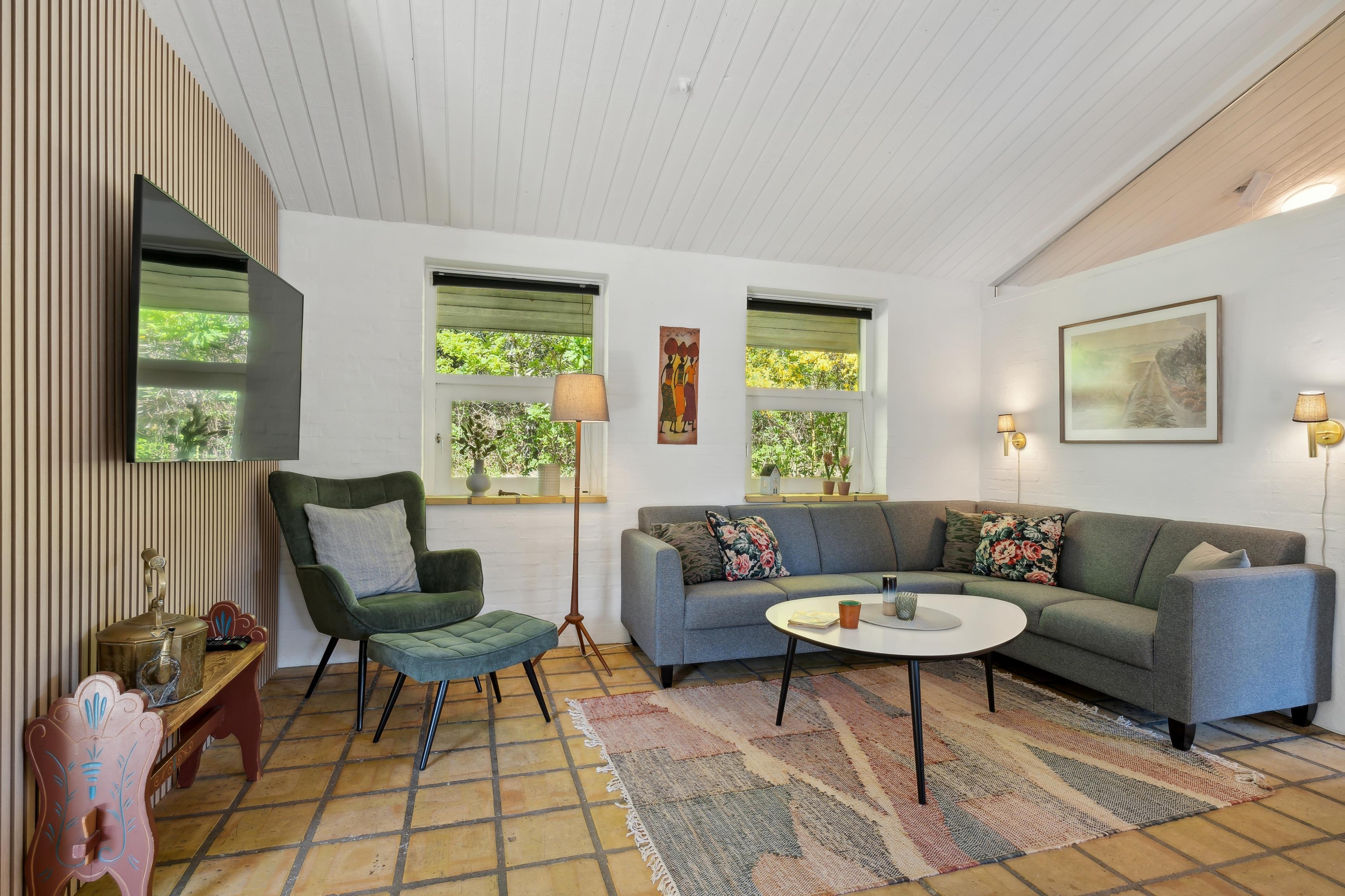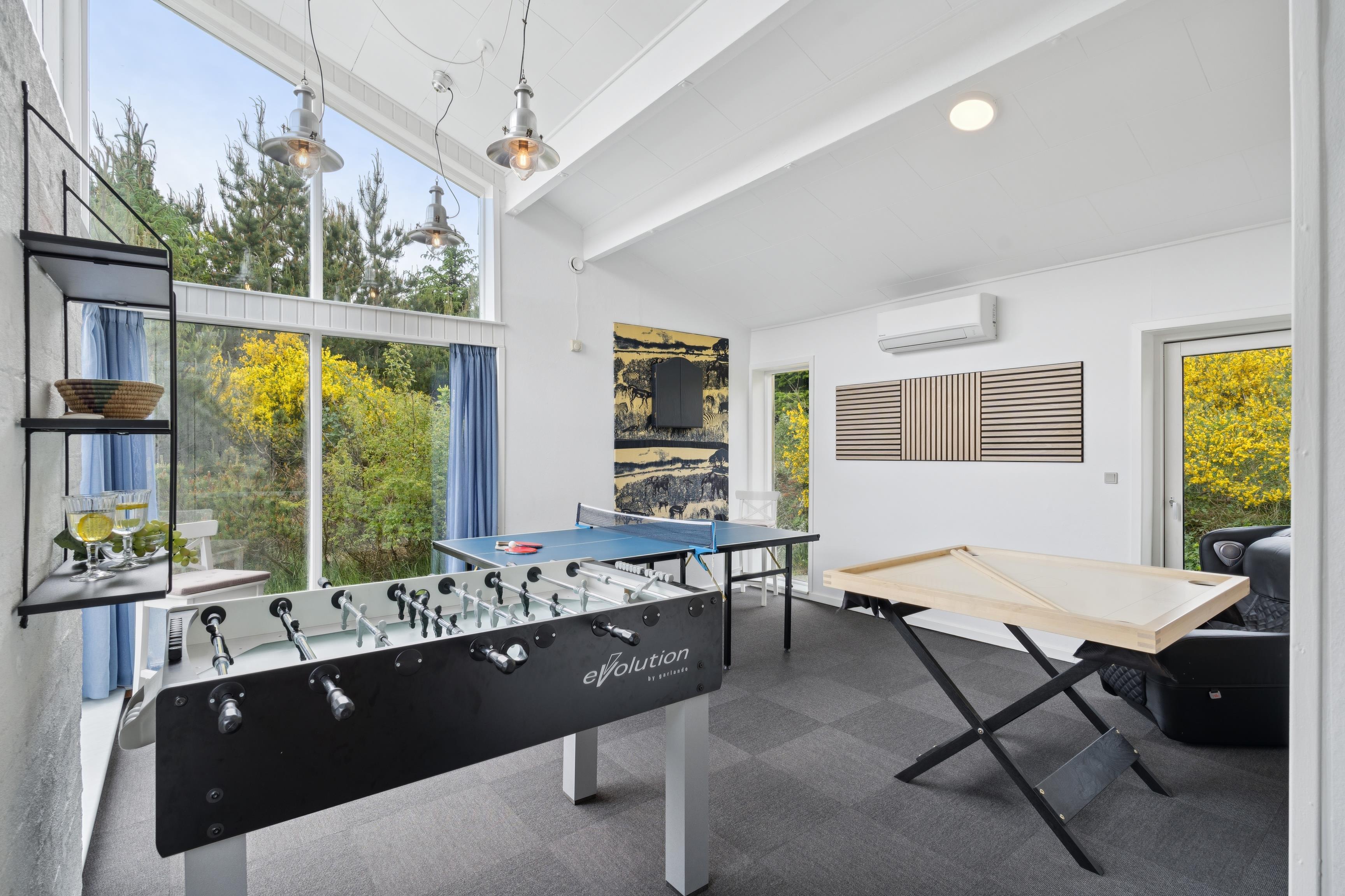 Dette charmerende sommerhus med ægte sommerhusstemning indbyder til god underholdning og leg i aktivitetsrummet samt afslapning foran brændeovnen i den hyggelige stue. Sommerhuset er delt op i 2 afdelinger. En afdeling med 3 værelser, stue, køkken og et badeværelse med bruser. Den anden afdeling har aktivitetsrum, et værelse med dobbeltseng, et badeværelse med badekar samt en hems med to enkelt senge. Der er en god trappe op til hemsen. Fra hemsen er der udgang til en lille altan, hvor kaffen kan nydes mellem trætoppene. I sommerhusets aktivitetsrum er der god mulighed for at konkurrere i bordtennis, bordfodbold eller bob. Der er 2 varmepumper i sommerhuset, et i hver afdeling. I alt 10 personer med maksimalt 3 kæledyr kan nyde og slappe af på ferien her.