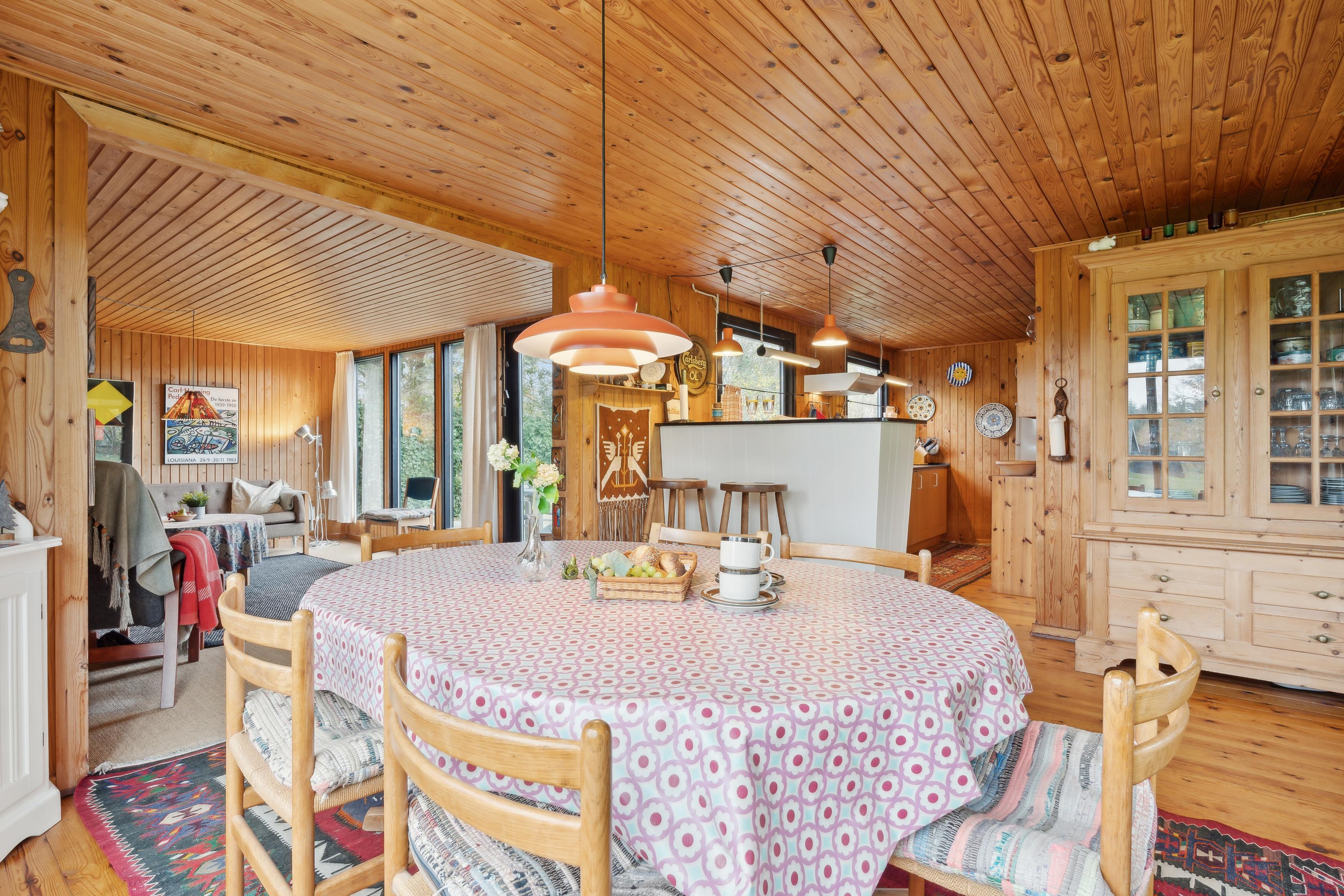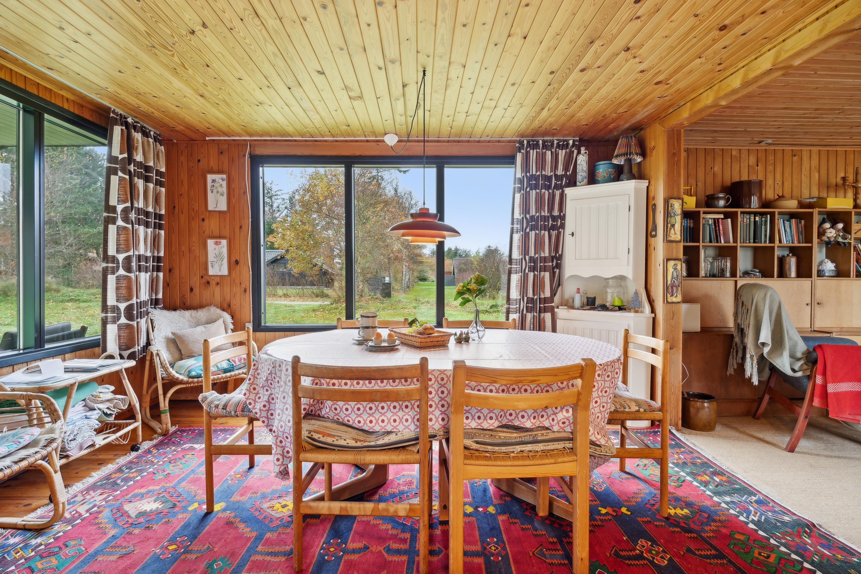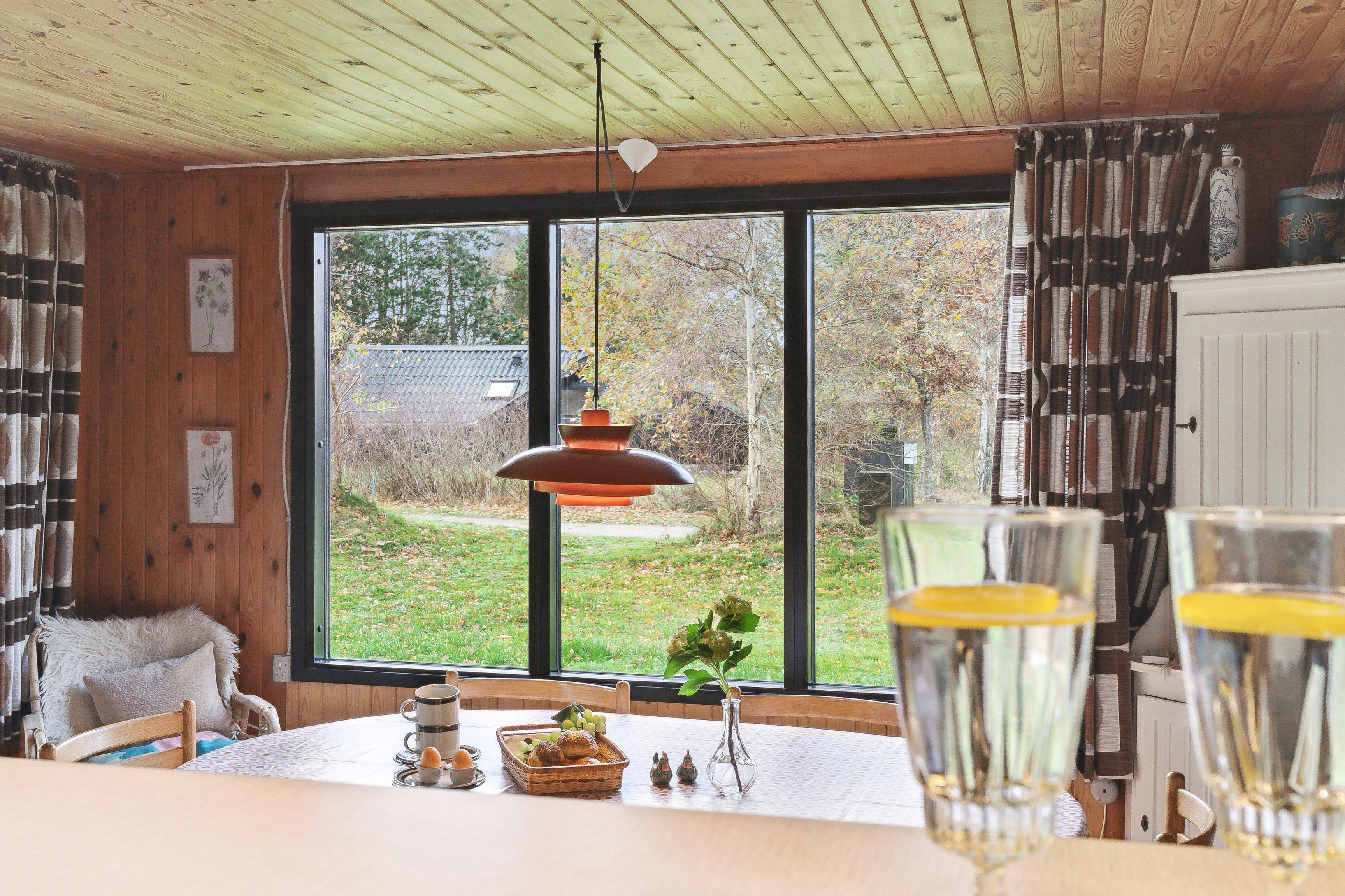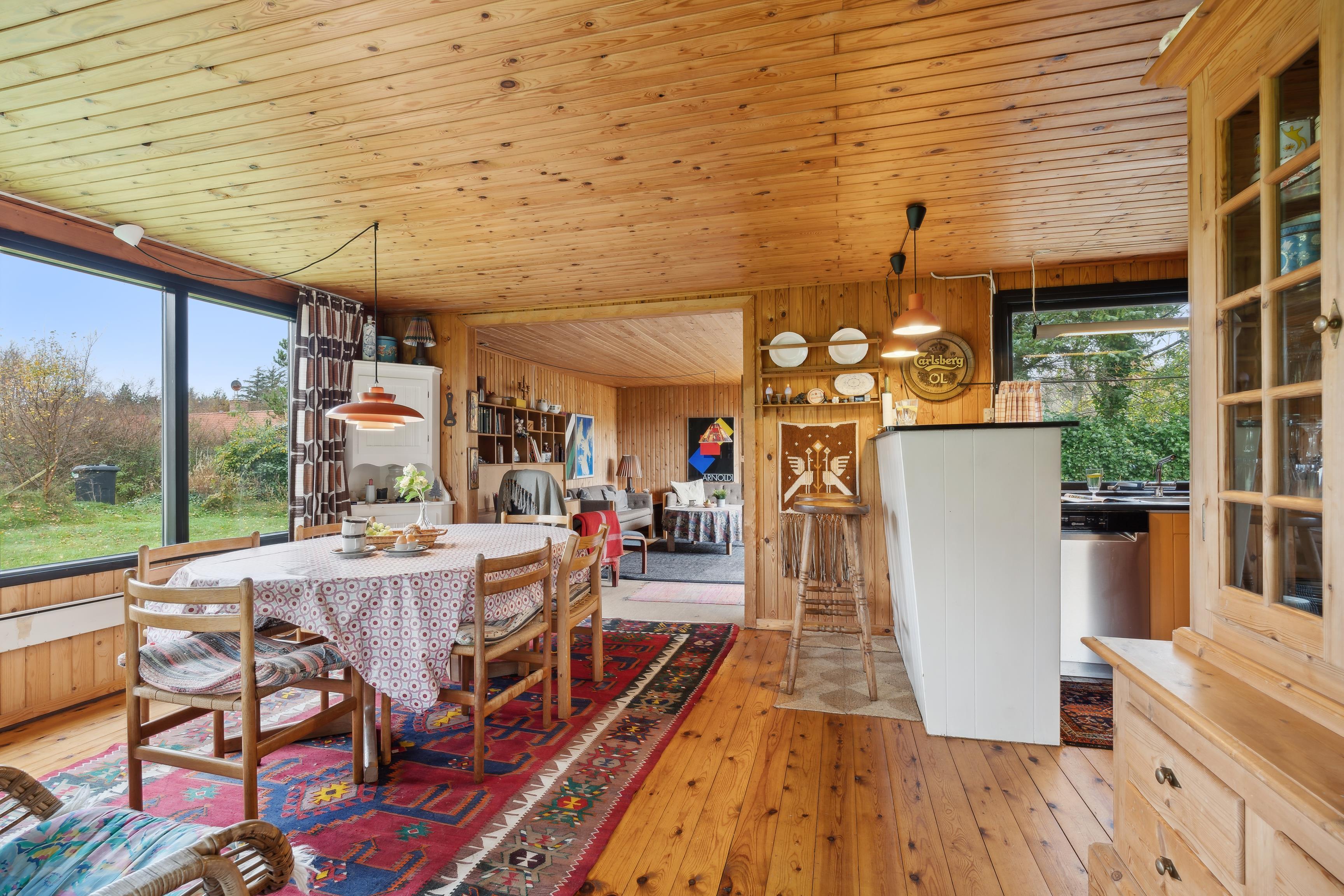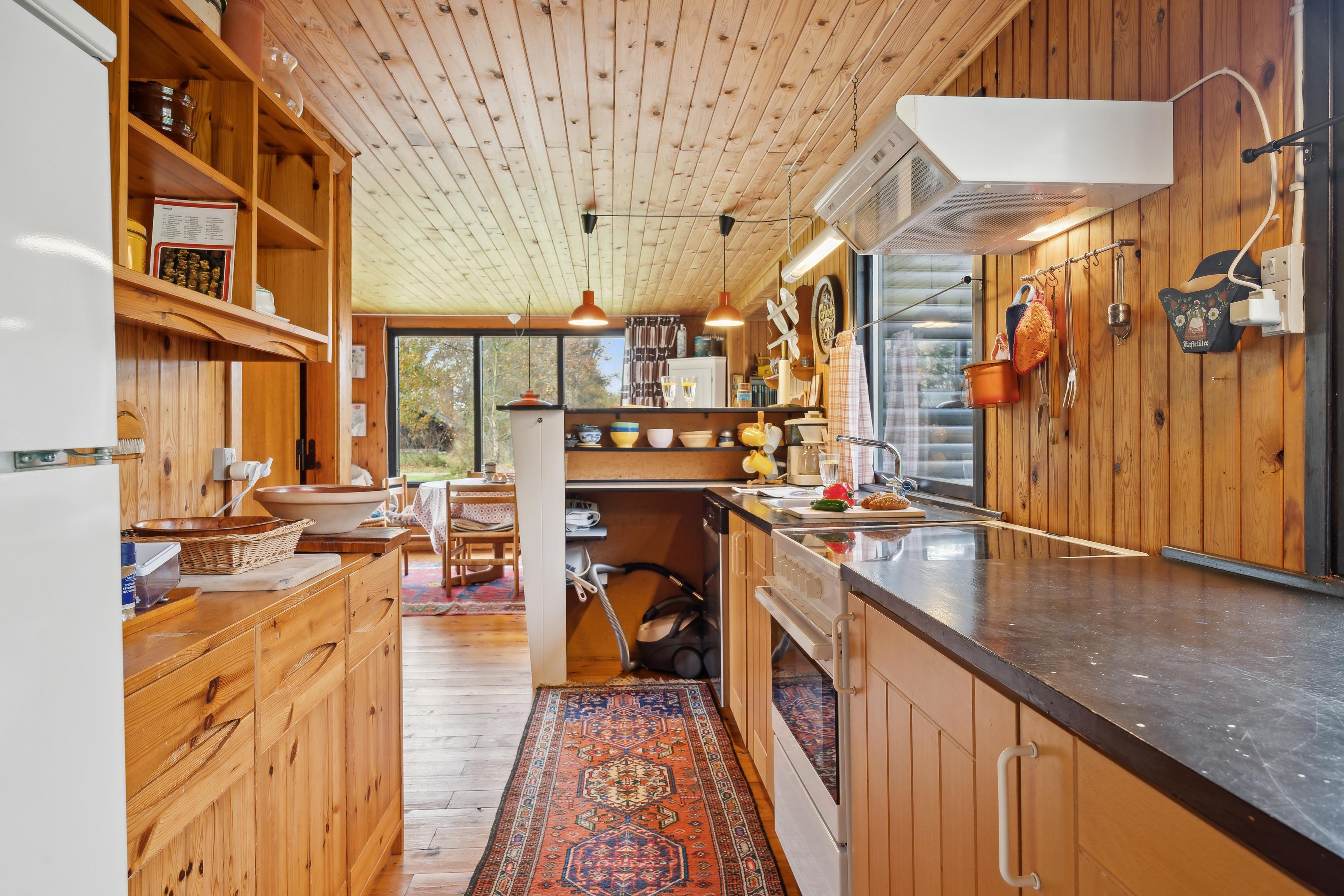 Sommerhuset har et åbent køkken-alrum, der skaber en skøn ramme om familielivet med spise- og opholdsområder. De mange vinduer sørger for et godt lysindfald og en flot udsigt til naturen. Fra stuen er der direkte adgang til den rummelige terrasse, hvor grillen også står klar.