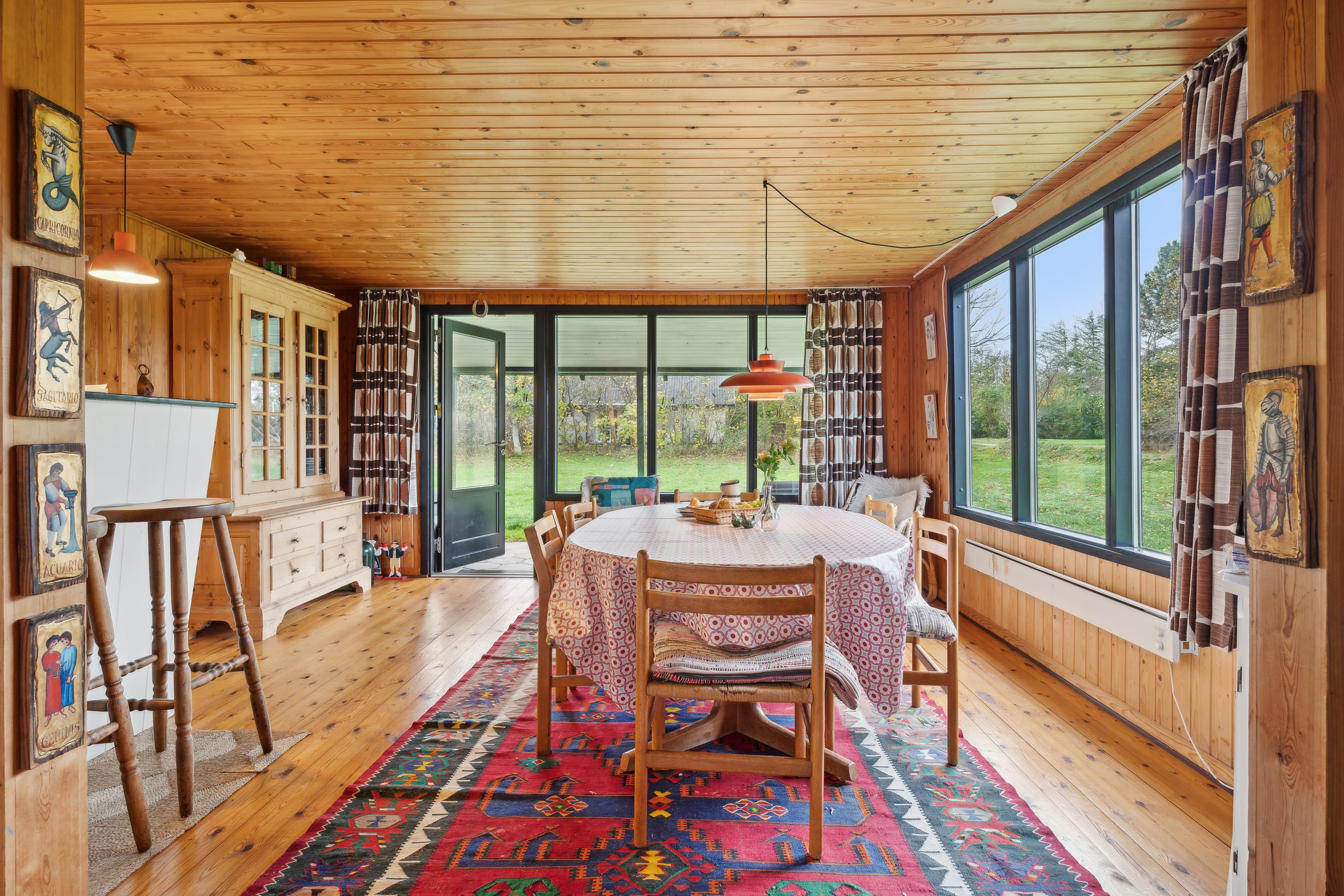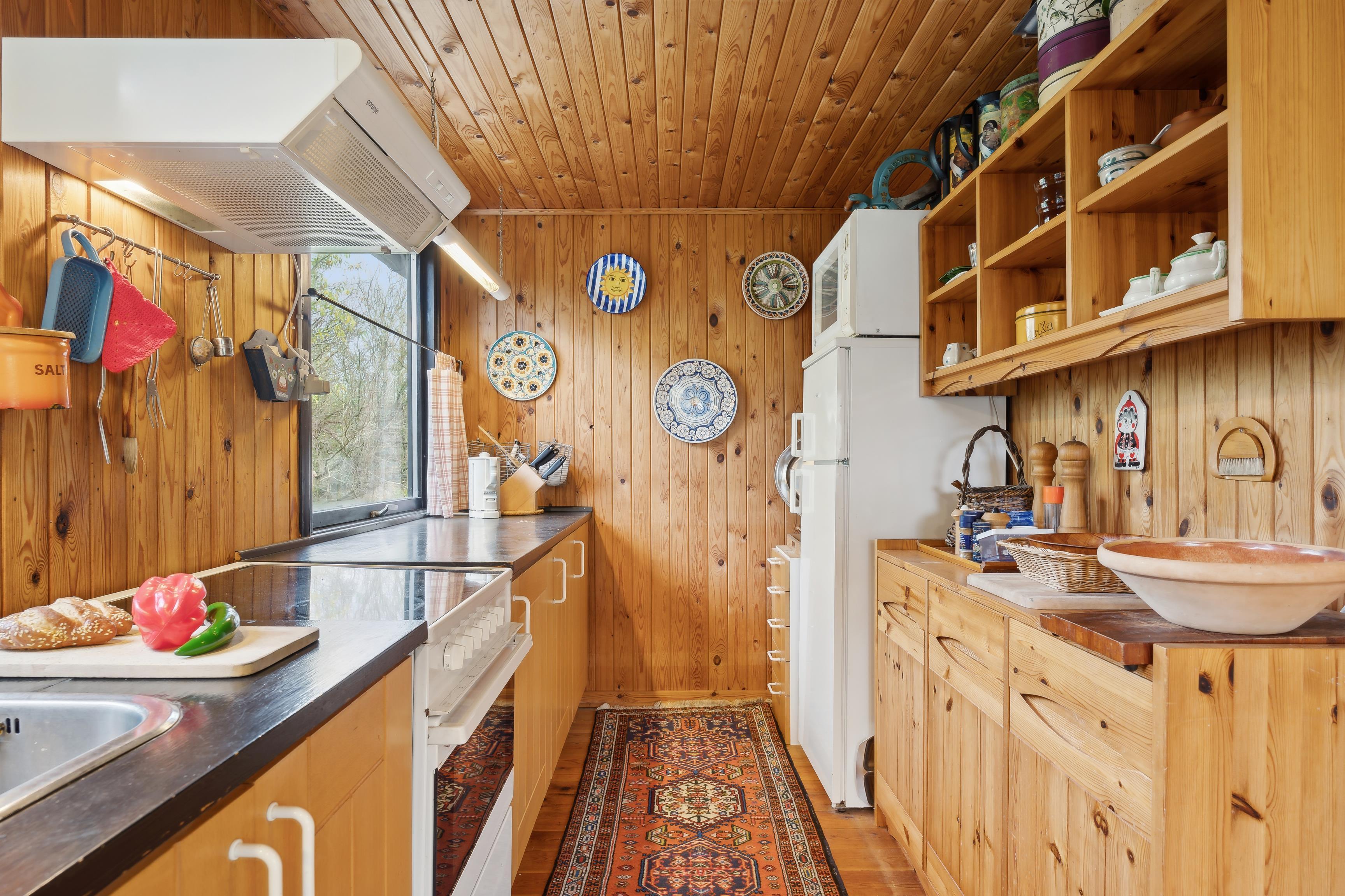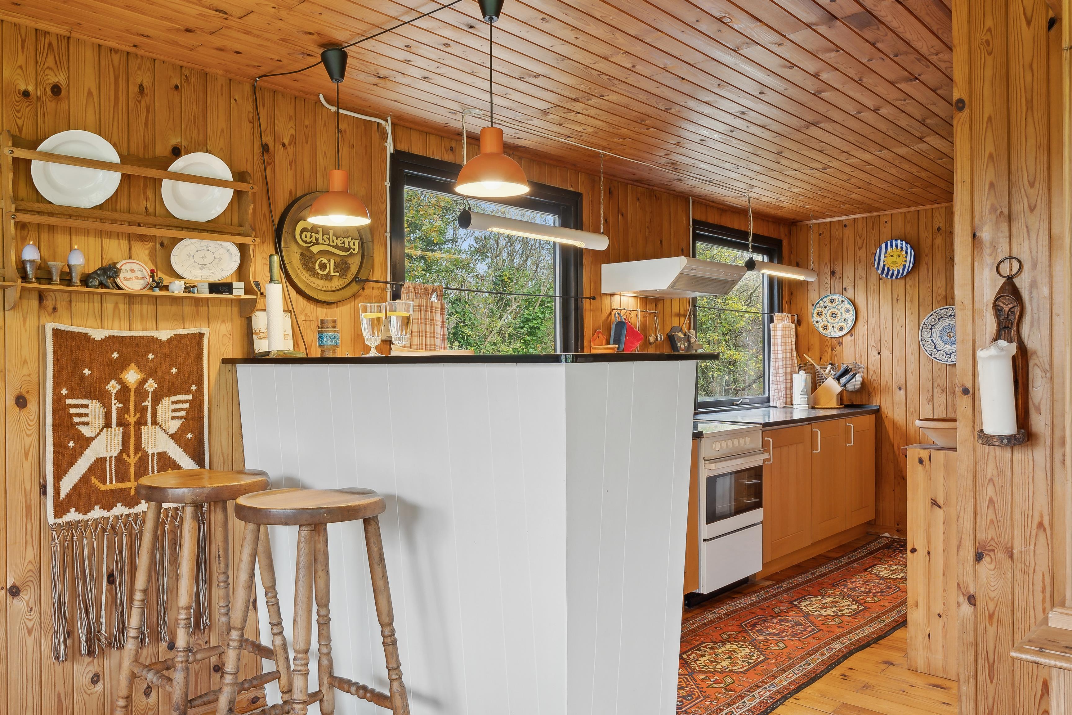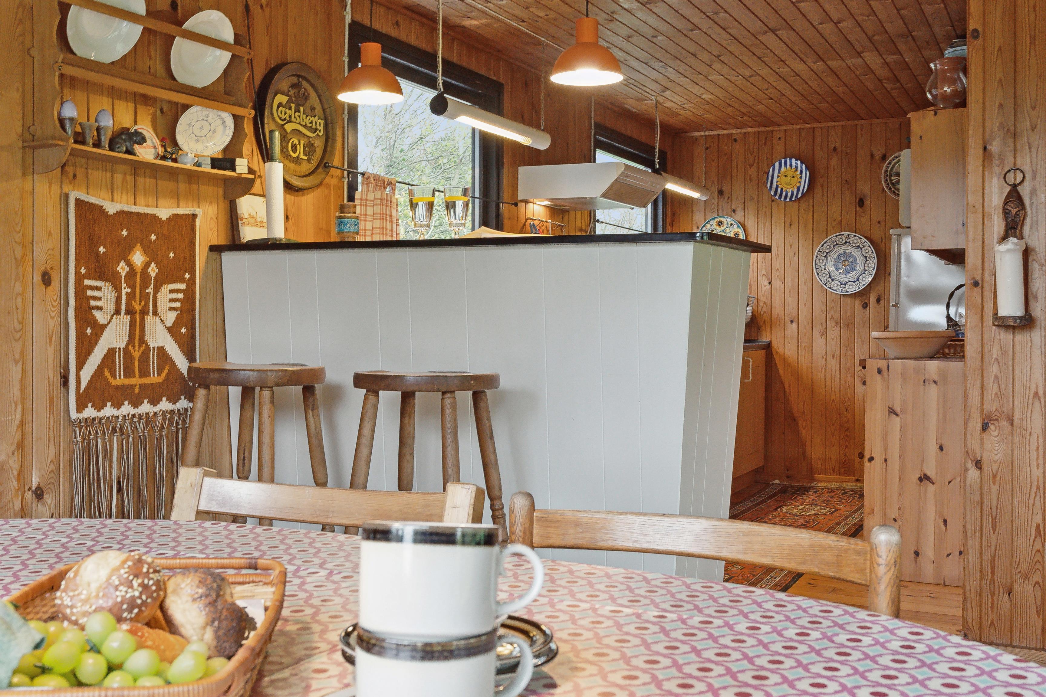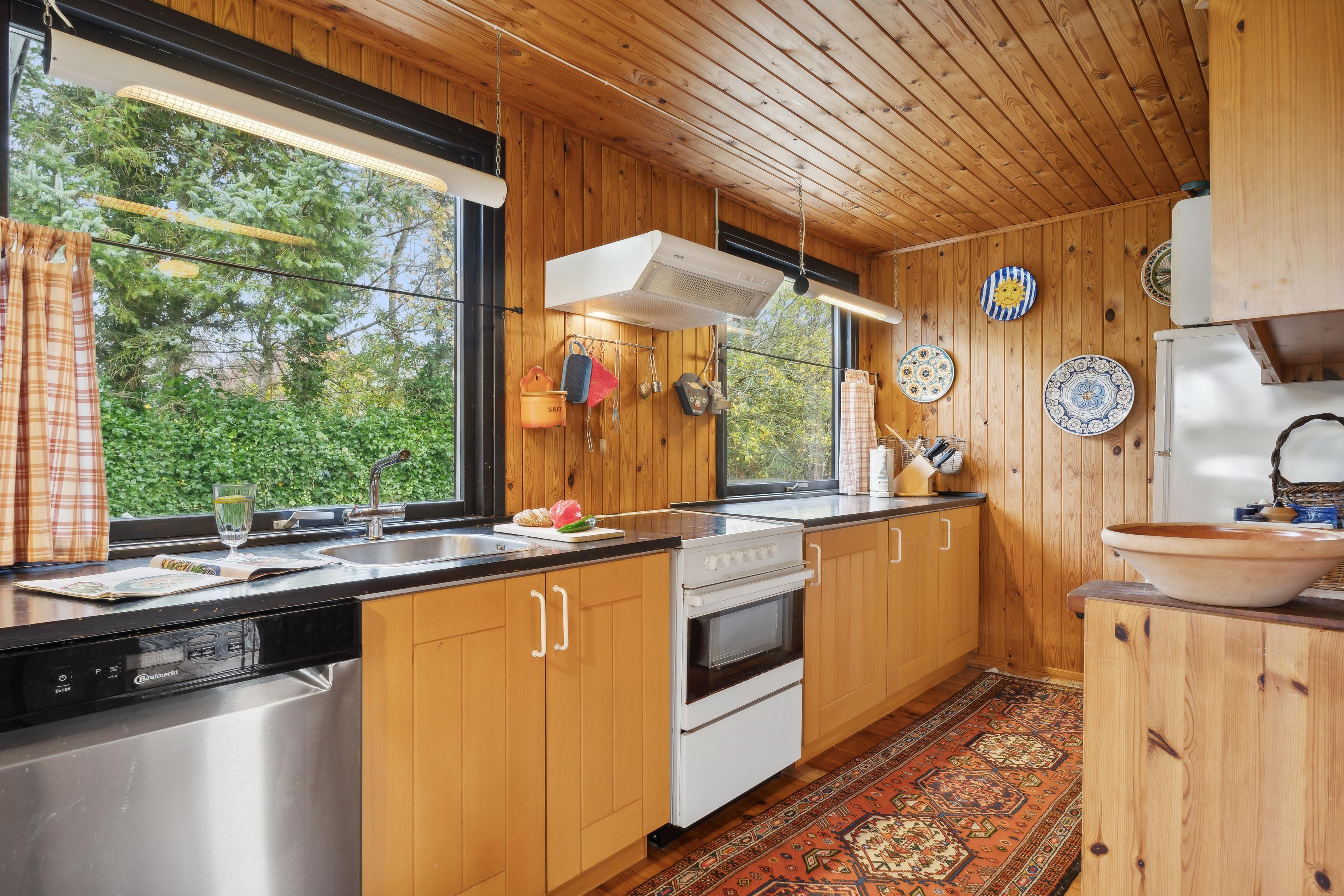 Sommerhuset har et åbent køkken-alrum, der skaber en skøn ramme om familielivet med spise- og opholdsområder. De mange vinduer sørger for et godt lysindfald og en flot udsigt til naturen. Fra stuen er der direkte adgang til den rummelige terrasse, hvor grillen også står klar.