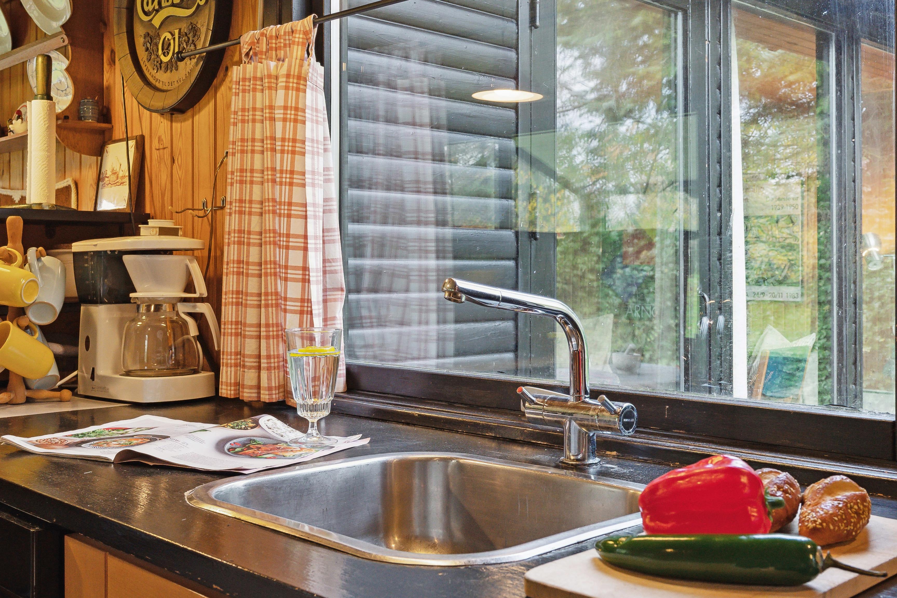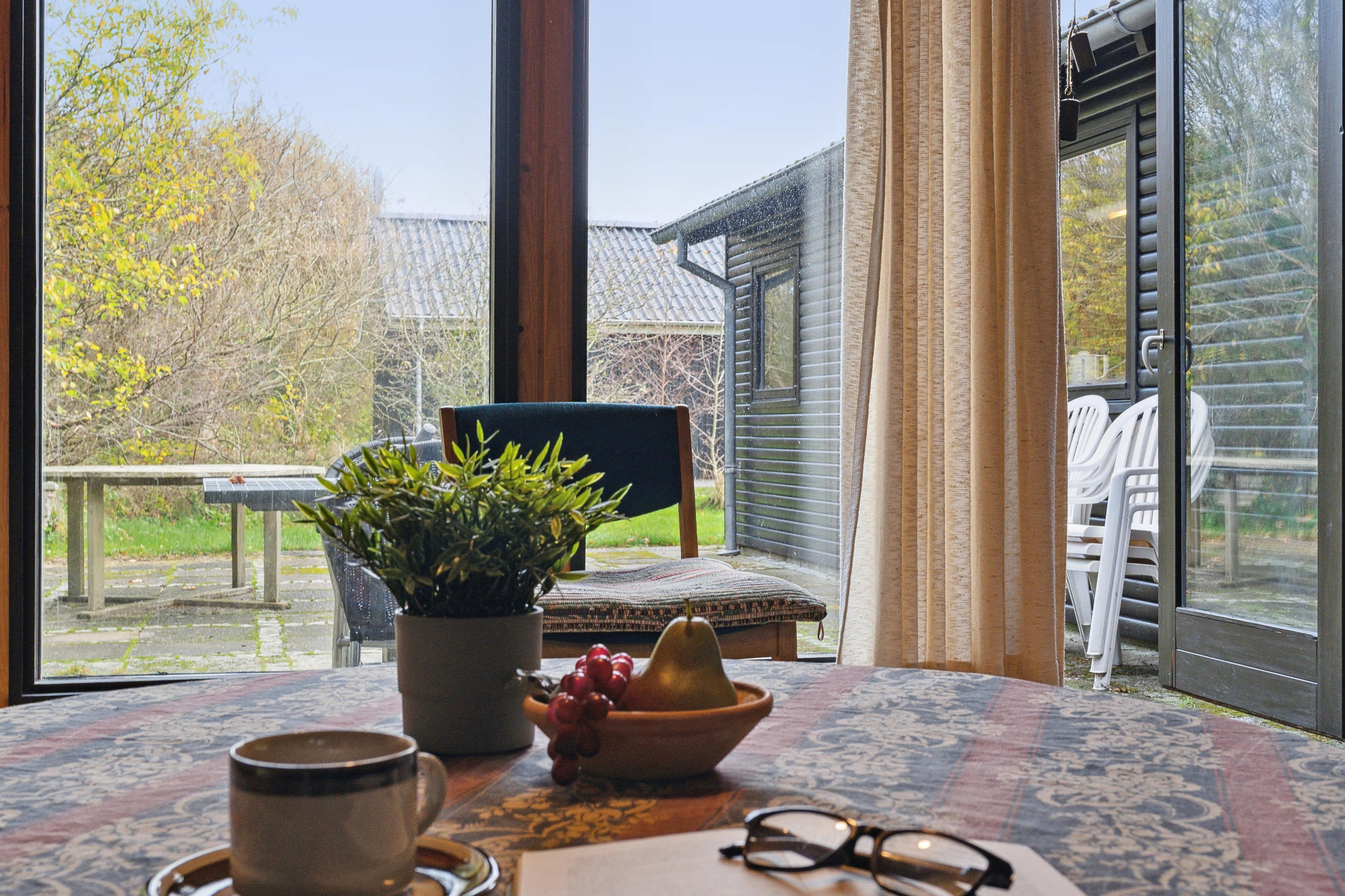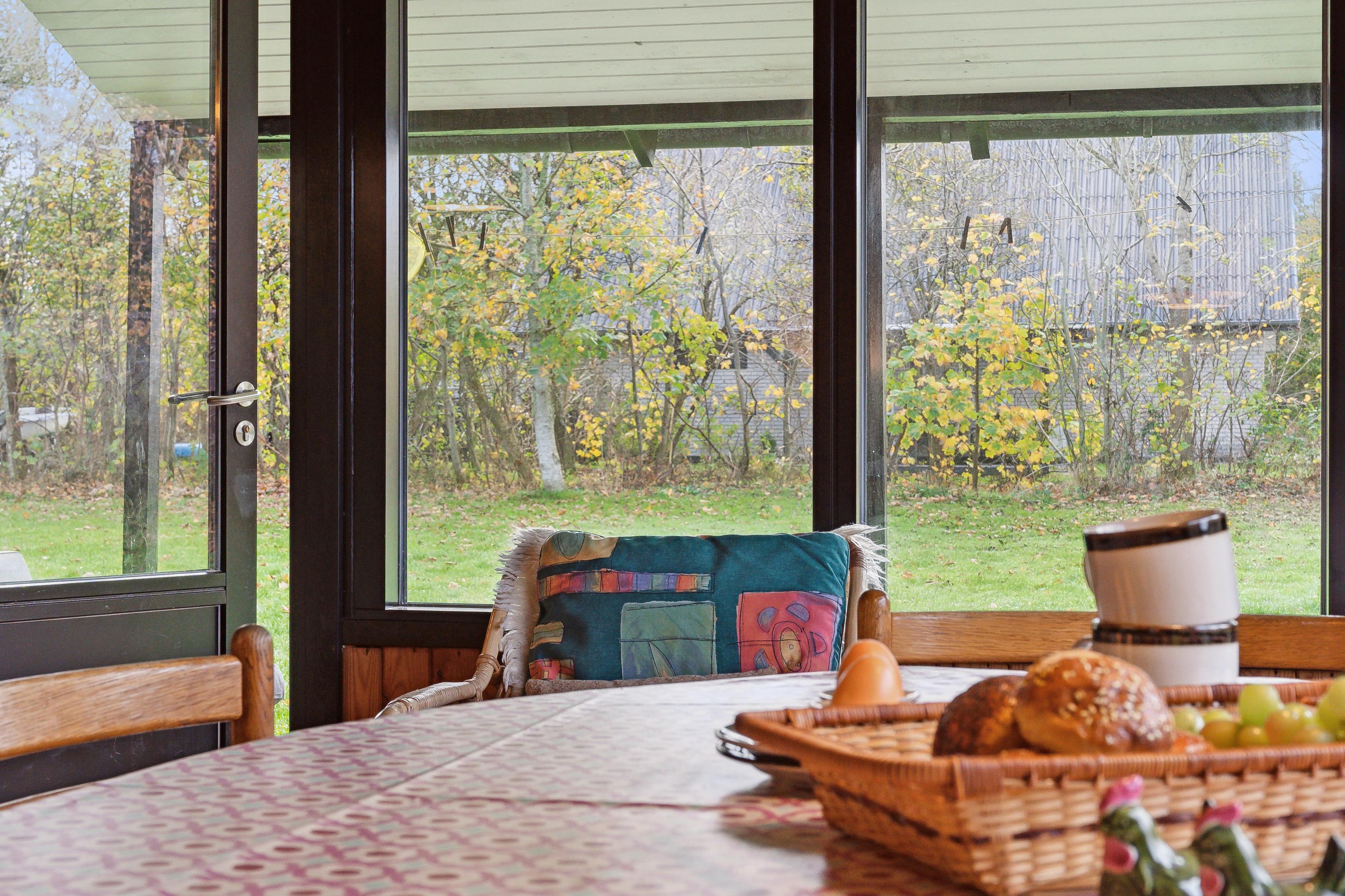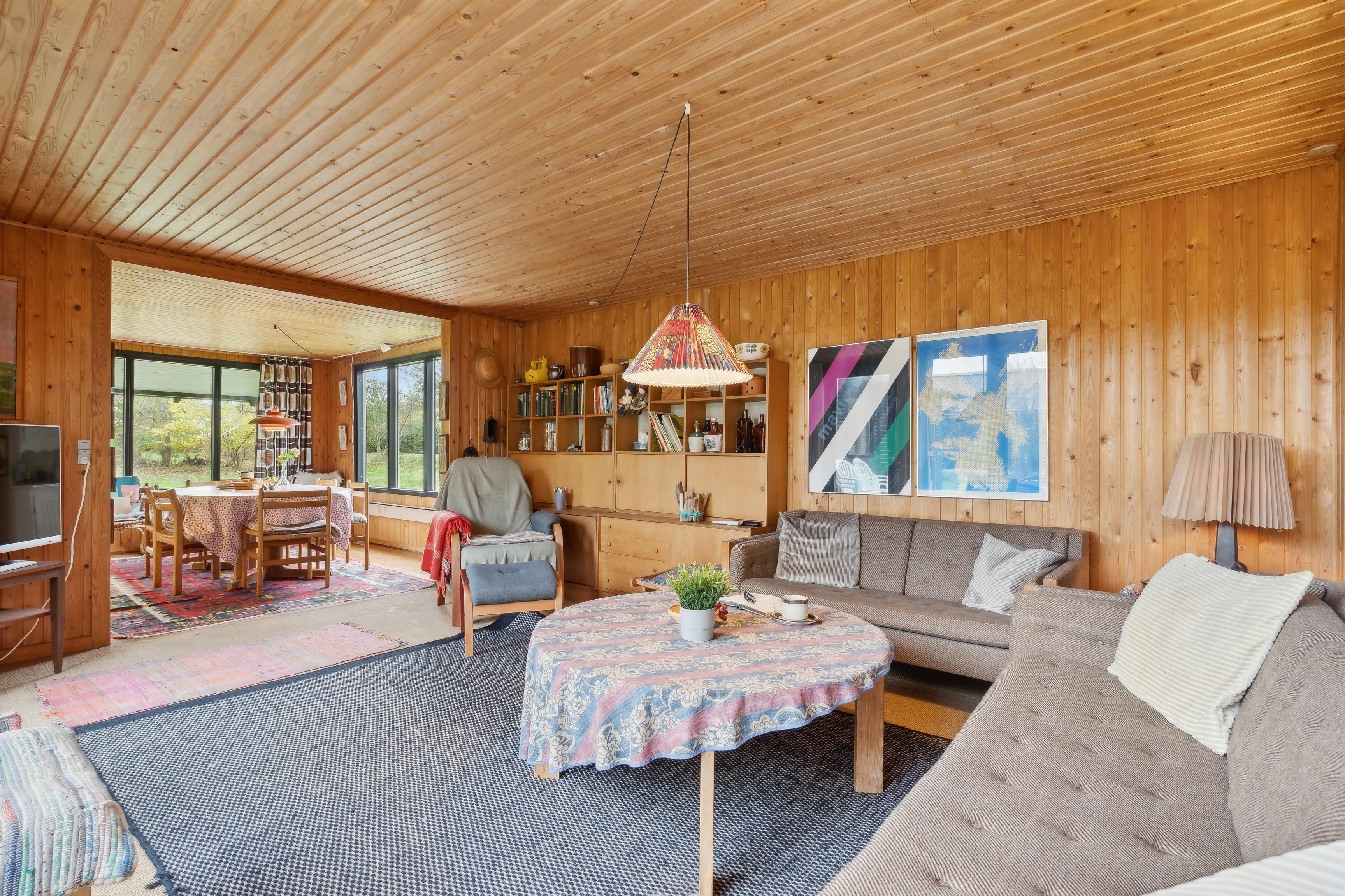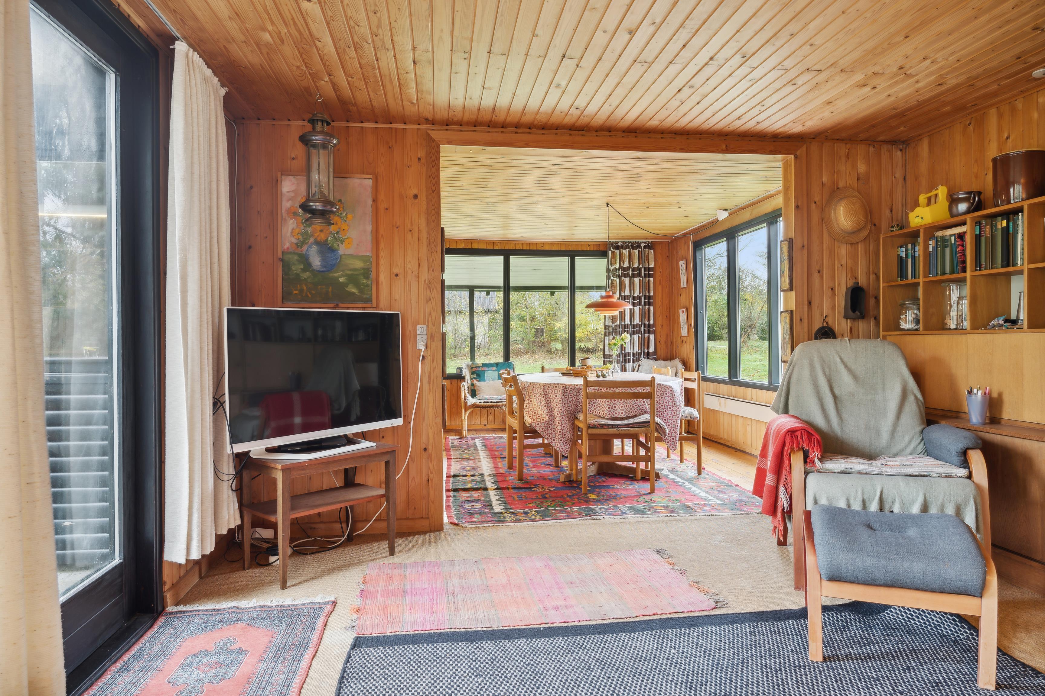 Sommerhuset har et åbent køkken-alrum, der skaber en skøn ramme om familielivet med spise- og opholdsområder. De mange vinduer sørger for et godt lysindfald og en flot udsigt til naturen. Fra stuen er der direkte adgang til den rummelige terrasse, hvor grillen også står klar.