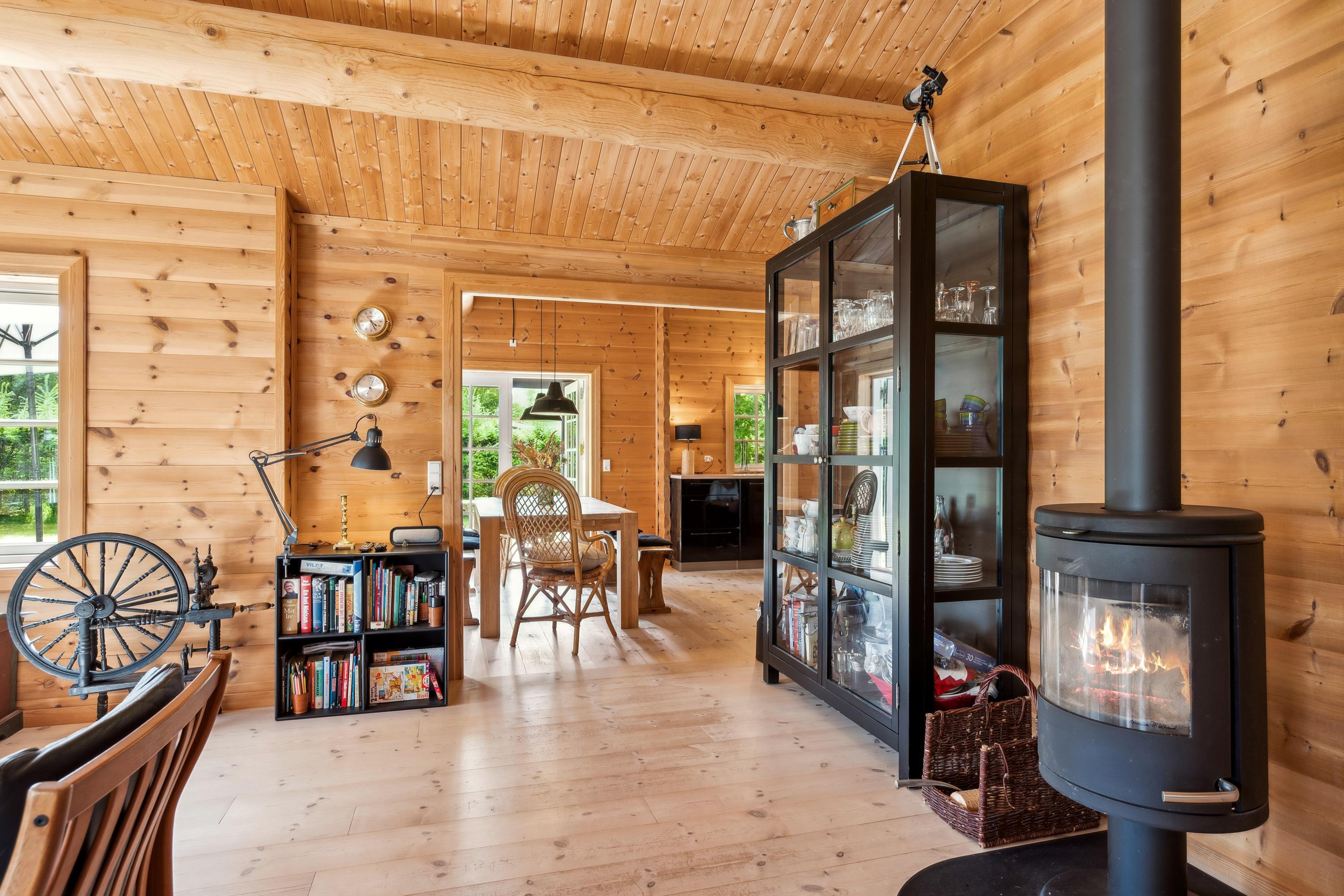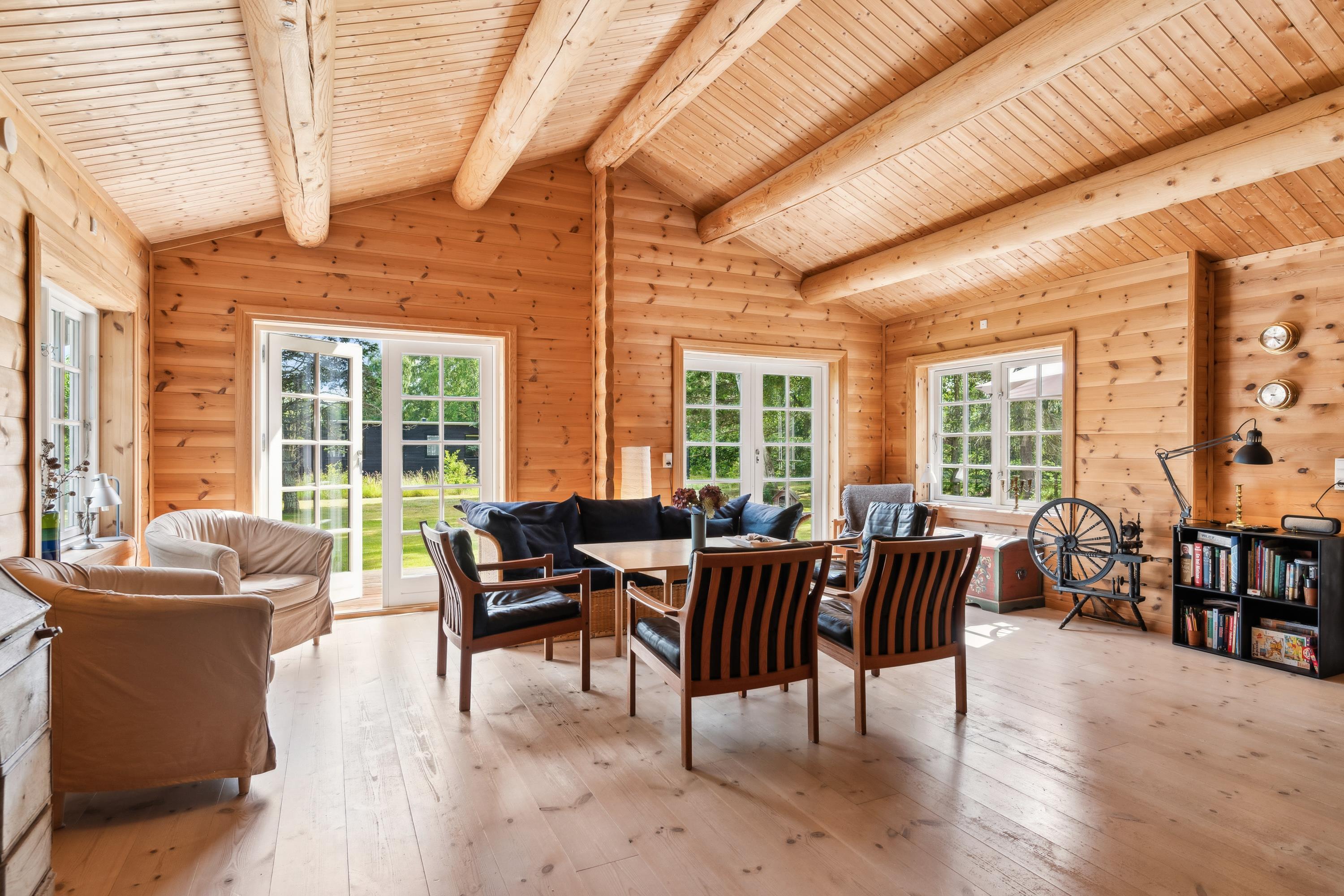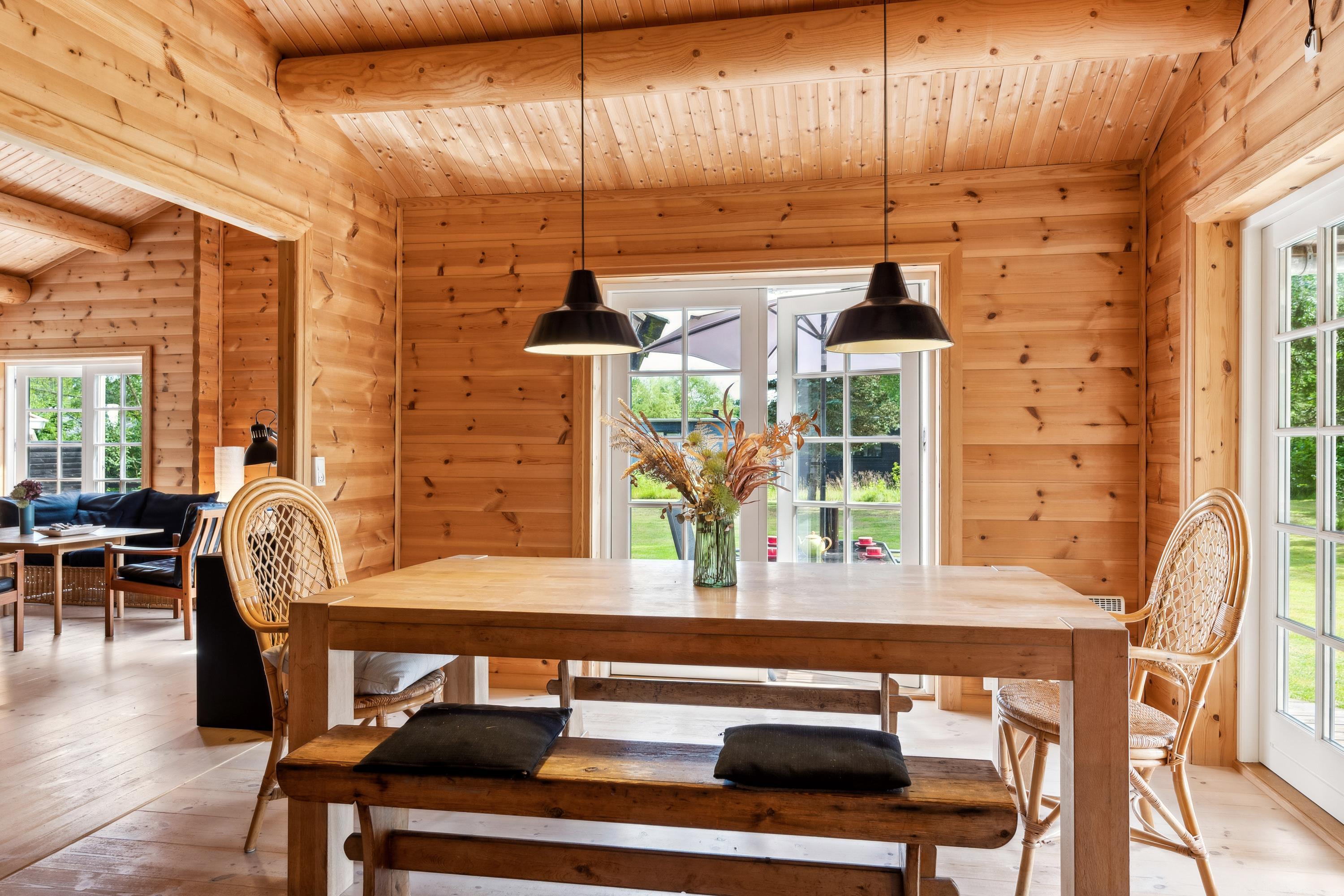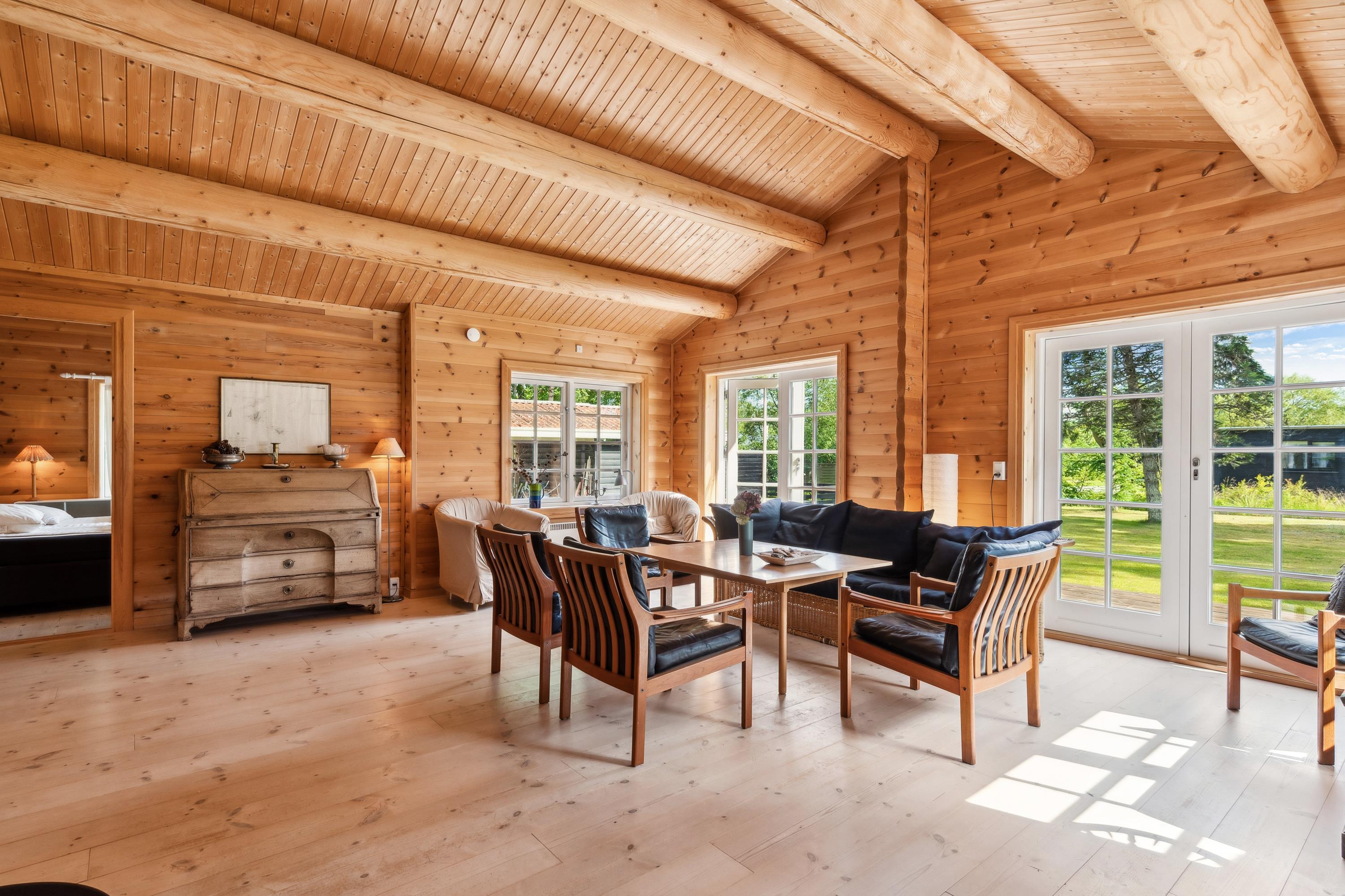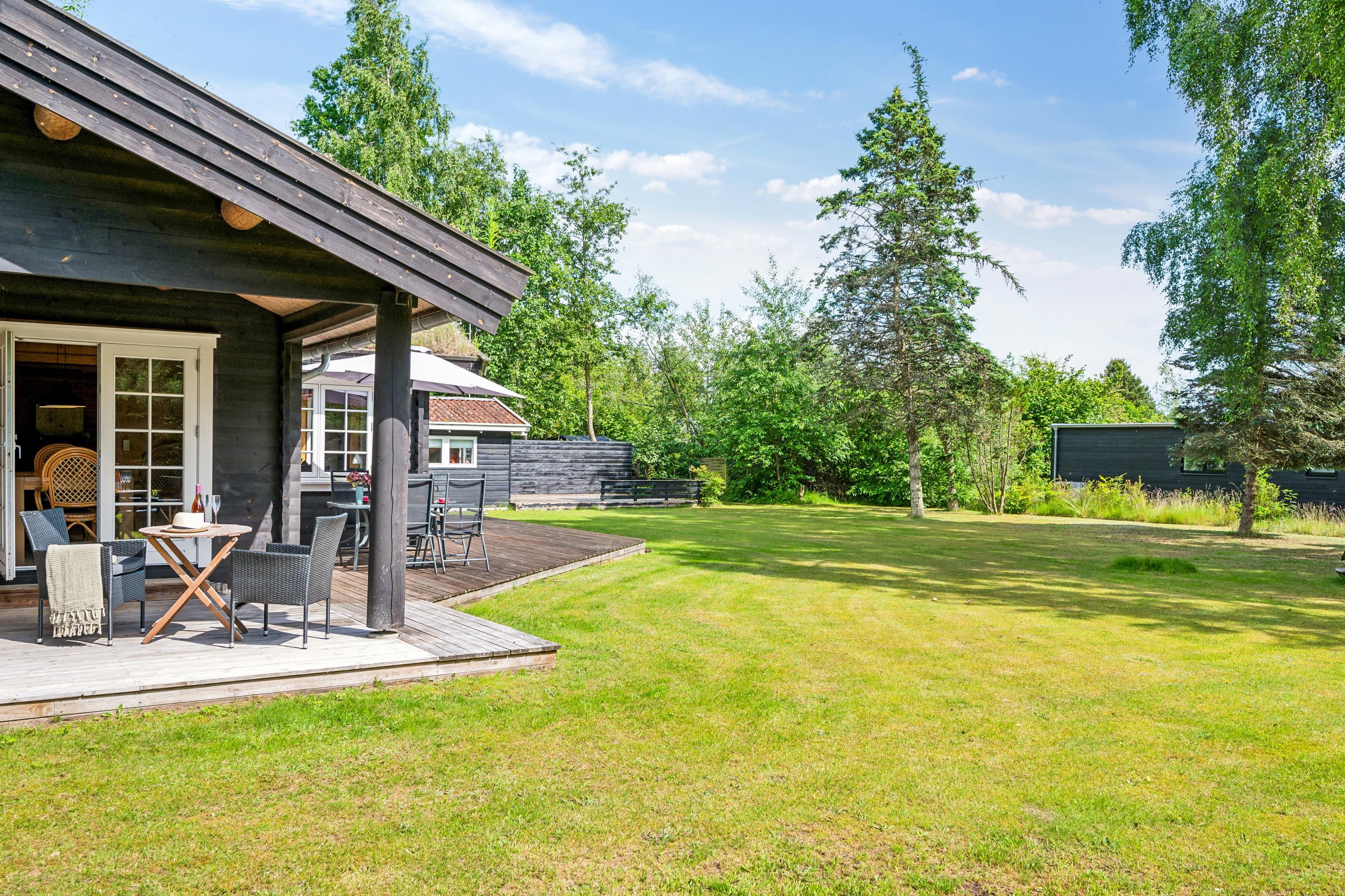 Sort, norsk bjælkehus beliggende på stor og naturligt afskærmet naturgrund med god plads til udendørsaktiviteter. Skønne omgivelser tæt på børnevenlig strand og med stor, delvis overdækket terrasse med havemøbler og grill, der går hele vejen rundt om huset. Huset fremstår lyst og venligt med loft og store bjælker til kip. Stor, dejlig stue med brændeovn og TV til streaming fra egen Chromecast. Stuen ligger i åben forbindelse med dejligt køkken og stor spiseafdeling. Køkkenet har stort stålkomfur med 6 gasblus, køleskab med fryser samt opvaskemaskine. I bryggers/indgang desuden vaskemaskine samt tørretumbler. Stort, skønt badeværelse i norsk skifer med stor, flot bruseniche samt lækkert karbad. Husets 6 sovepladser fordeler sig på 2 store soveværelser: 1 med dobbeltseng og 1 med 2 enkeltsenge i huset, hvoraf det ene soveværelse desuden har udgang til terrassen via dobbeltdøre. Desuden er der et anneks ved terrassen med 2 enkeltsenge. Huset er beliggende i et område med mange aktivitetsmuligheder og tæt på mange af Djurslands turistattraktioner så som Djurs Sommerland, Randers Regnskov og Kattegatcentret. Huset er desuden beliggende i et område ideelt for lystfiskeren, hvor især havørreden ofte bider på krogen.