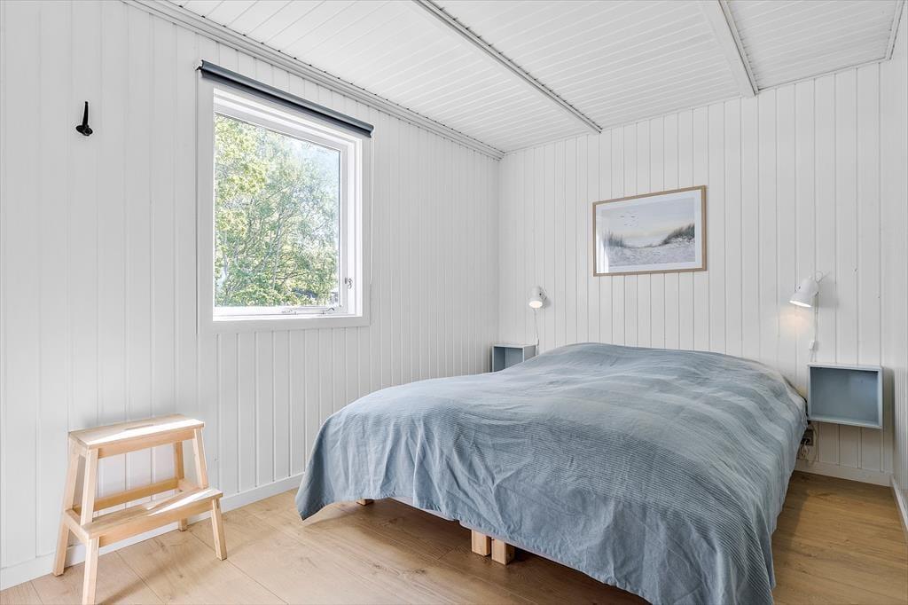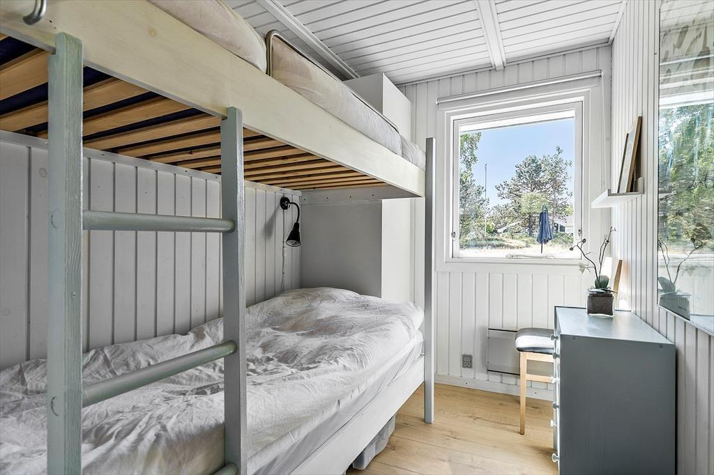 Når I træder indenfor, mødes I af en dejlig atmosfære. Det nyere, funktionelle køkken flyder sammen med spisepladsen og den hyggelige stue i ét åbent rum – her kan familien samles til både madlavning, brætspil og afslappede stunder i sofaen. Fra stuen åbner terrassedøren op til en verden af udendørs oplevelser. I husets anden vinkel finder I tre soveværelser – det ene med dobbeltseng, et andet med køjeseng, og et tredje med enkeltseng – alle med en rolig stemning, der indbyder til god nattesøvn efter dagens eventyr. Badeværelset er praktisk indrettet med både bruser og vaskemaskine, så det er nemt at holde styr på strandtøjet.