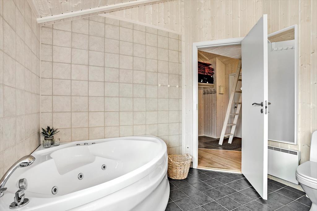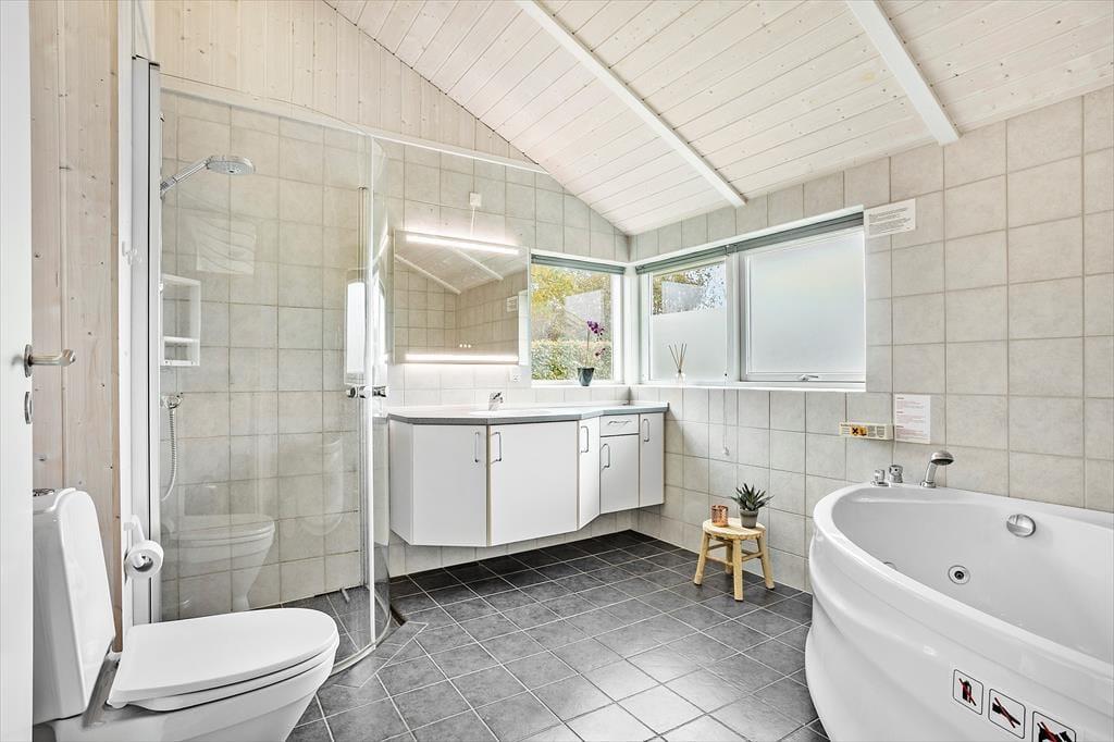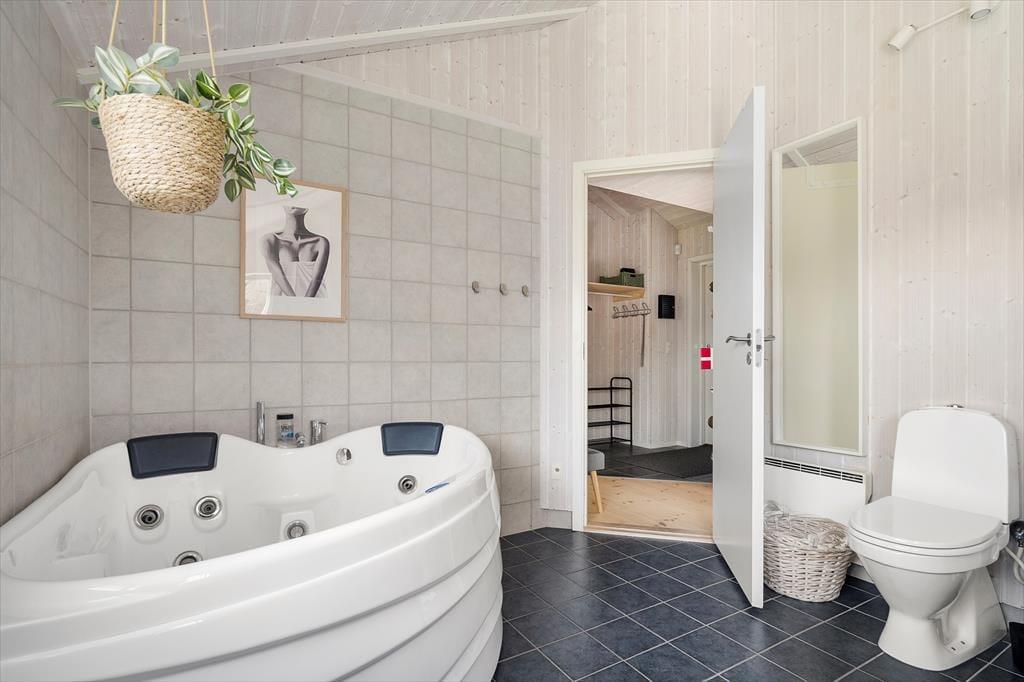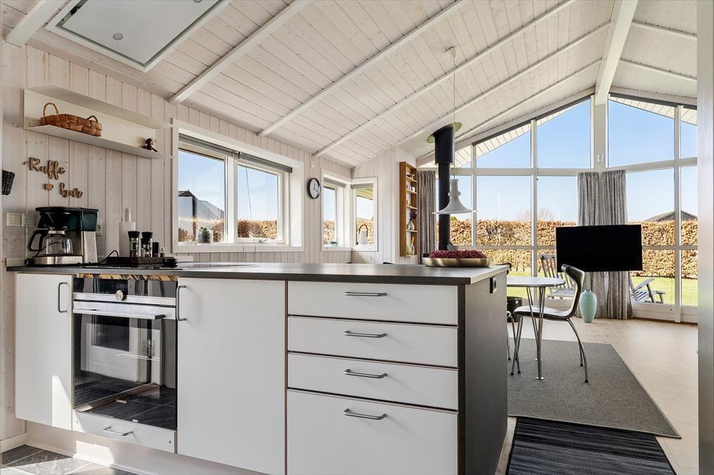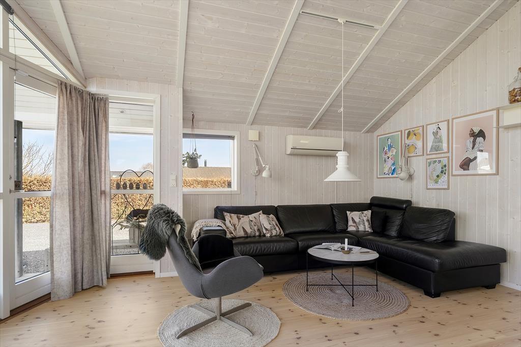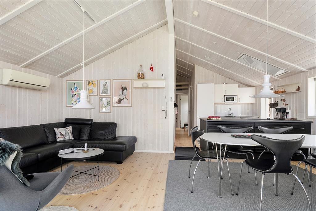 Når du træder ind i sommerhuset, mødes du af en lys og imødekommende atmosfære med loft til kip og store vinduespartier, der lader lyset strømme ind. Indretningen er hyggelig og funktionel – her kan hele familien samles om madlavningen i det åbne køkken, mens snakken går ved spisebordet. Stuen indbyder til afslapning med bløde møbler og et dejligt kig ud til den grønne have. Badeværelset er et kapitel for sig: Her kan du sænke skuldrene i spaen efter en frisk gåtur langs stranden eller en stille stund på terrassen. Huset er skabt til ro og nærvær – og til at give dig den ferie, du længes efter.