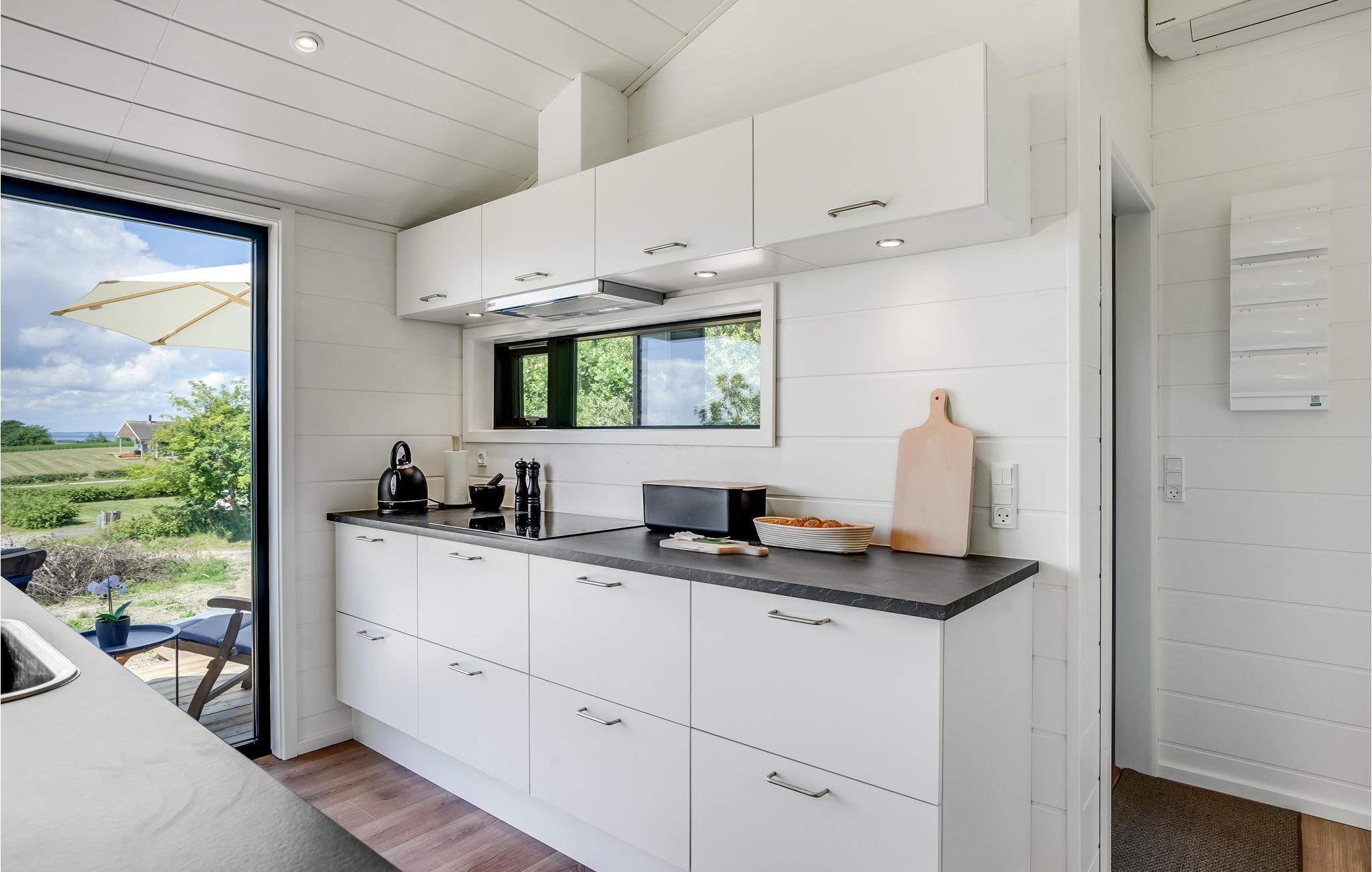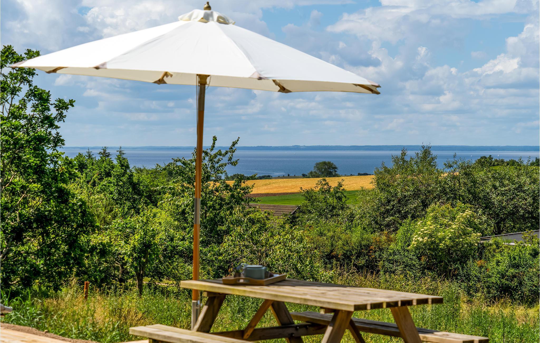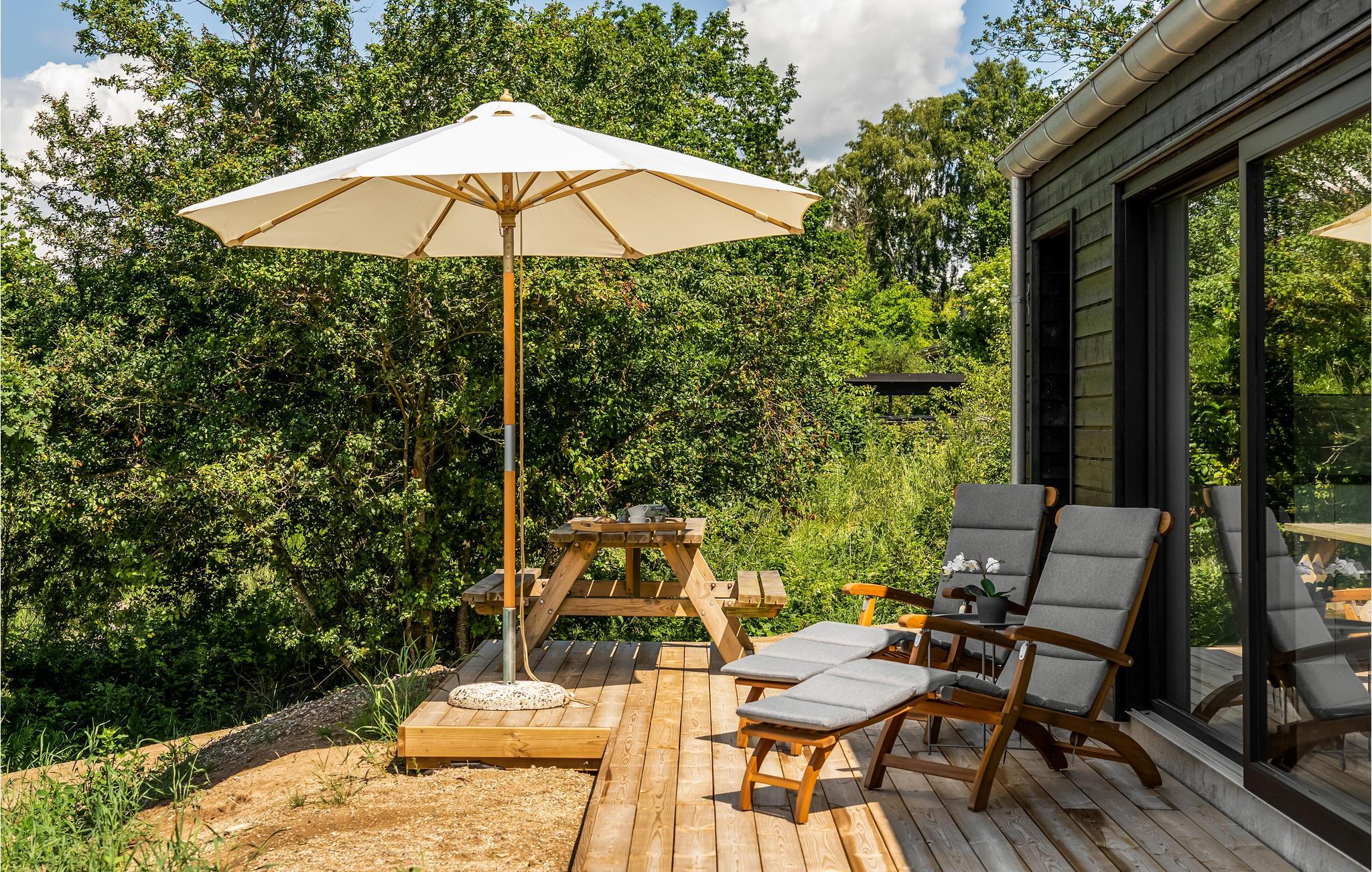 Moderne sommerhus med havudsigt, træterrasse og hyggelige hjørner nær Fuglsø Strand.
